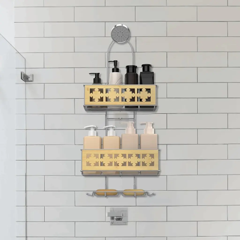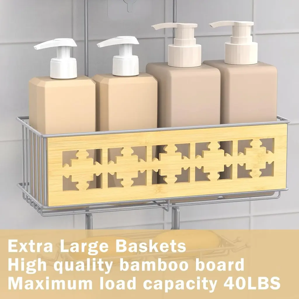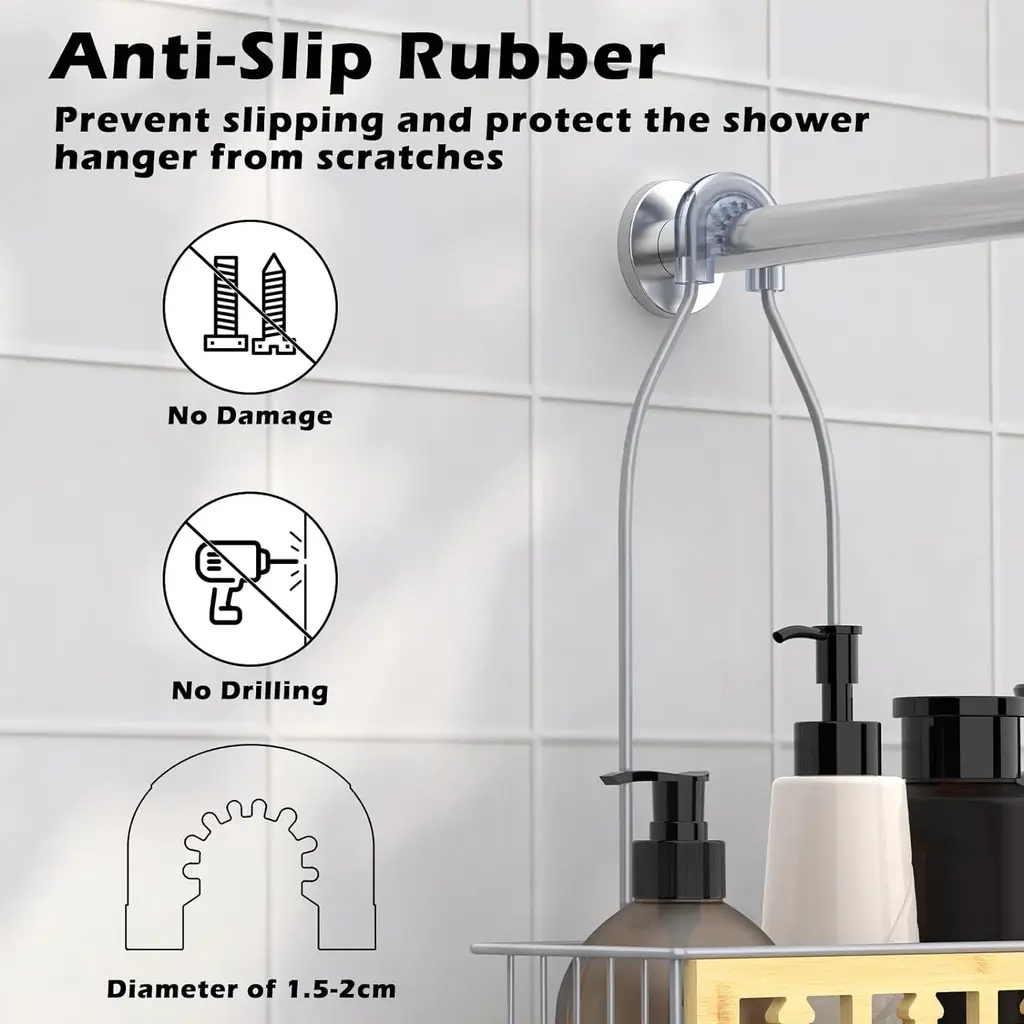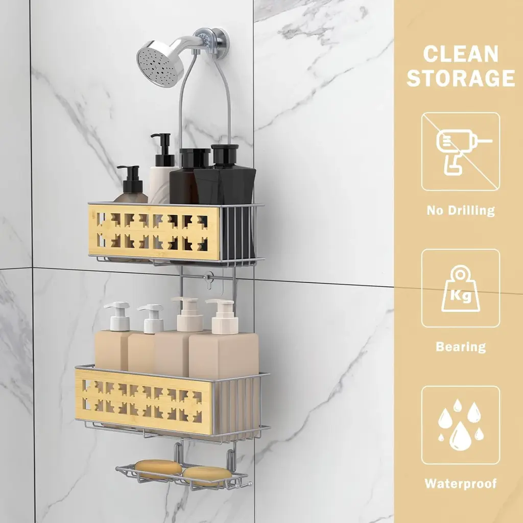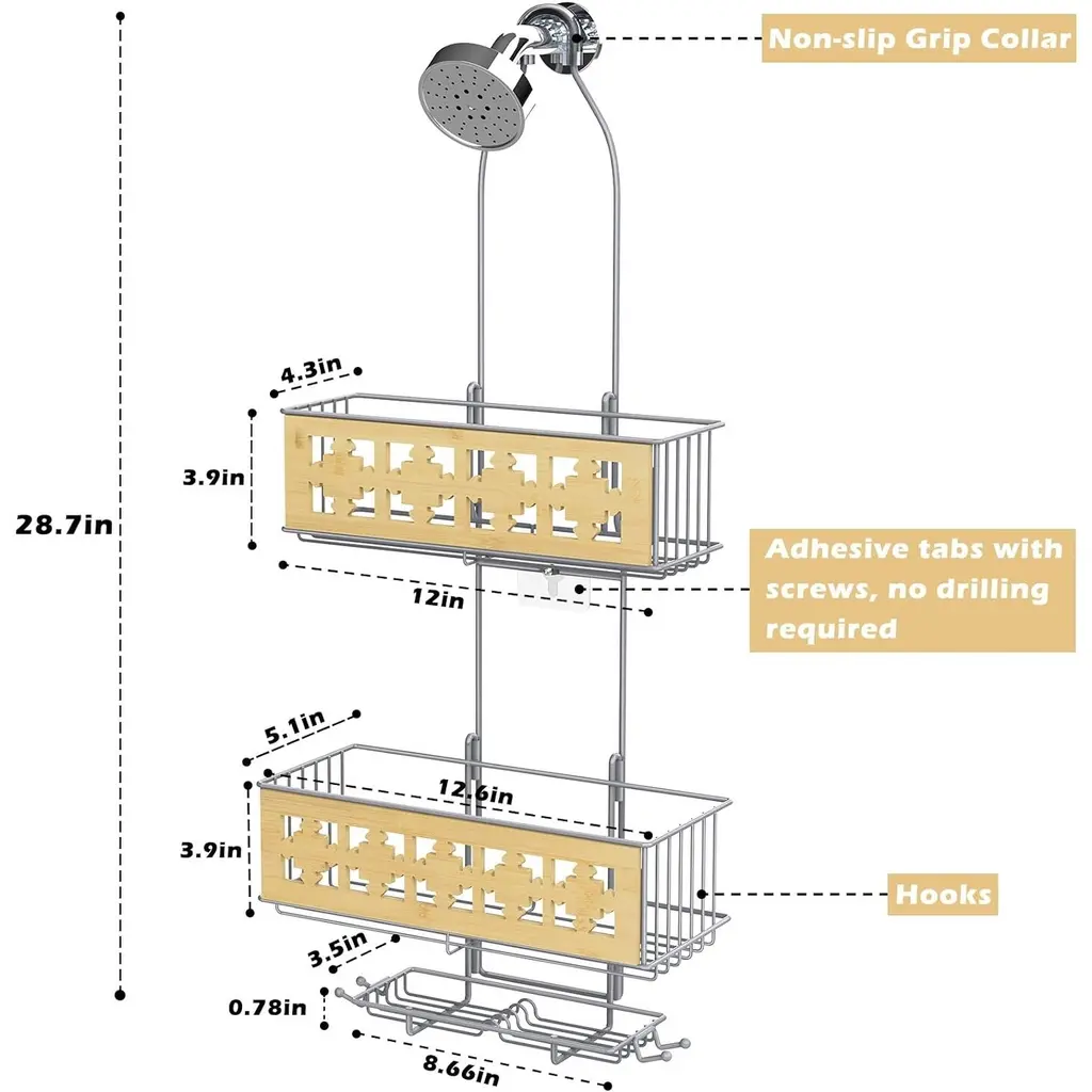 【With hooks & Large Capacity Shelves】This sleekly hanging shower organizer with 2 tiered design. Two layers can be used to place various shower gels and shampoos, and the lower layer has a soap holder specially designed for placing soap. Equipped with anti-slip rubber and strong adhesives, our shower racks hang firmly grips the wall, so it will not fall easily. There are also hooks designed for storing razors, bath balls, and towels. 【Rustproof & Fast Draining】The waterproof shower shelf organizer is not only rust-proof but also long-lasting in wet environments. Hollow and open bottom wire design helps water dry quickly keeping the bathroom clean and fresh, maintaining your health and safety. 【Stable & Easy Assembly】Uniquely designed to fit most standard sized shower heads and can be installed in minutes without drilling or other tools. The adhesives do hold the shower cassette in place and secure the cassette to the shower door. over the shower head caddy did provide enough cushioning at the point of contact to keep the glass in our shower safe. 【Size & Unique Design】The height of the whole hanging shower organizer is suitable for the vast majority of bathrooms, and can make your toiletries within reach. Classic size:5.1"D x 12.6"W x 28.7"H. With a load capacity of up to 40 pounds, it can perfectly solve your storage need