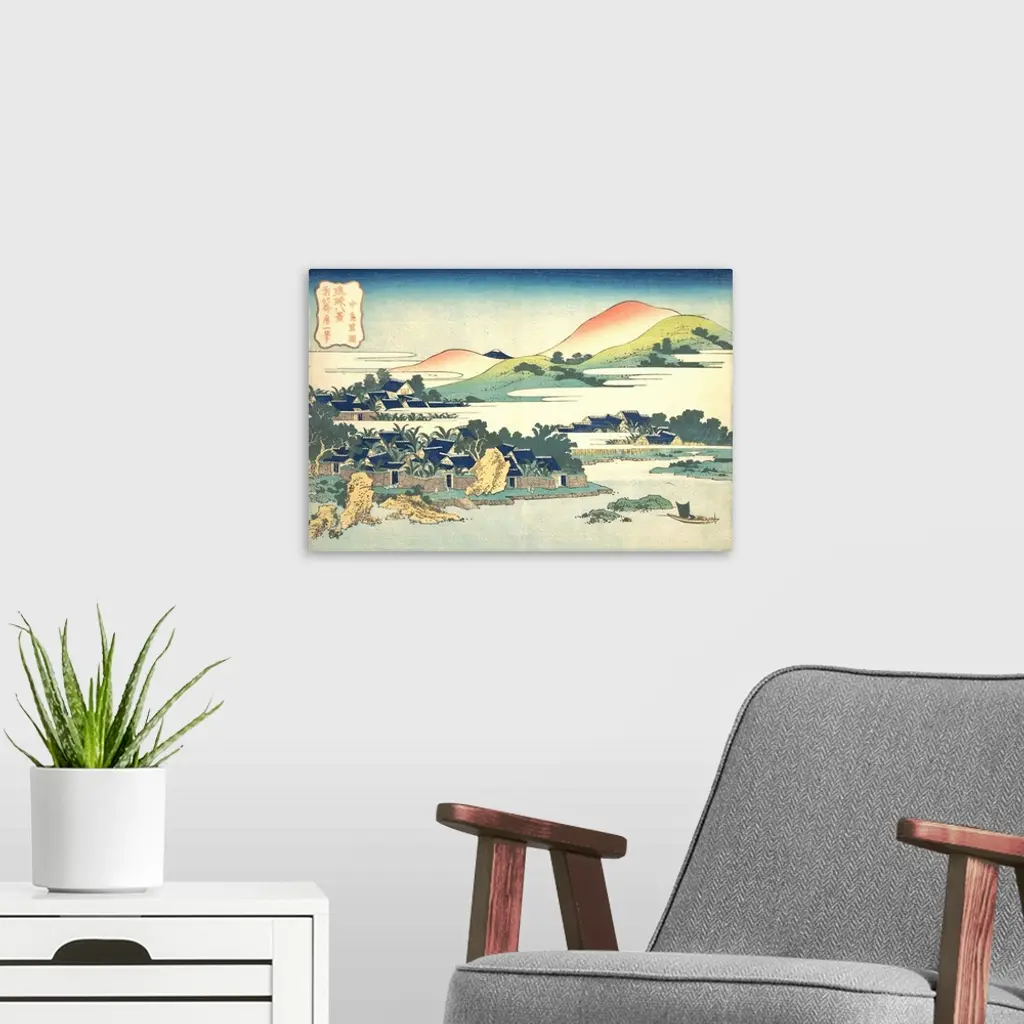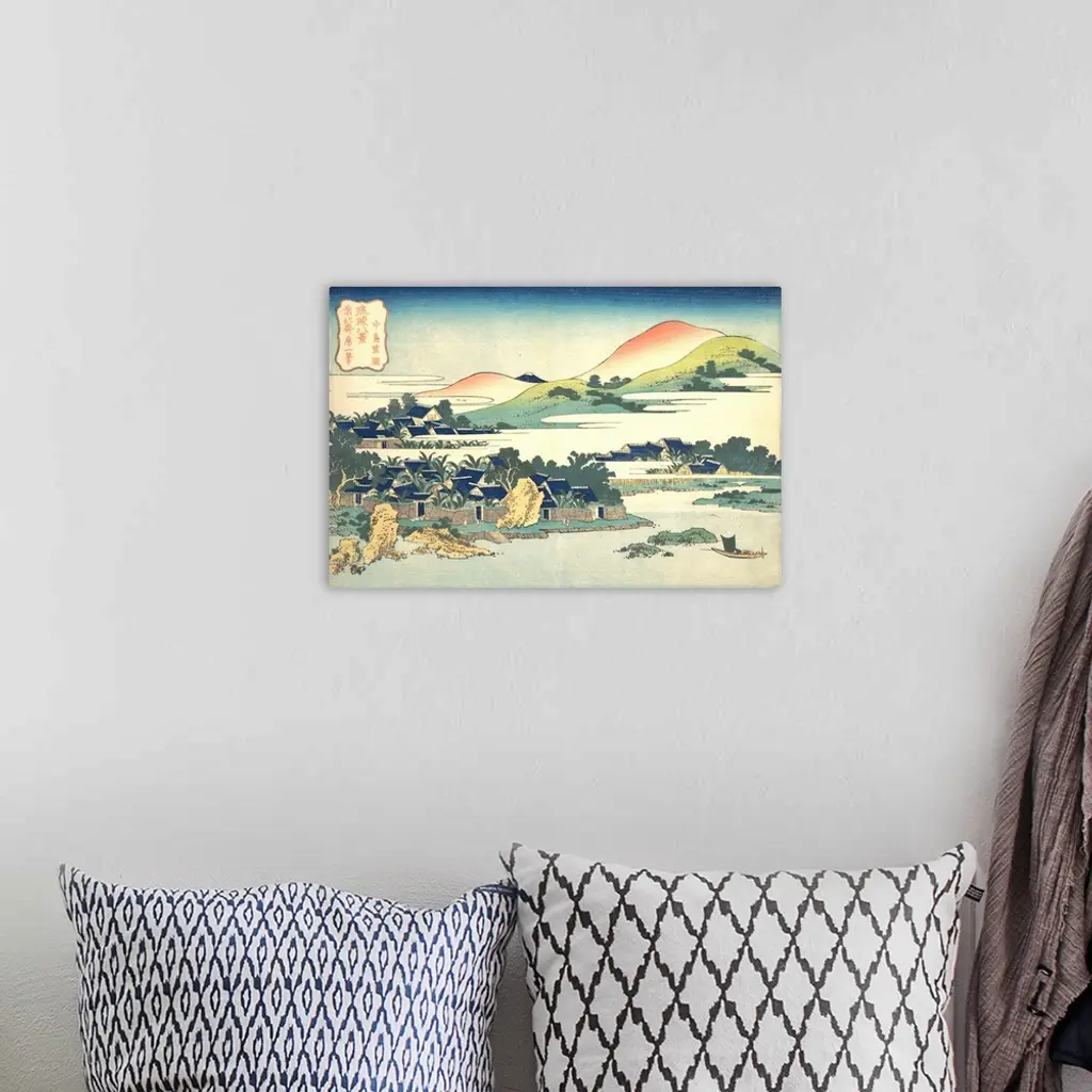Hokusai's prints of the Ryukyu were probably made to commemorate the Ryukyu mission's arrival at Edo in November 1832. Although the original gazetteer that inspired Hokusai was in black and white, his series is in exquisite color. We can see not only his use of color to heighten the exotic ambiance of the Ryukyu Islands, but also his imaginative power to make alien islands familiar in the guise of Eight Views. The artist carefully selected representative elements of the Eight Views, such as moon, sailboats and snow.