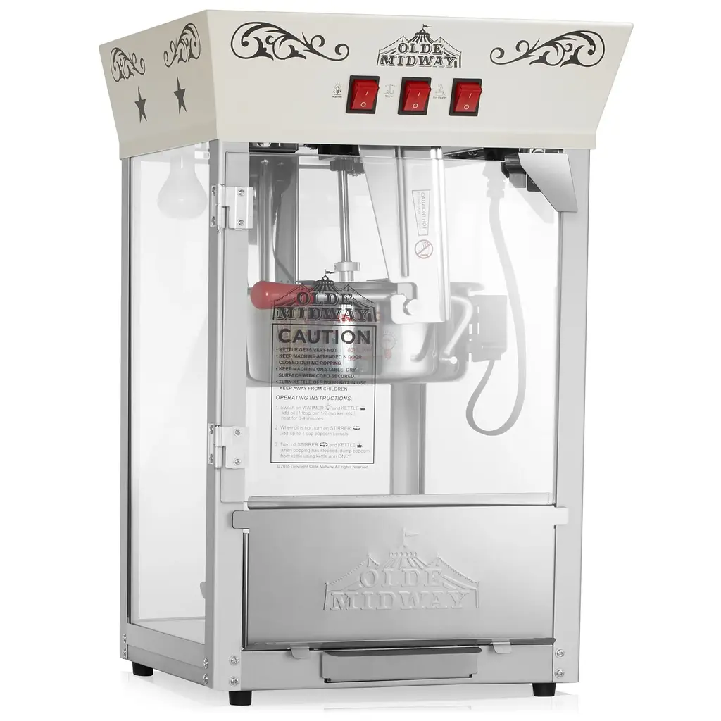 Top quality: Fashioned with authentic antique style and updated with modern features, this attractive popcorn machine offers visual appeal and lasting durability. Constructed of heavy-duty stainless steel, a whisper-quiet motor, 640 watts of power, and premium paint with a glossy finish, this machine's industry-leading 4-oz. kettle serves up to 2 gallons of popcorn per batch.Convenient 2-switch design: Operation is simple with a 2-switch design, making popping fast and convenient. Switches include a spot light warmer, stirrer with pot heater.Tempered safety glass: High-quality, tempered glass walls provide both protection and sturdiness, with superior resistance against scratching and warping. The popcorn machine is shipped in a double wall box and extra padding to ensure safe delivery.Warming deck and kernel tray: Built-in warming deck and heat light are just like a professional-grade popcorn machine, keeping popcorn warm and fresh. This machine also features an olde maid's reject kernel tray for any loose un-popped kernels, ensuring every batch is perfectly popped.Includes stainless steel popcorn accessories: Olde Midway's popcorn machine comes with stainless steel accessories, including a 1/2 cup measuring cup, tablespoon, popcorn scoop, and salt shaker. Enjoy making gourmet, movie-theatre style popcorn anywhere with the Olde Midway 4-ounce antique style tabletop popcorn machine. Offering nostalgic charm with a retro-style design, this premium-quality popcorn popper is equipped with completely modernized features for convenient, easy operation and lasting functionality. Ideal for adding novelty at school and church fundraisers, carnivals, businesses, parties, little league and varsity games, home movie theatres, and much more, this 4-ounce kettle can produce about 2-gallons of popcorn per batch to satisfy large crowds. Makes a great gift for movie buffs. Constructed of highly durable materials including heavy-duty powder coated steel and stainless steel food zones, tempered safety glass walls, vibrant, richly pigmented premium paint, and a powerful, commercial-quality motor, this deluxe popcorn machine is built to last. Convenient 2-switch operation includes a spotlight warmer, stirrer, and pot heater. The machine includes a warming deck and heat light to keep popcorn fresh and delicious, as well as a drawer to catch any un-popped kernels for a perfect batch every time. Cleans easily with water, and runs on a US-standard 120 volt power cord for quick and easy setup almost anywhere. Includes: Olde Midway Popcorn Machine with 4 oz Kettle Stainless Steel Popcorn Accessories: 1/2 cup Measuring Cup, Tablespoon, Popcorn Scoop, and Salt Shaker (50) Popcorn Bags User Manual Minor assembly is required. Olde Midway is well-known within the industry for finely crafted, specialty appliances that combine stylish design with exceptional durability at a great value.