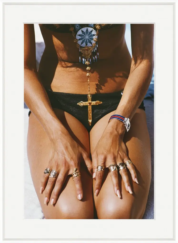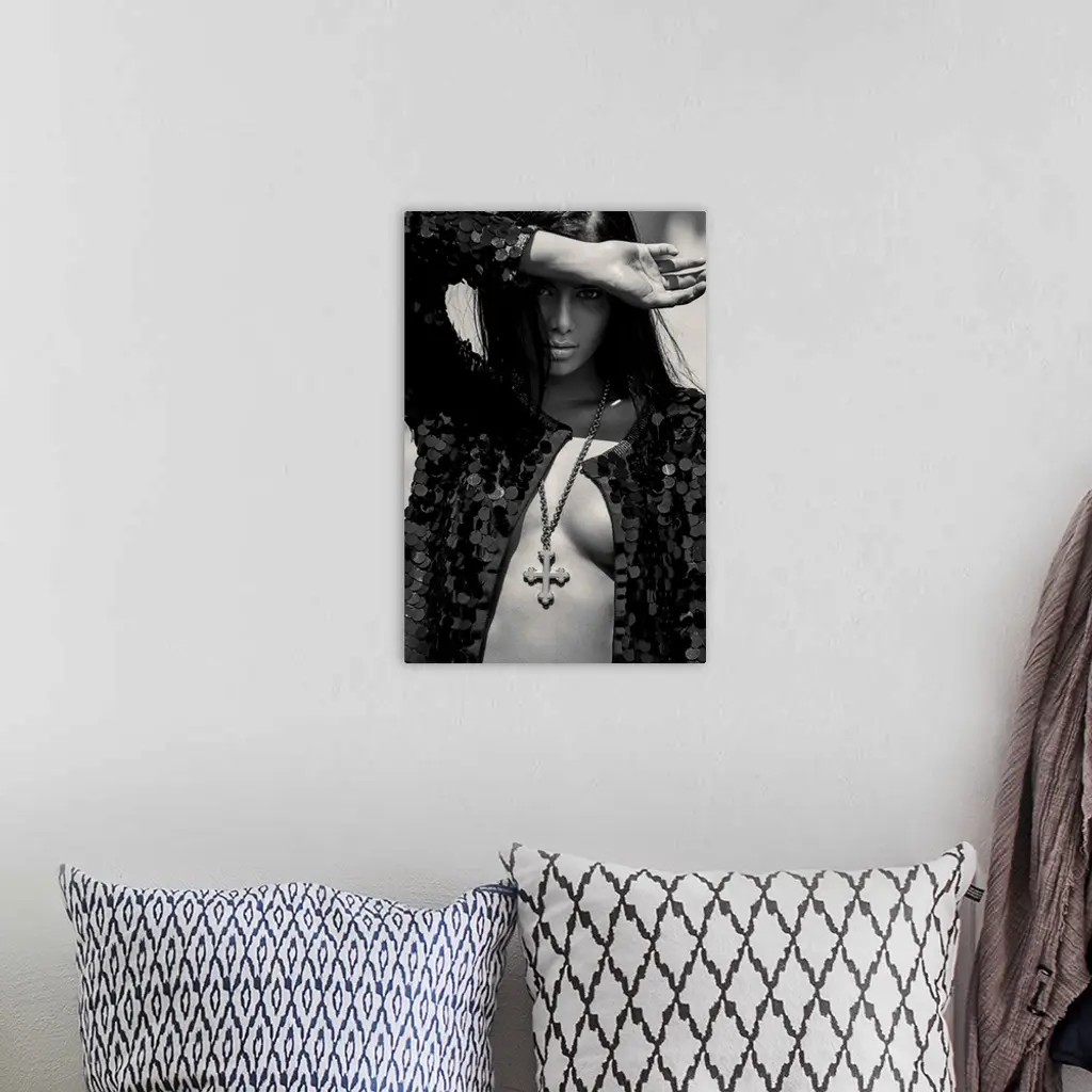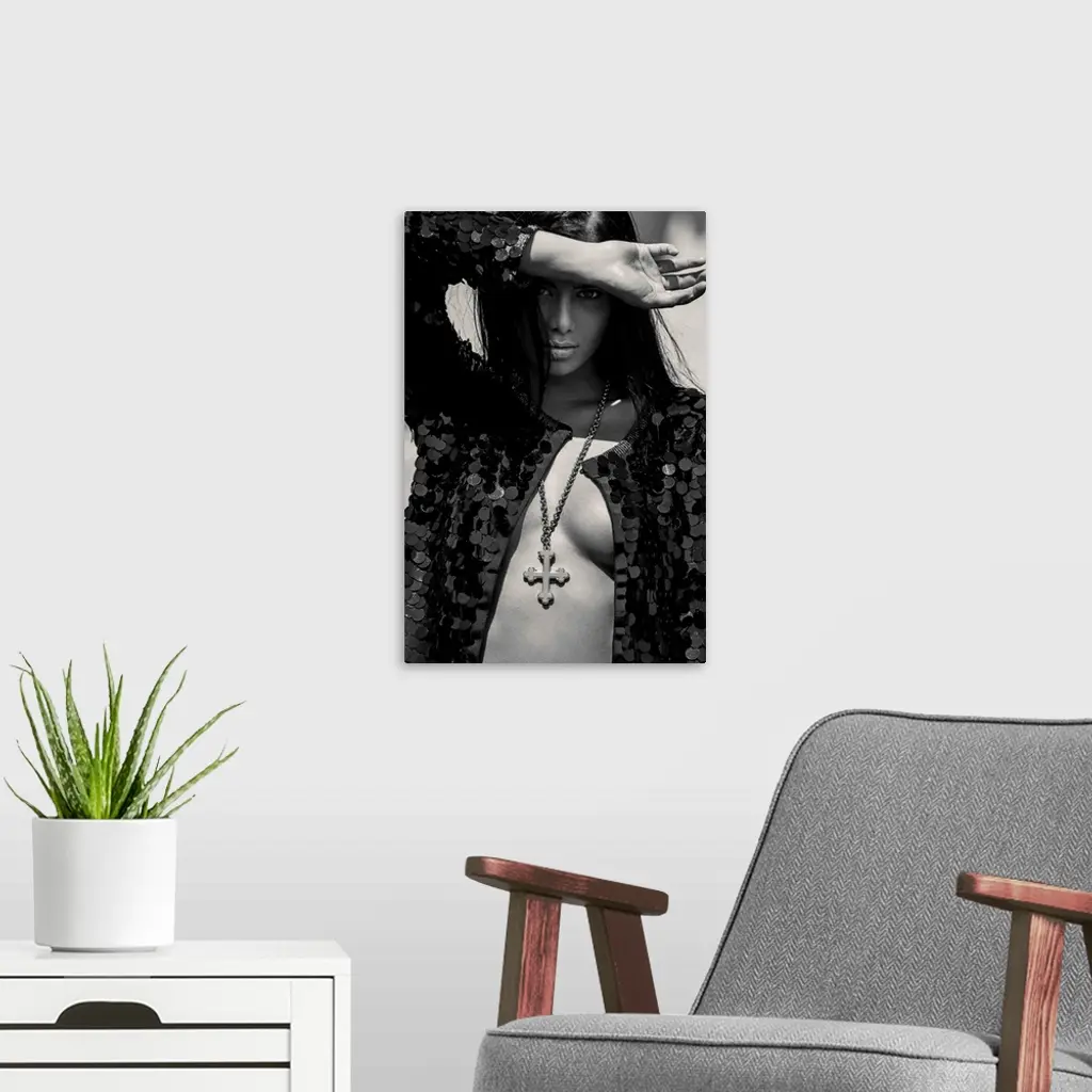 Black and white portrait of a nude woman wearing a black sequin jacket and a cross necklace.
