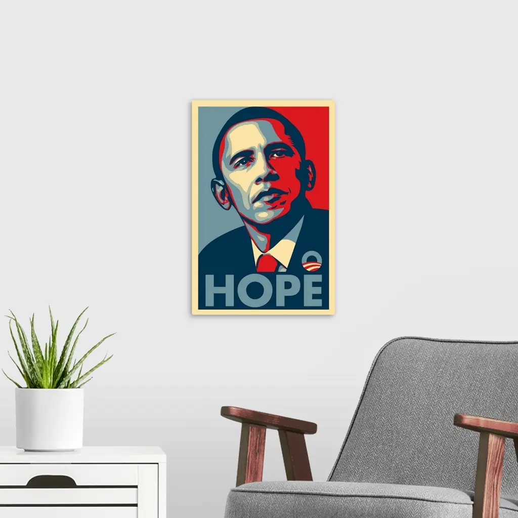 Iconic and optimistic block print portrait of senator Barack Obama made for the 2016 presidential election campaign, featuring the word "Hope"