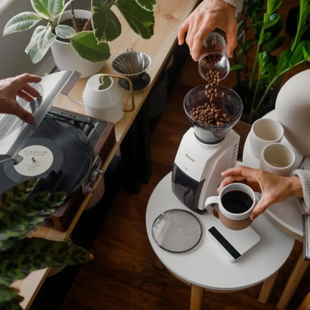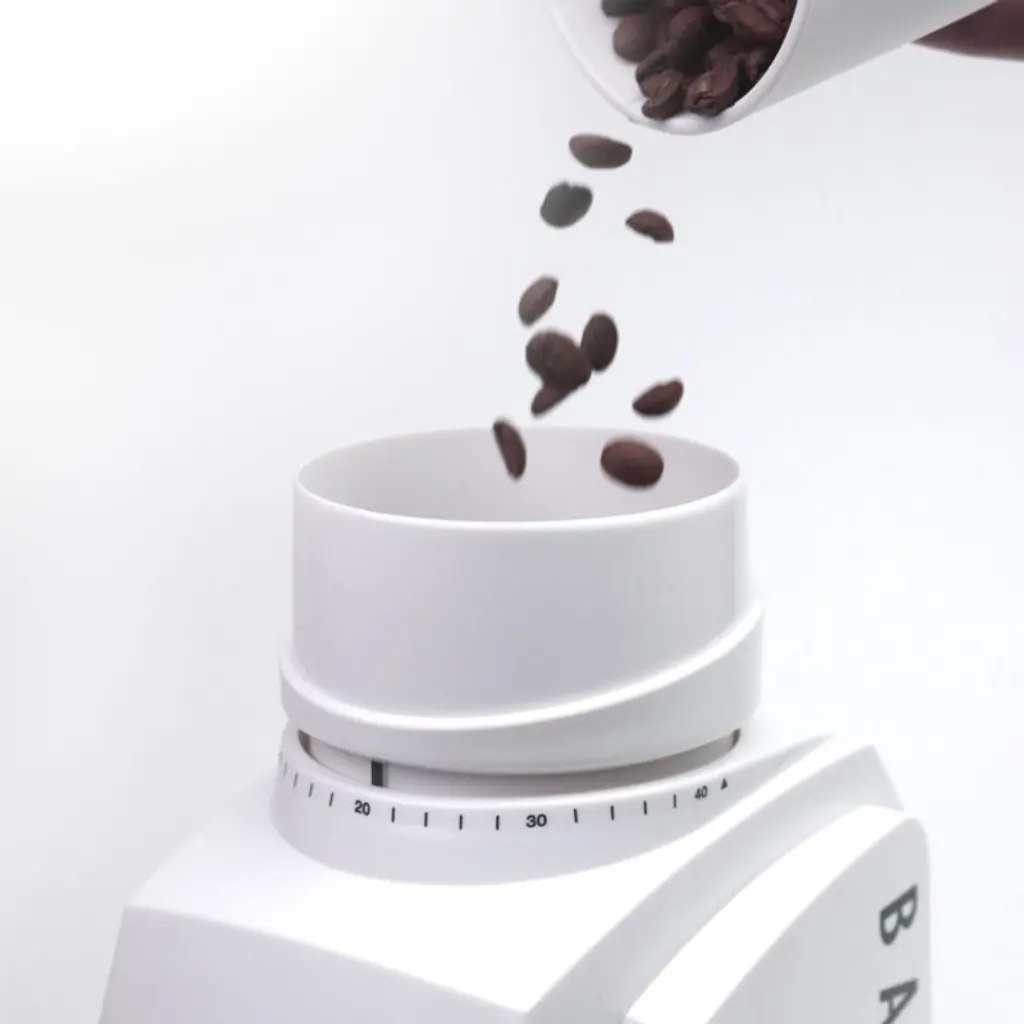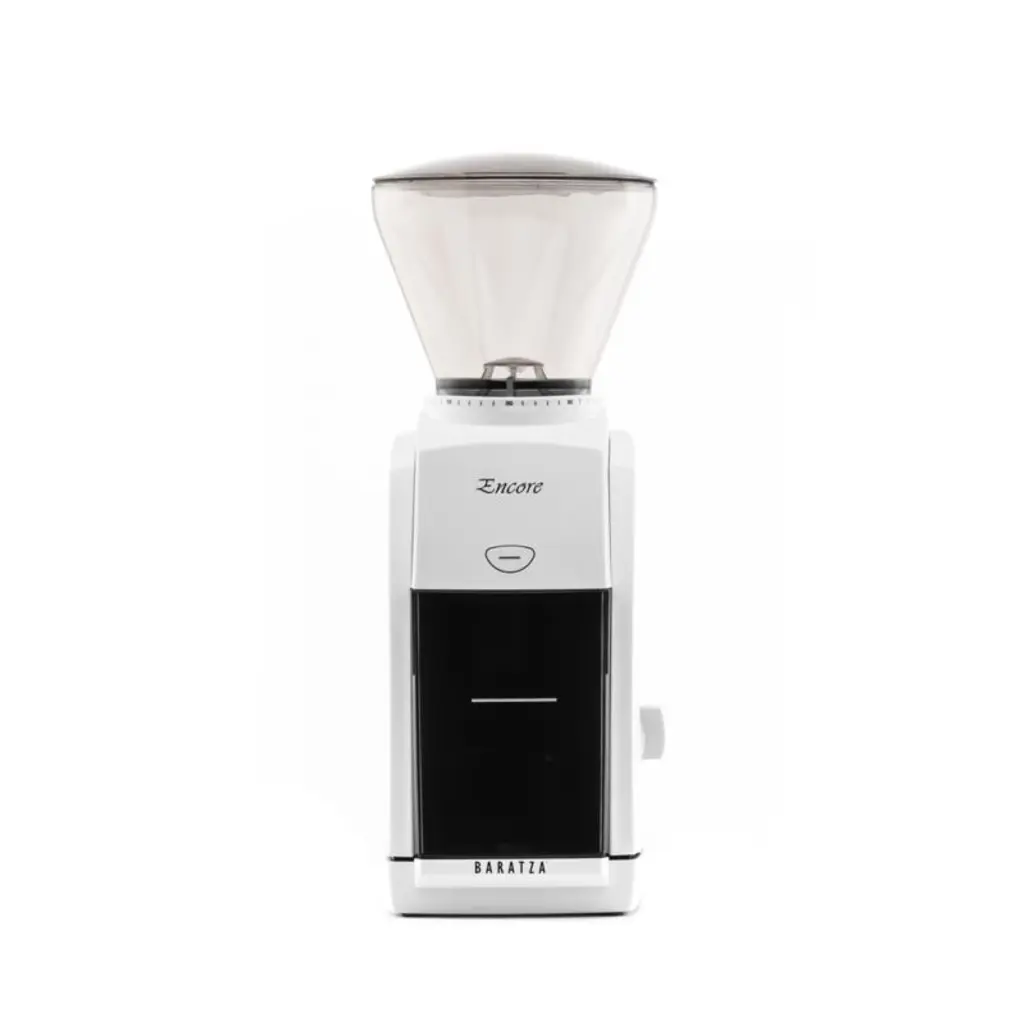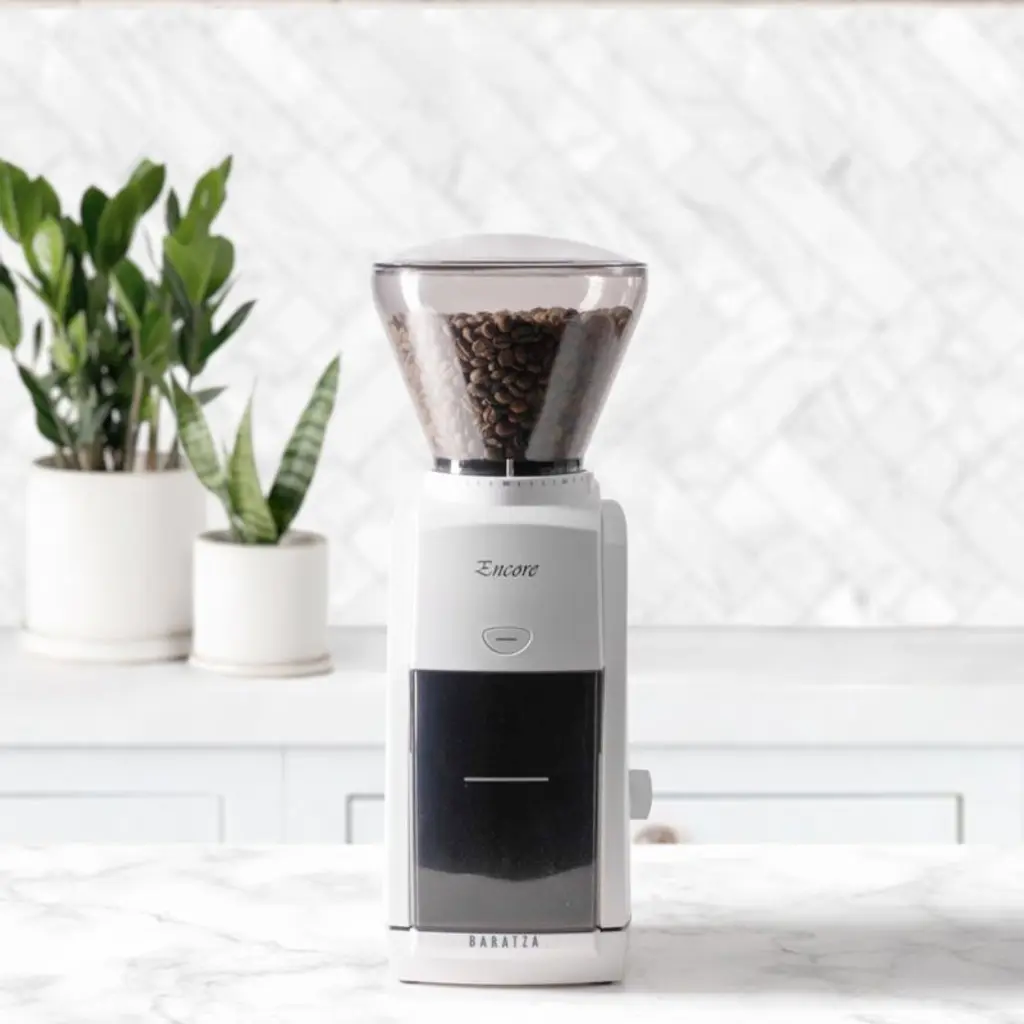 The Baratza Encore coffee grinder features precision-cut, commercial-grade steel burrs that produce a wide range of grind profiles perfect for everything from French press to pour-over to espresso. Adjustable to 40 different levels of coarseness and fineness, this state-of-the-art coffee grinder has a powerful, high-torque motor that turns slowly for cool, quiet operation and won't heat up beans. Clad in bright white with black accents, the burr grinder has a crisp presence on your countertop or coffee cart.