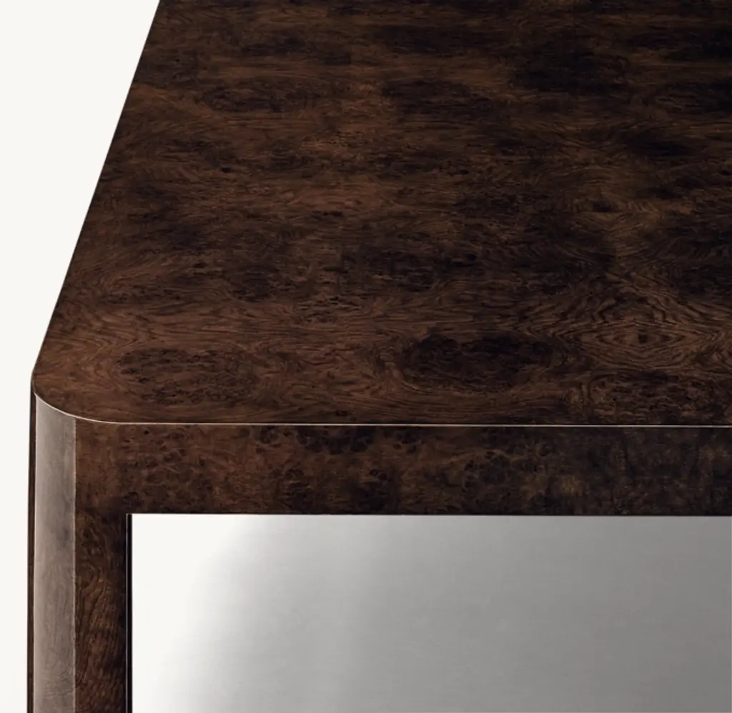 Understated and tailored in its restraint, our collection honors the minimalist geometric forms of 1970s postmodernism and the era's embrace of exotic materials. The clean, gently curved silhouettes are wrapped in burl wood veneers, which highlight the intricate, swirling grain patterns and mottled shading. Expertly cut and pieced by hand, the burl is sanded and buffed to an elegant sheen. SHOP THE ENTIRE COLLECTION