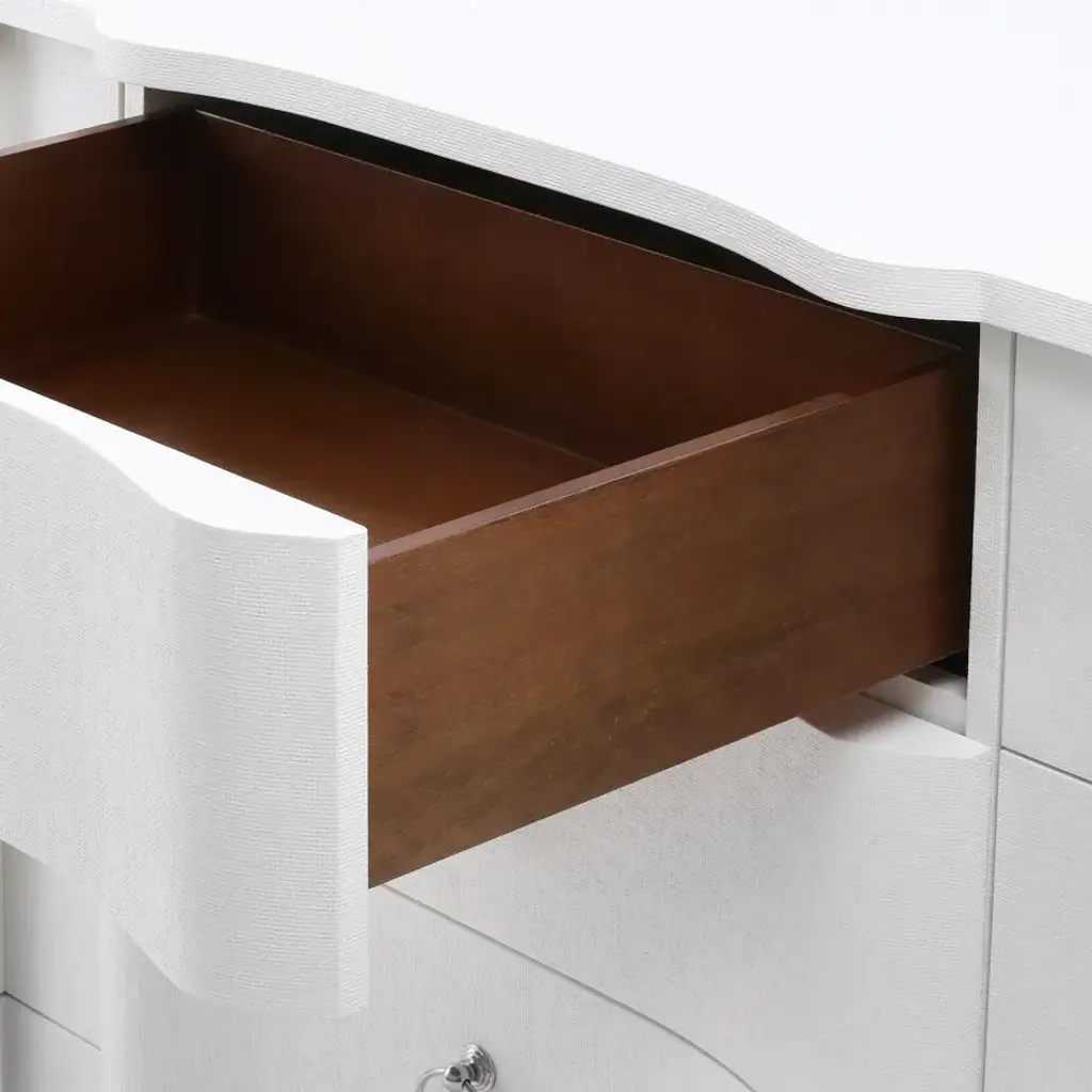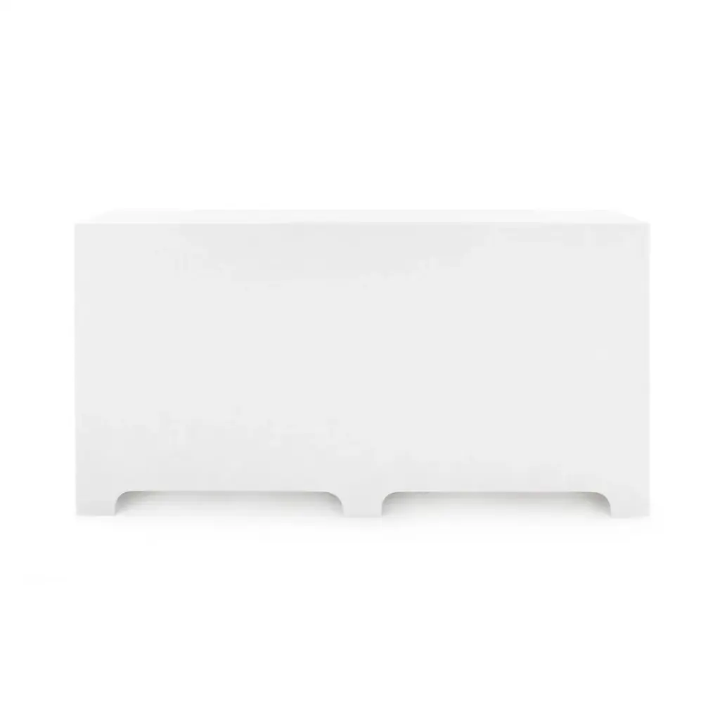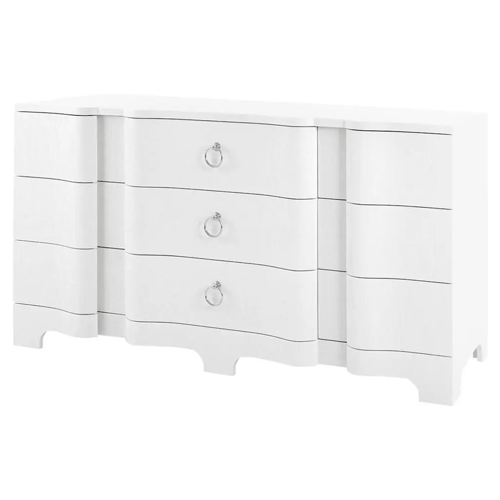 Sweeping serpentine curves give the classic pieces of the Bardot Collection a truly unique touch of surrealism. A tasteful play on form, the facade of our Bardot Extra Large 9-Drawer evokes a sense of fluid movement, with drawers expertly crafted to resemble rippling waves. Its Art Deco-inspired glamour is furthered by its polished nickel pulls, while the full sense of its quality can quite literally be felt in the outer layer of lacquered grasscloth. From its natural texture to its soft coloring, this lovely furnishing is made to withstand the test of time in both craftsmanship and aesthetic. For while it certainly stands out, you’ll find that it feels right at home in any style of decor.