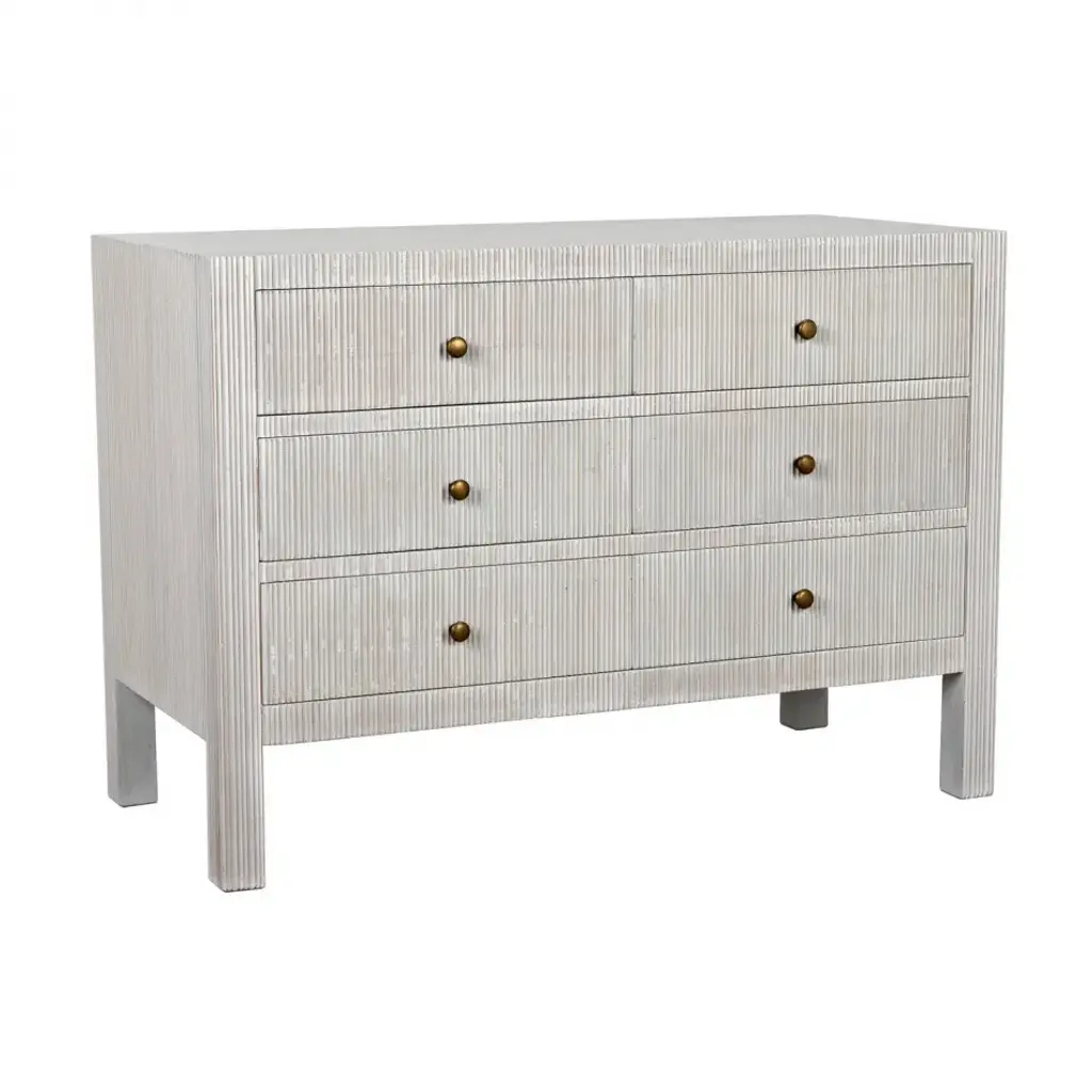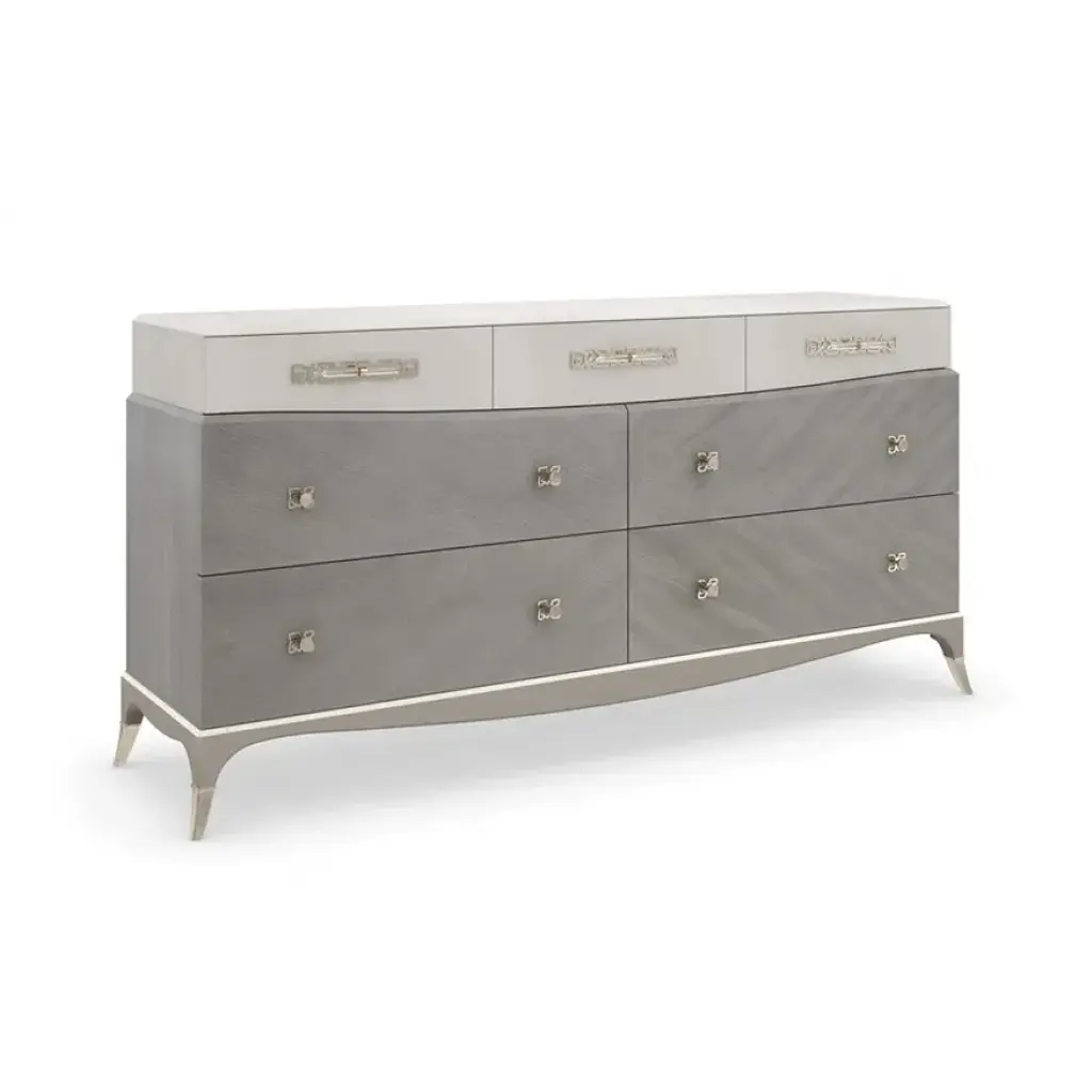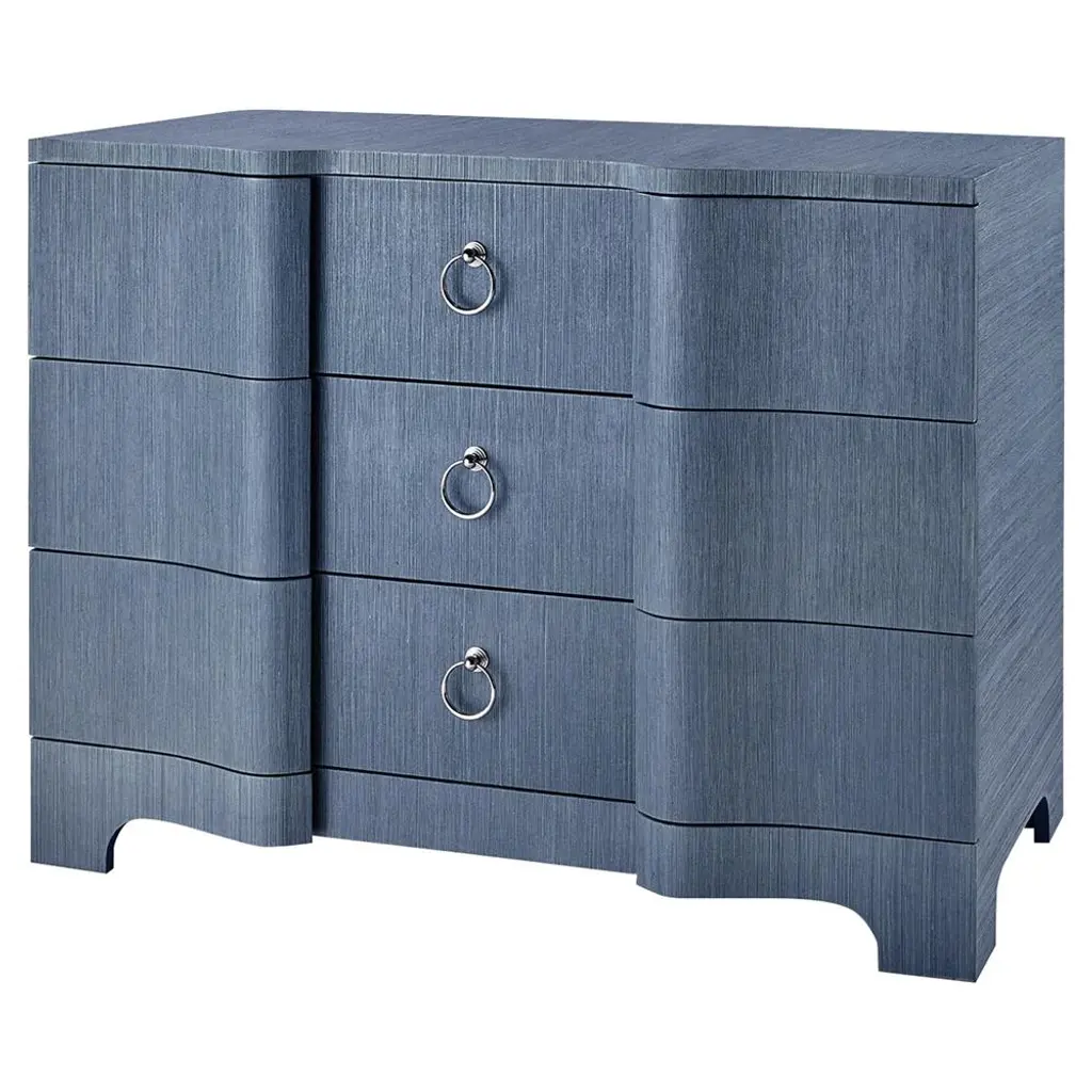 Sweeping serpentine curves give the classic pieces of the Bardot Collection a truly unique touch of surrealism. A tasteful play on form, the facade of our Bardot Extra Large 9-Drawer evokes a sense of fluid movement, with drawers expertly crafted to resemble rippling waves. Its Art Deco-inspired glamour is furthered by its polished nickel pulls, while the full sense of its quality can quite literally be felt in the outer layer of lacquered grasscloth. From its natural texture to its soft coloring, this lovely furnishing is made to withstand the test of time in both craftsmanship and aesthetic. For while it certainly stands out, you’ll find that it feels right at home in any style of decor.