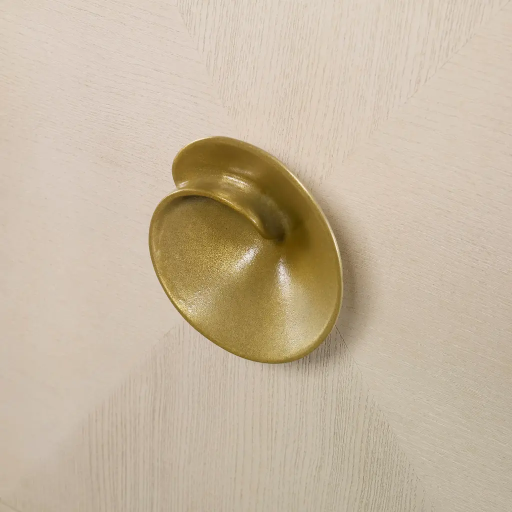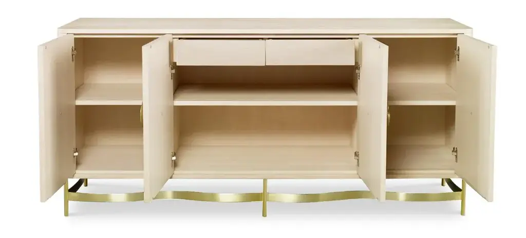 The Bardot credenza features beautiful hand sculpted brass hardware in the shape of a blooming flower with complementing curving brass base. The credenza is crafted of Ash and Beech solids in a light finish. Two center doors open to reveal two drawers above a one adjustable shelf. The side doors open out and each also feature one adjustable shelf. Assembly Required? No Care Instructions: Dust with a soft, clean cloth slightly moistened with water, and dry completely with another clean cloth, always rubbing with the grain.