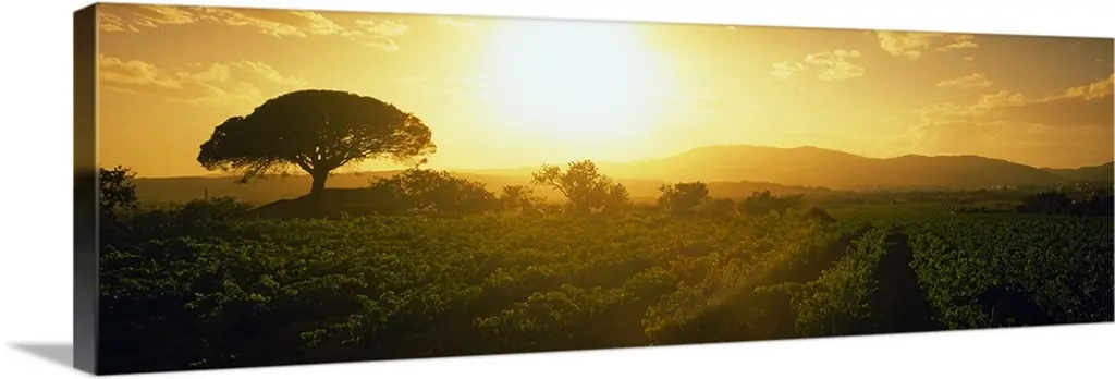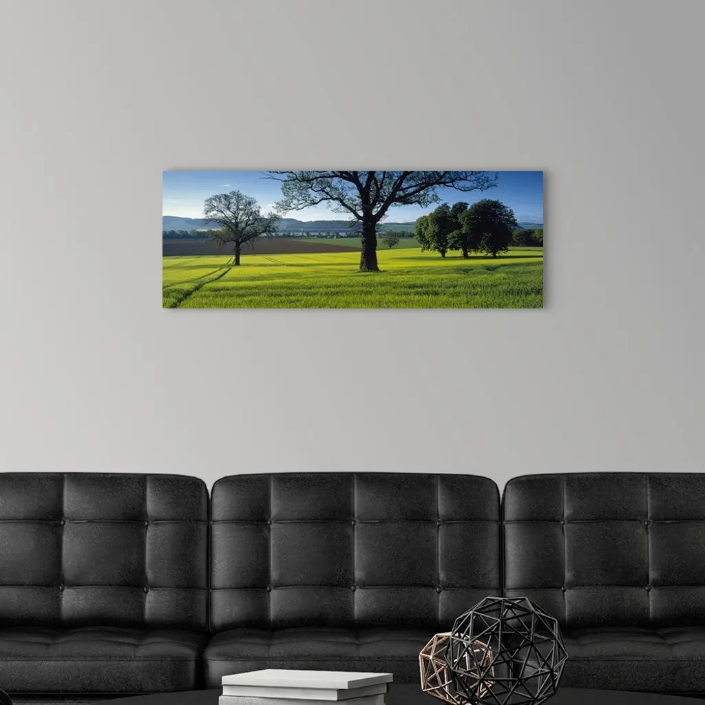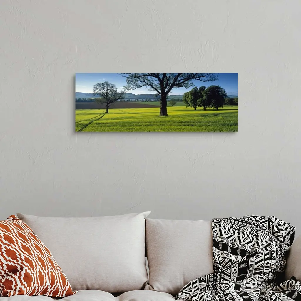 Panoramic photo on canvas of a field of grass with trees sprinkled throughout and rolling hills in the background.