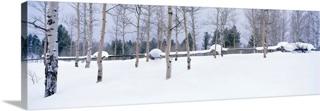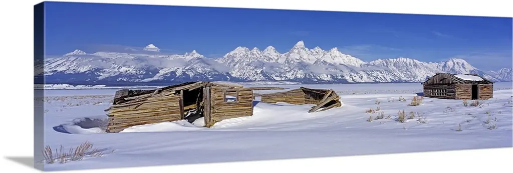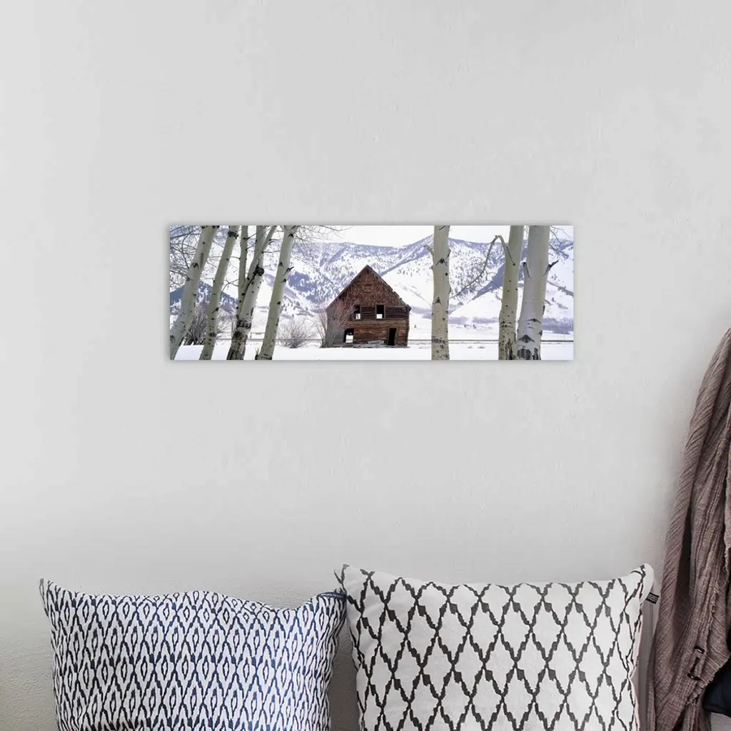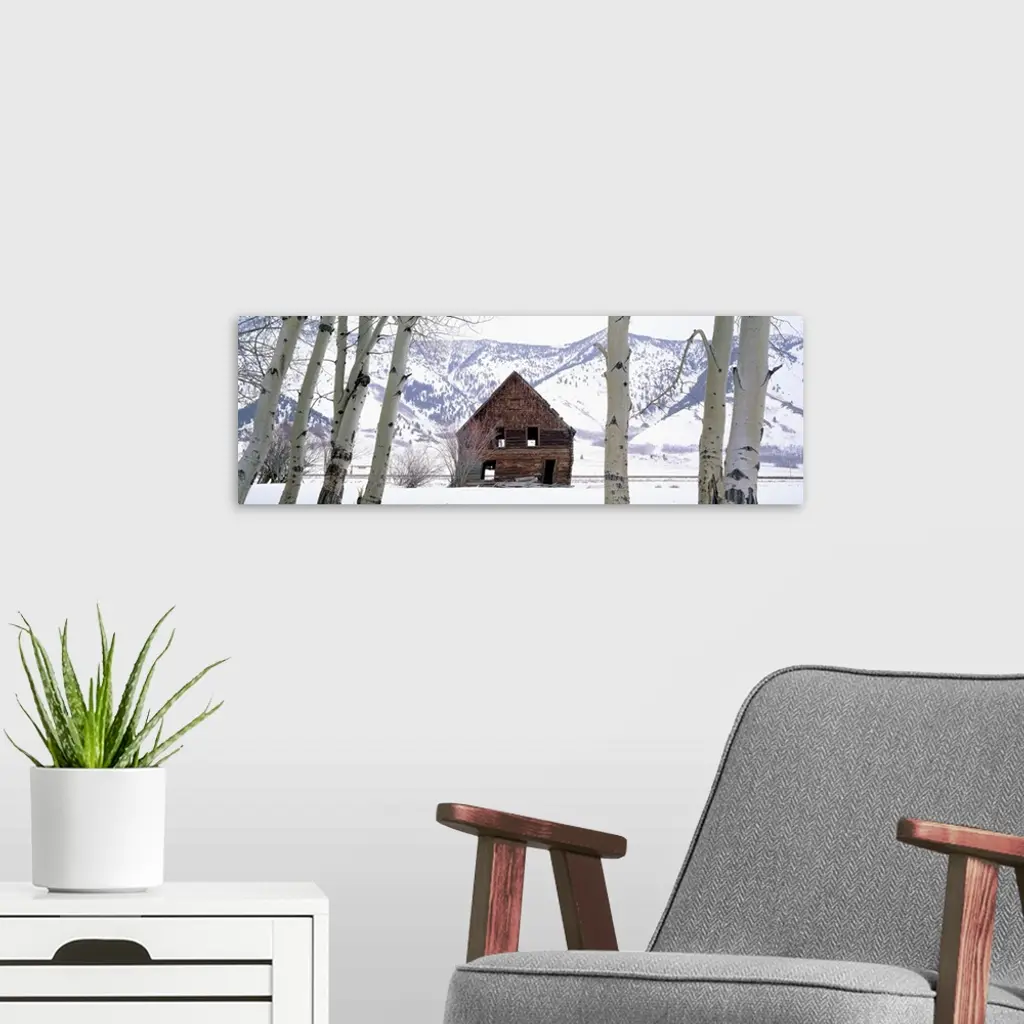 This wall art is a panoramic photograph of decrepit barn in a snowy valley.