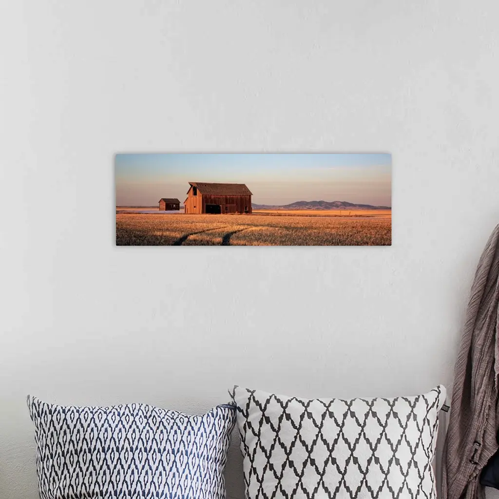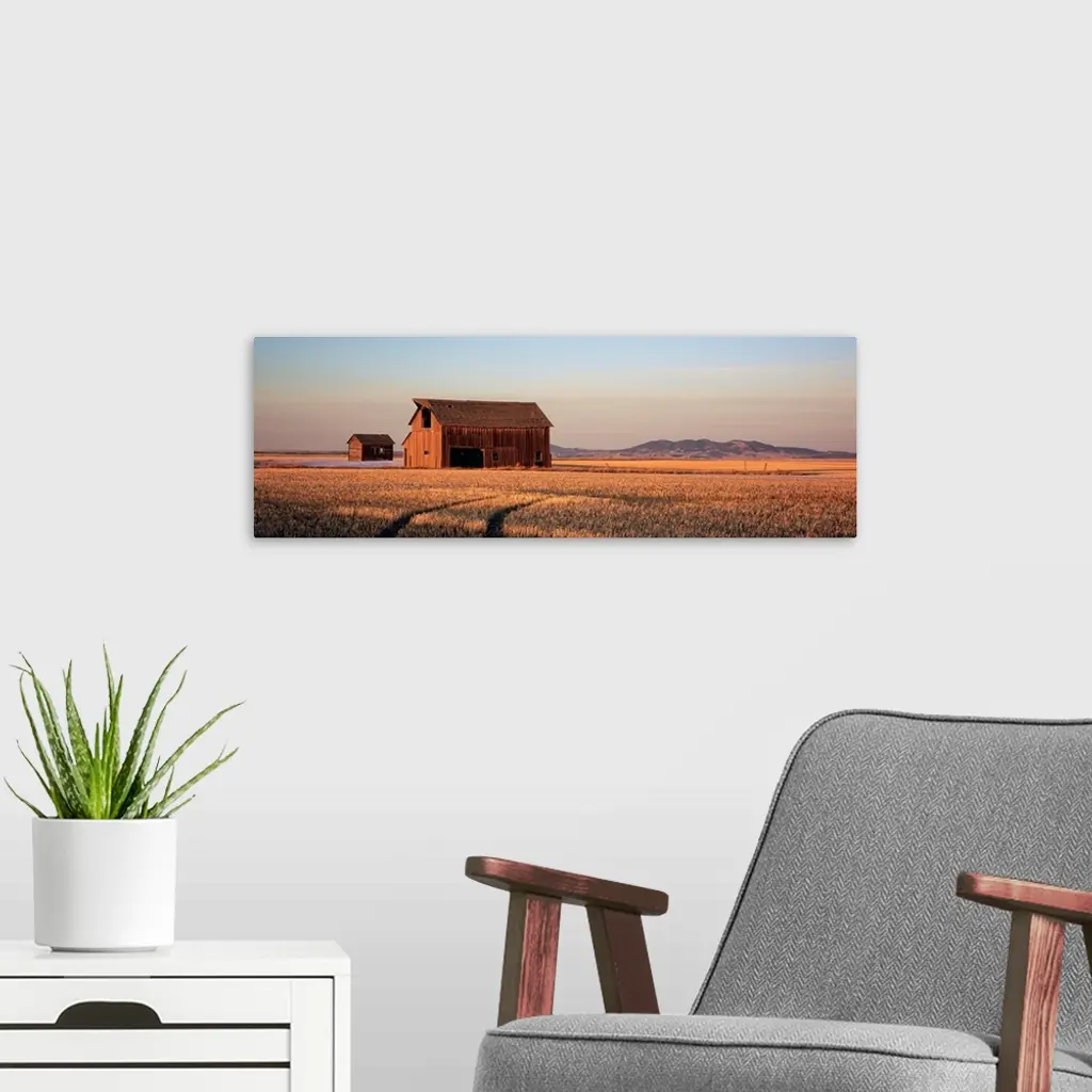 Panoramic photo of an old wood slat barn in the middle of a wide open field with the sun casting shadows as it sets.
