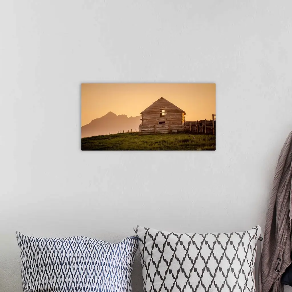 Warm photograph of an old wooden barn on a hilltop with a silhouette of mountains in the background.