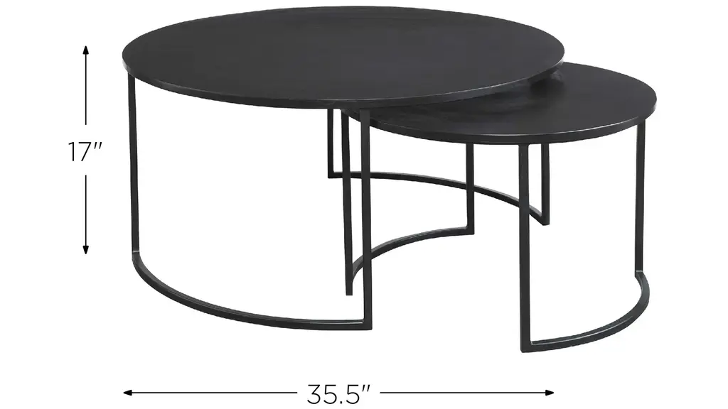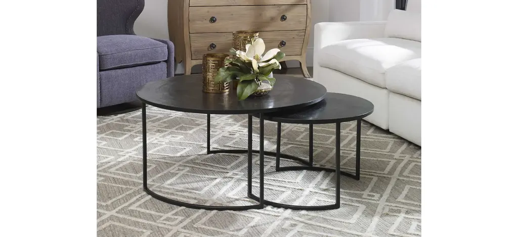 With modern minimalist styling, these Barnette Nesting Coffee Tables feature textured cast aluminum tops in an oxidized black finish, on aged black forged iron bases.