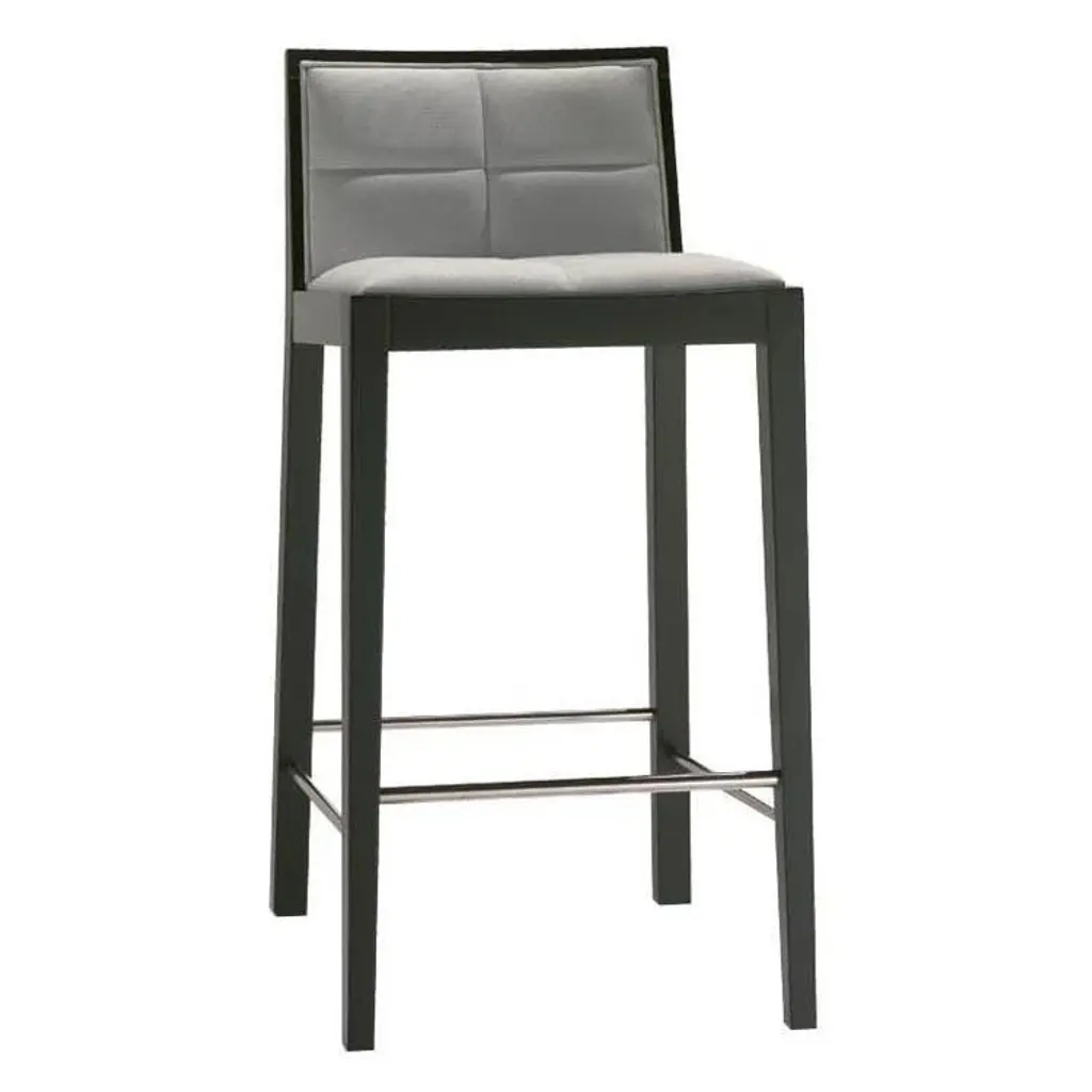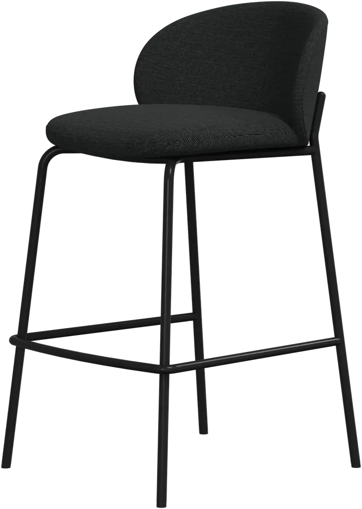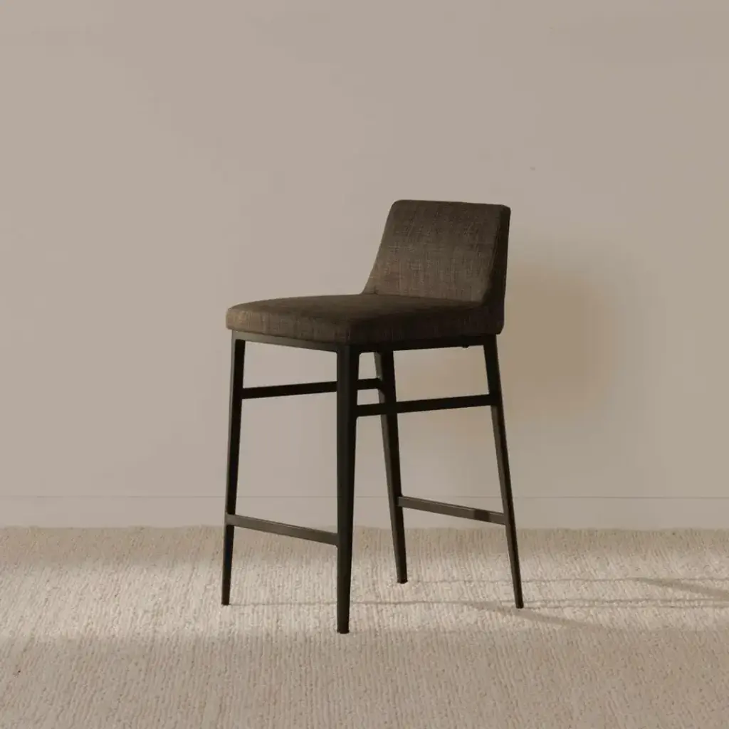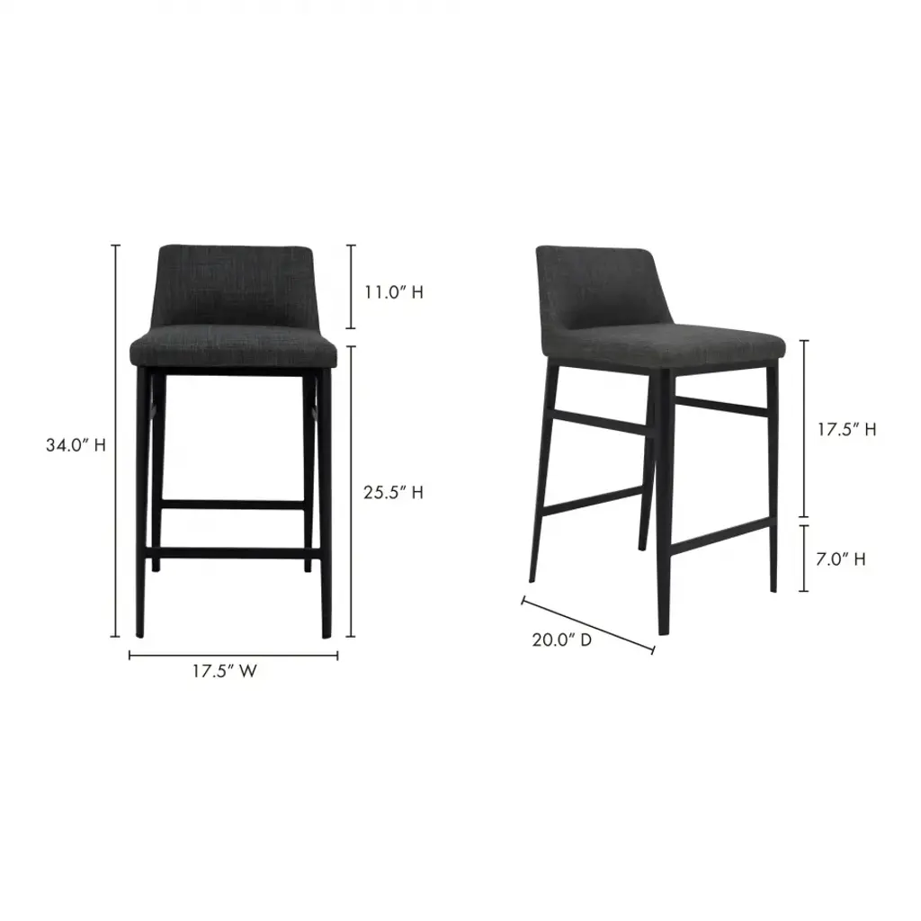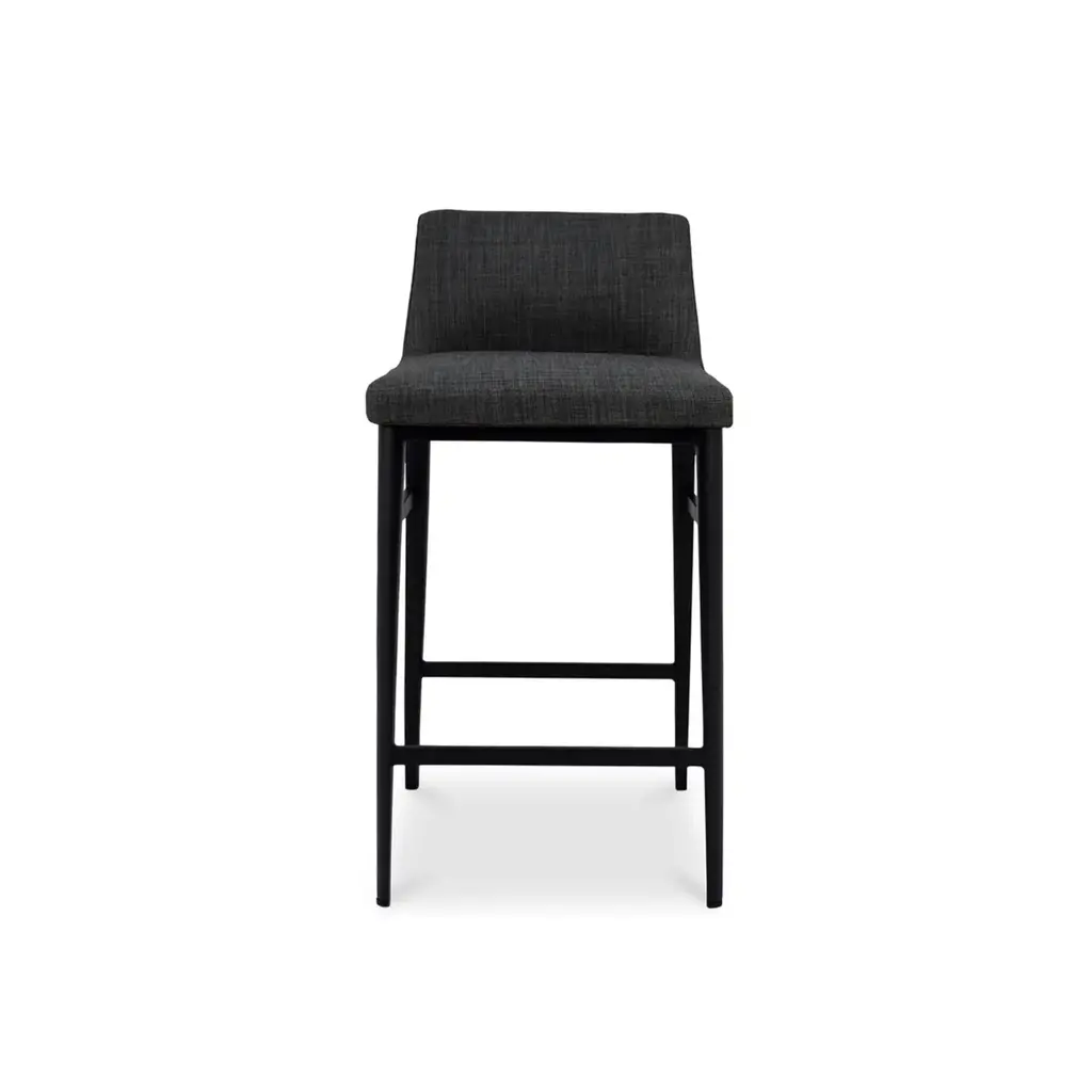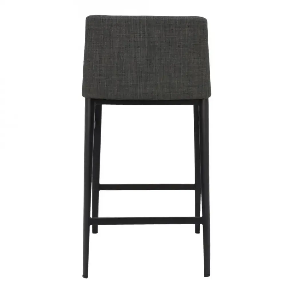 Modern and minimalist, the Baron counter stool's low-backed design and sleek profile add visual appeal with a compact aesthetic, fitting seamlessly into any dining or kitchen area. Fabric upholstery, powder-coated steel base, and footrest deliver a plush and comfortable seating experience with class and convenience.