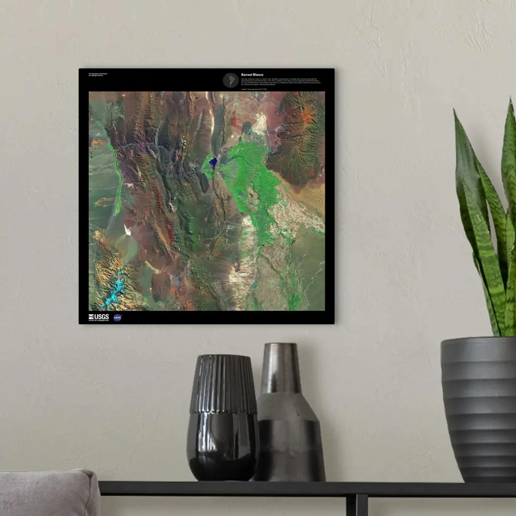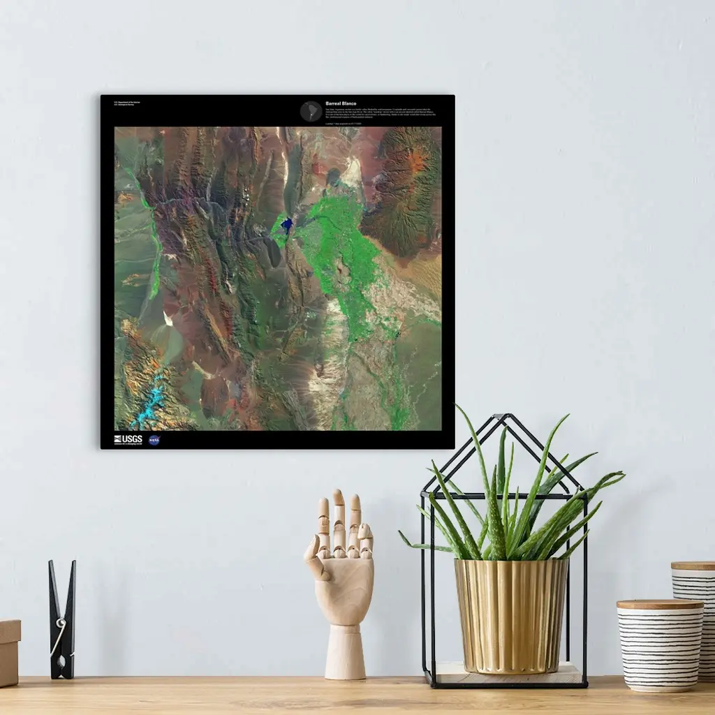 San Juan, Argentina, nestles in a fertile valley flanked by arid mountains. Croplands and vineyards (green) abut the metropolitan area on the San Juan River. The white teardrop (lower left) is an ancient lakebed called Barreal Blanco. It is one of the best places in the world for carrovelismo, or landsailing, thanks to the steady winds that sweep across this flat, unobstructed expanse of hard-packed sediment. March 17, 2003.