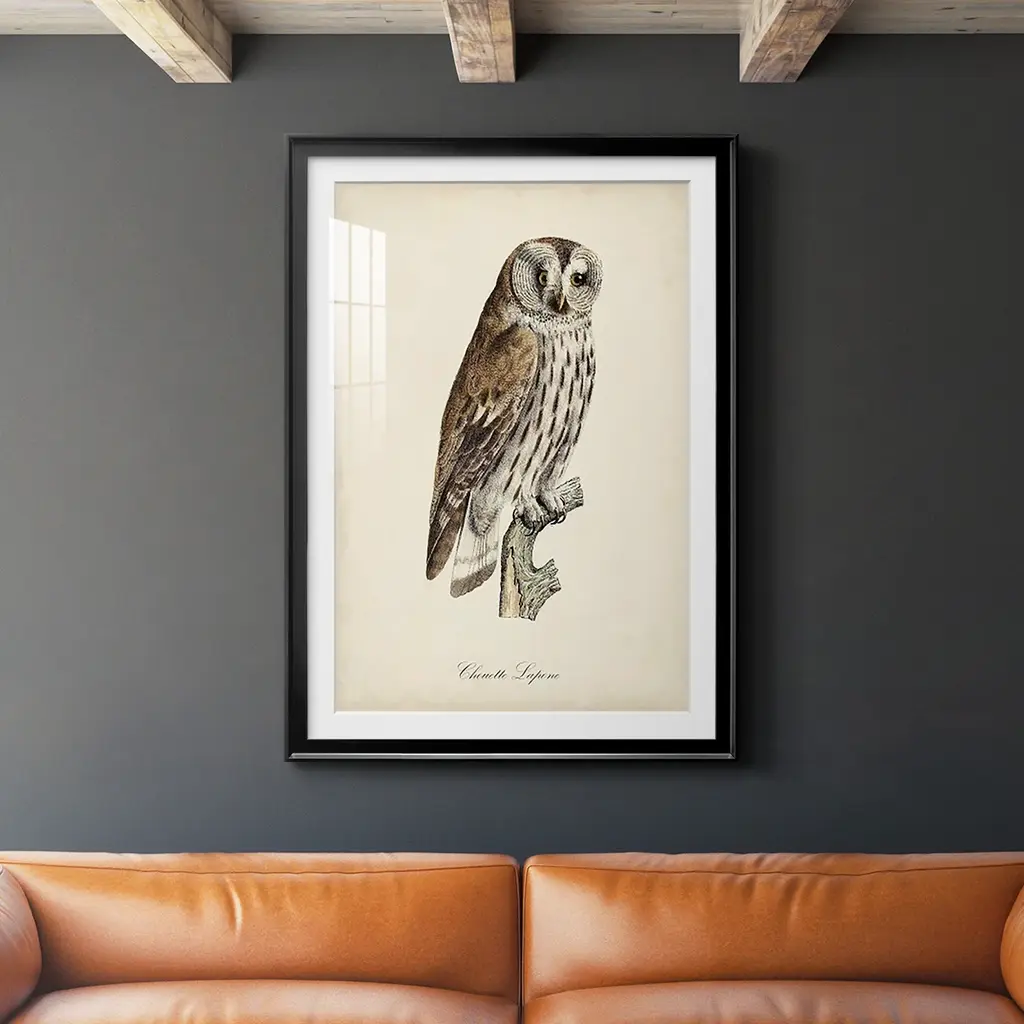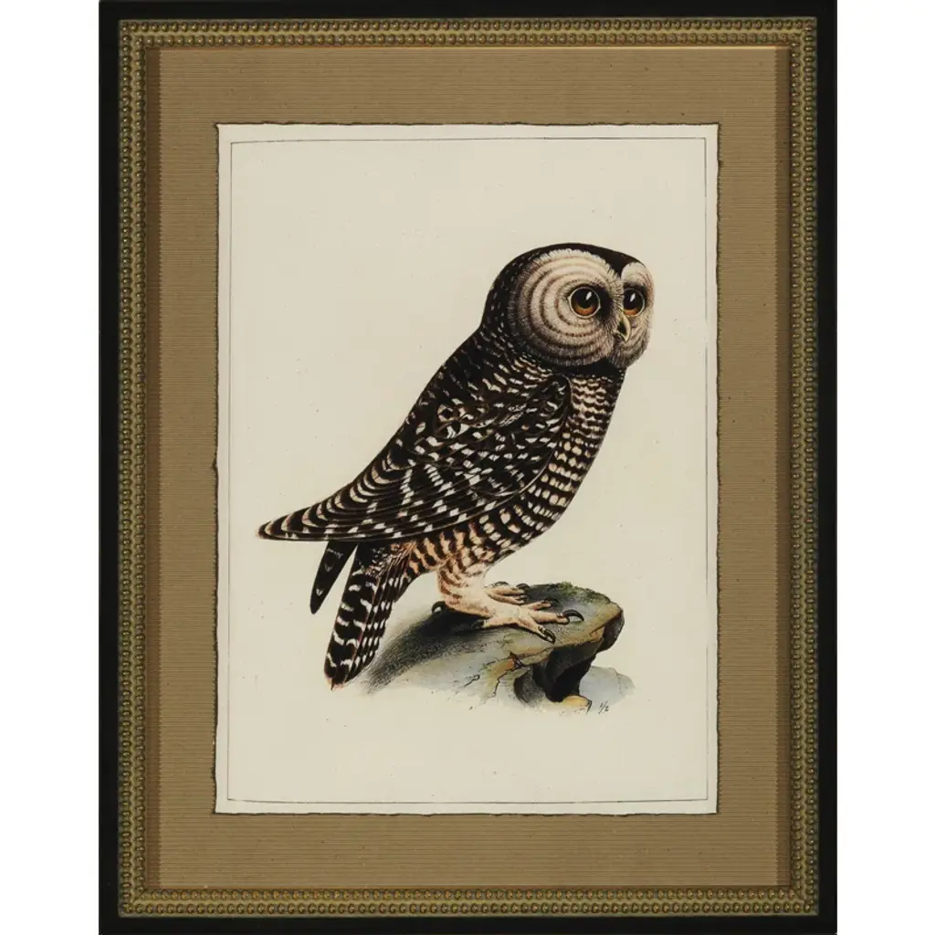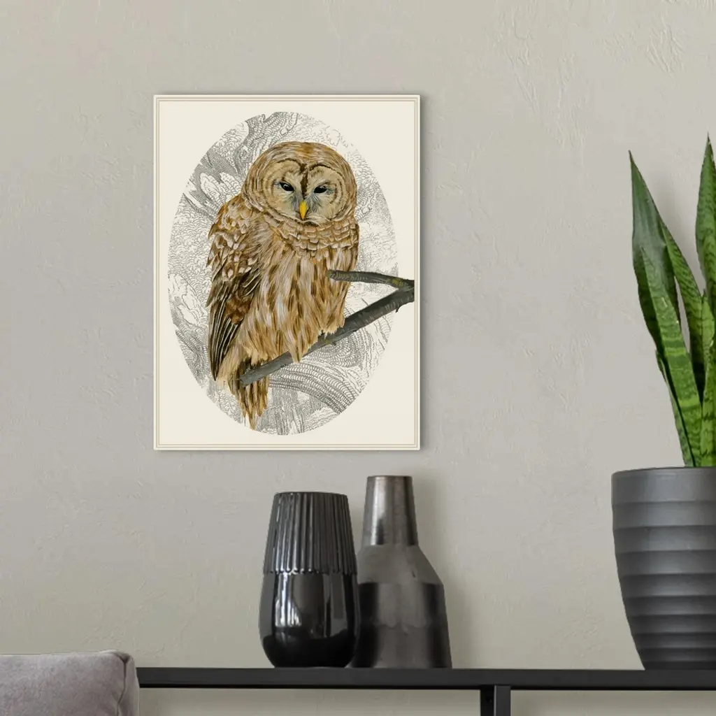 Illustration of a sleepy barred owl in an oval cameo frame.