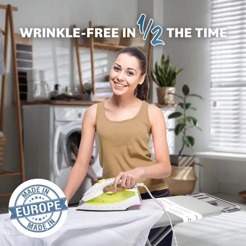 Ironing should be quick, smooth, and frustration-free. The Bartnelli Heavy Duty Ironing Board in Gray brings high performance and fresh style to every laundry day. With its 48" x 15" full-size surface, you can handle large garments, bedding, and tablecloths without constant repositioning. The Turbo Zone’s EZ Glide technology makes your iron glide effortlessly, cutting ironing time in half while delivering crisp, wrinkle-free results. The Safe Park Zone lets you rest a hot iron on the board for up to 10 minutes—no scorch marks, no damage, no stress. A four-layer, extra-thick pad ensures smooth pressing and excellent steam penetration for professional-quality finishes. Your iron stays put with the upgraded iron rest and cord holder, while heavy-duty steel legs keep the board rock-solid. The surface is gentle on fabrics, helping preserve fibers and colors for longer-lasting clothing. When the job is done, it folds flat for easy storage. The Tropical Leaves cover adds a lively, modern touch to your laundry space, making it as stylish as it is practical. Designed and made in Europe, the Bartnelli Heavy Duty Ironing Board combines durability, patented technology, and visual appeal—ready for years of smooth, steady ironing.