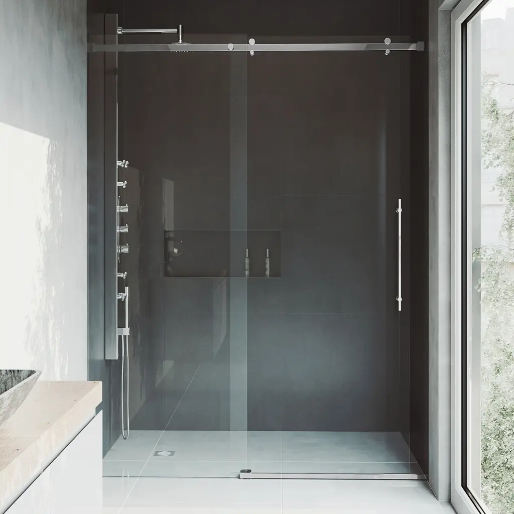The Deluxe framed sliding shower doors possess proven design and performance. The bypass unit includes two towel bars that attach to the panel framing. Anodized aluminum hardware helps prevent rusting or corrosion. The header comes with a safety T-lock that ensures the unit’s stability. Moderate DIY Skills are recommended for installation of the shower enclosure.Basco DLXH05A4068CL Features:Basco DLXH05A4068CL Specifications: