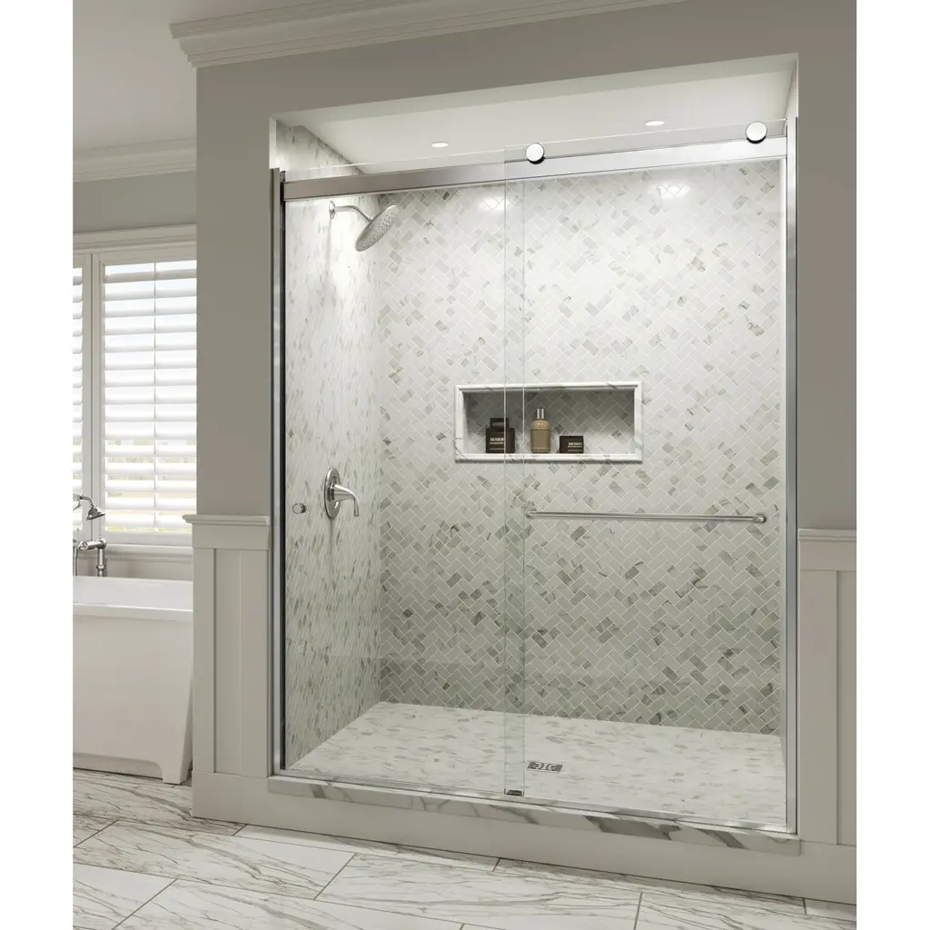 With its semi-frameless design and sleek header, the Rotolo sliding shower door adds a modern touch to your shower enclosure. This door features a dual bypass rolling design and uses two rollers and an anti-jump mechanism to ensure smooth opening and closing. Crafted from ultra-durable safety-tempered glass, the two 1/4-inch thick heavy-cut clear glass panels beautifully showcase the interior of your shower. The reflective, lustrous chrome finish and sleek, gently curved towel bar add to the door’s contemporary appeal. And thanks to its precise panel fitting, this door helps eliminate leaks to keep your bathroom tidy. Ideal for all wall substrates - including fiberglass, acrylic, and tile - this shower door is exceptionally easy to install and coordinates with a variety of contemporary styles.Basco RTLH05B5670XP Features:Basco RTLH05B5670XP Specifications:
