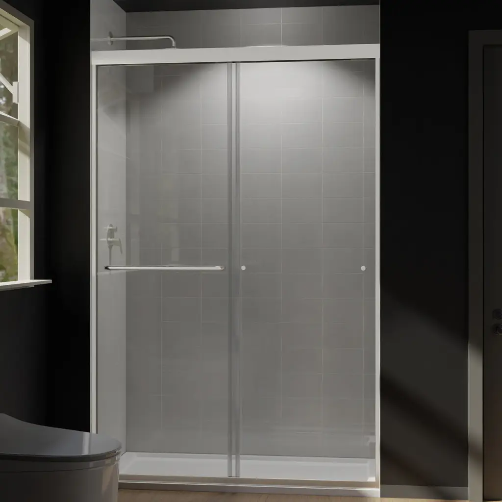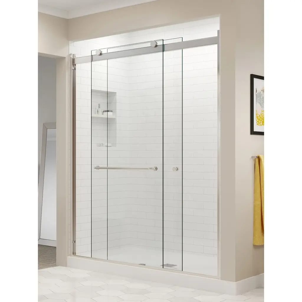 With its semi-frameless design and sleek header, the Rotolo sliding shower door adds a modern touch to your shower enclosure. This door features a dual bypass rolling design and uses two rollers and an anti-jump mechanism to ensure smooth opening and closing. Crafted from ultra-durable safety-tempered glass, the two 1/4-inch thick heavy-cut clear glass panels beautifully showcase the interior of your shower. The reflective, lustrous chrome finish and sleek, gently curved towel bar add to the door’s contemporary appeal. And thanks to its precise panel fitting, this door helps eliminate leaks to keep your bathroom tidy. Ideal for all wall substrates - including fiberglass, acrylic, and tile - this shower door is exceptionally easy to install and coordinates with a variety of contemporary styles.Basco RTLH05B6070CL Features:Basco RTLH05B6070CL Specifications: