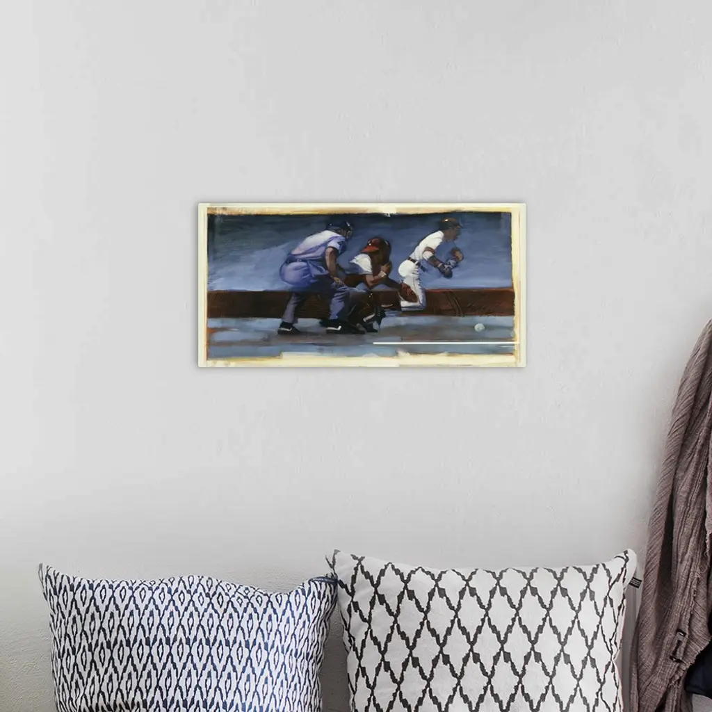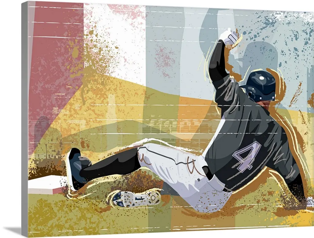 A contemporary design of a batter swinging his bat at a baseball during a game with roughen edges along the sides.