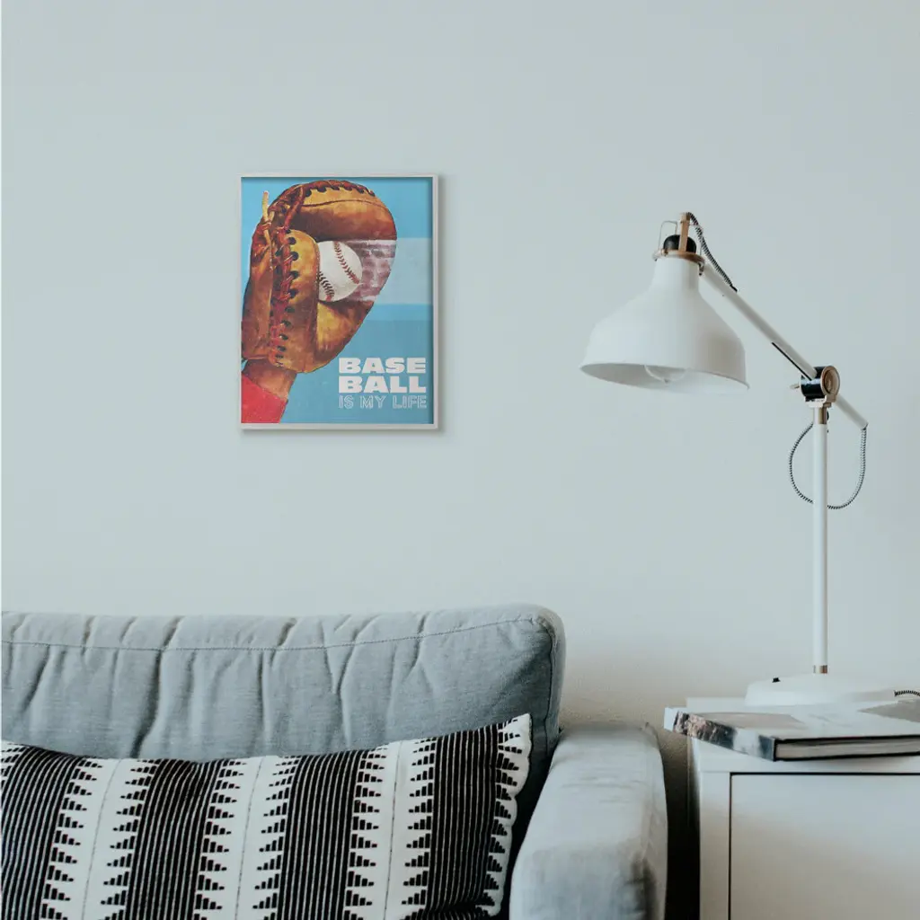 Baseball Is My Life Mitt Red Blue Sports Design, 11"x14", Gray Frame