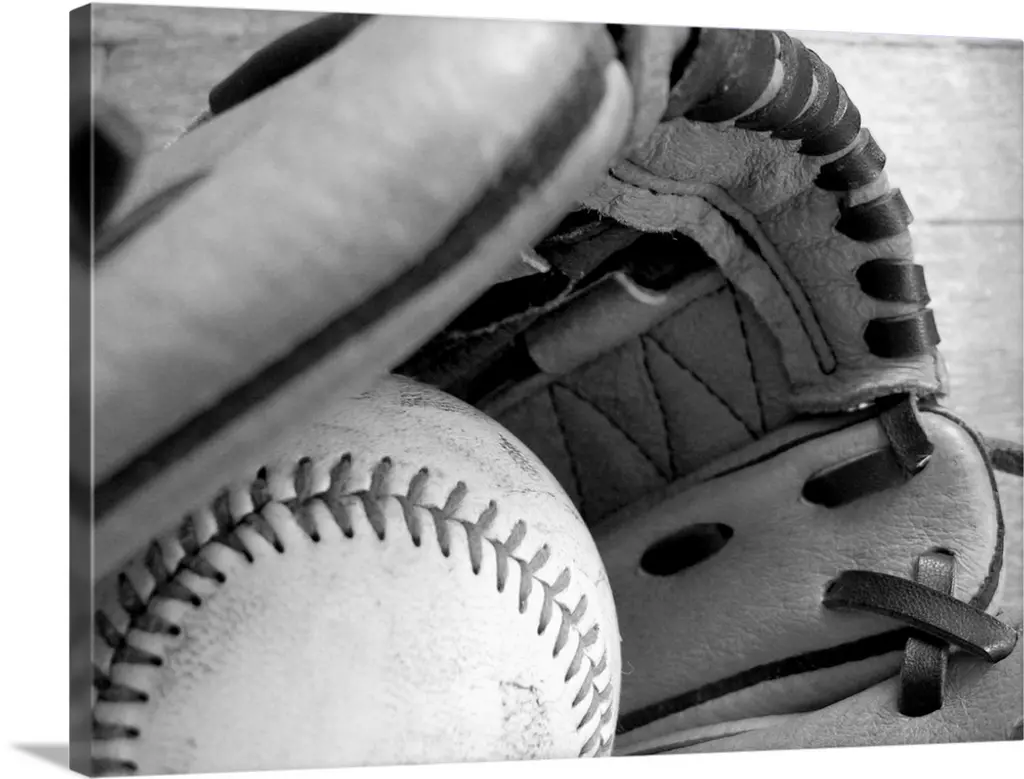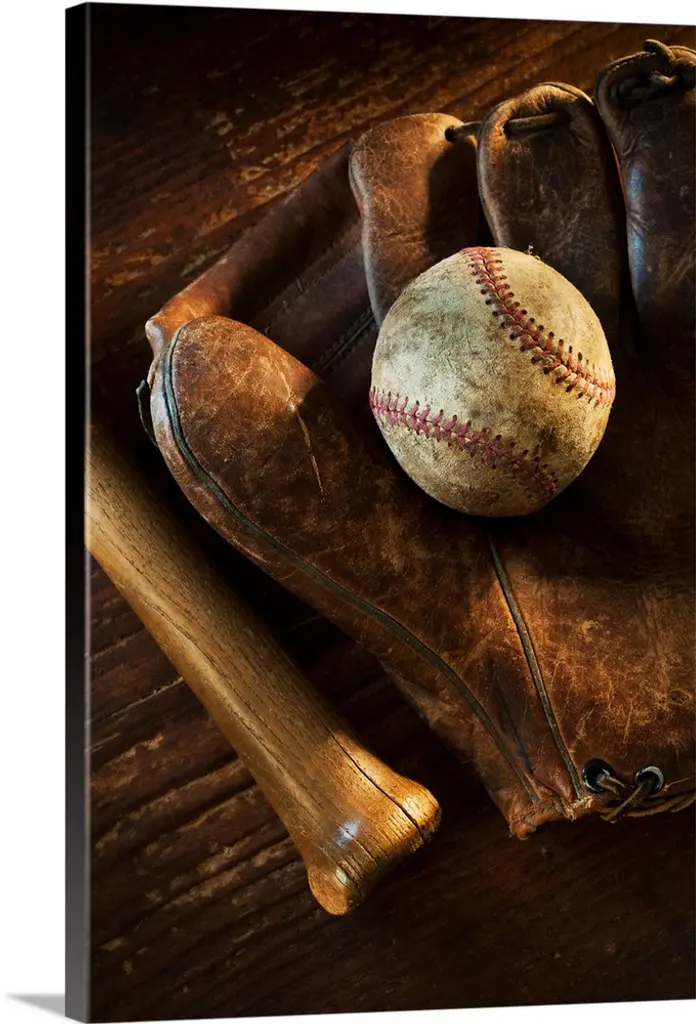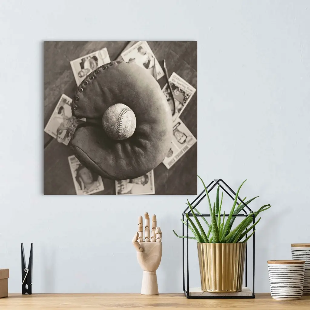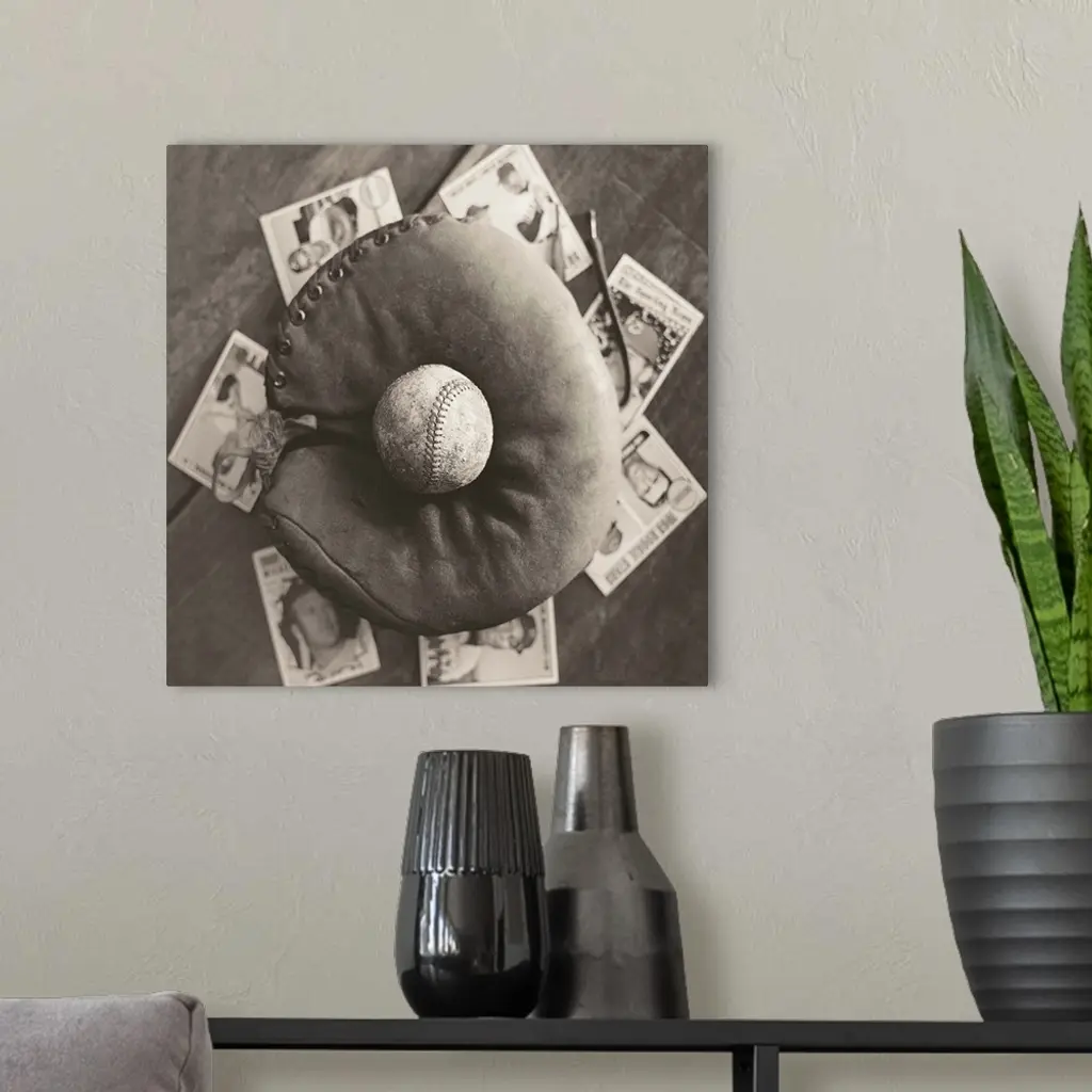 Square sepia toned photograph of a worn baseball in an old mitt and vintage baseball cards behind it.