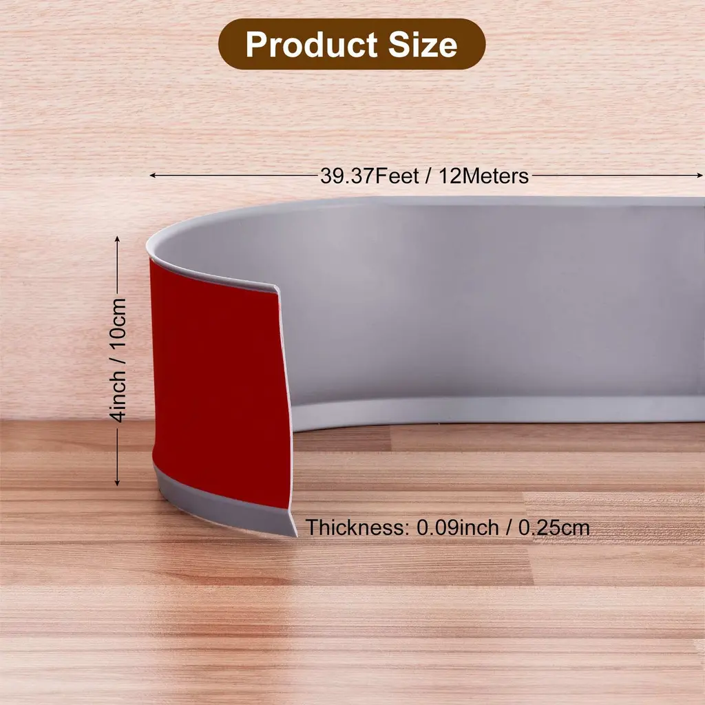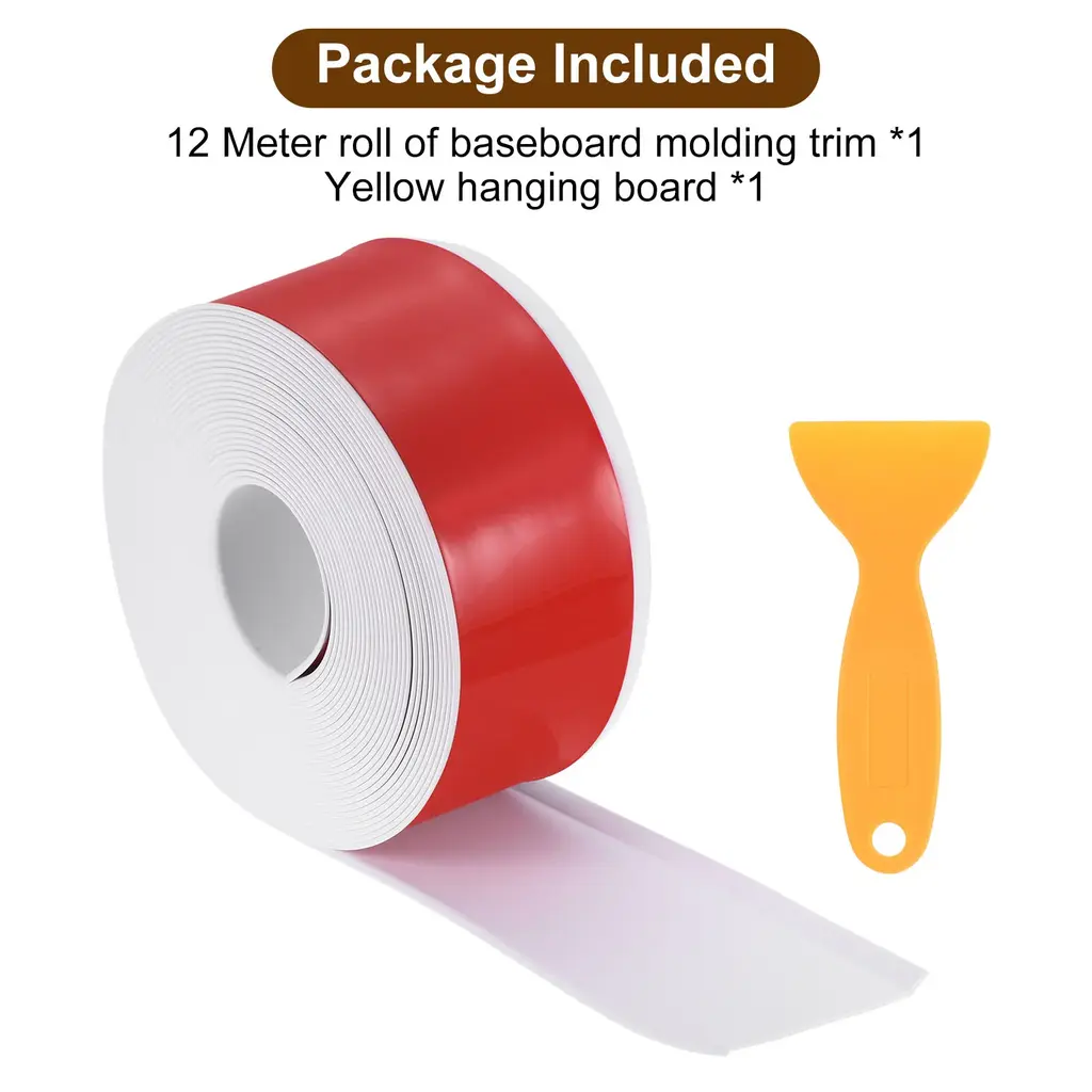 Self-adhesive baseboard molding trim for covering gaps between floors and walls in garage, living room, bathroom, bedroom, RVs, kitchen, during house renovations.Specification:Material: PVCColor: WhiteLength: 39.37Ft/12mWidth: 4in/10cmThickness: 0.09 inch/0.25 cmPackage Included: 1 x roll of baseboard molding trimAdvantage:The wall baseboard molding is made from PVC material, flexible, wear-resistant, and not easy to fade or deform even with prolonged use.Our vinyl wall base comes with self-adhesive tape and can stick to most smooth surfaces and will not fall off for a long time use.It features a toe design that deals with various situation, especially helping you hide various flaws and uneven surfaces.Just simply clean the wall surface, then cut the length of the wall base you need and peel off the adhesive film on the back for installation.This wall base molding trim has a smooth and even finish, making it easy to clean. Just give it a wipe with a damp cloth and dry it off.Note: For temperatures below 68°F, use a hair dryer to warm the adhesive strip for optimal performance.