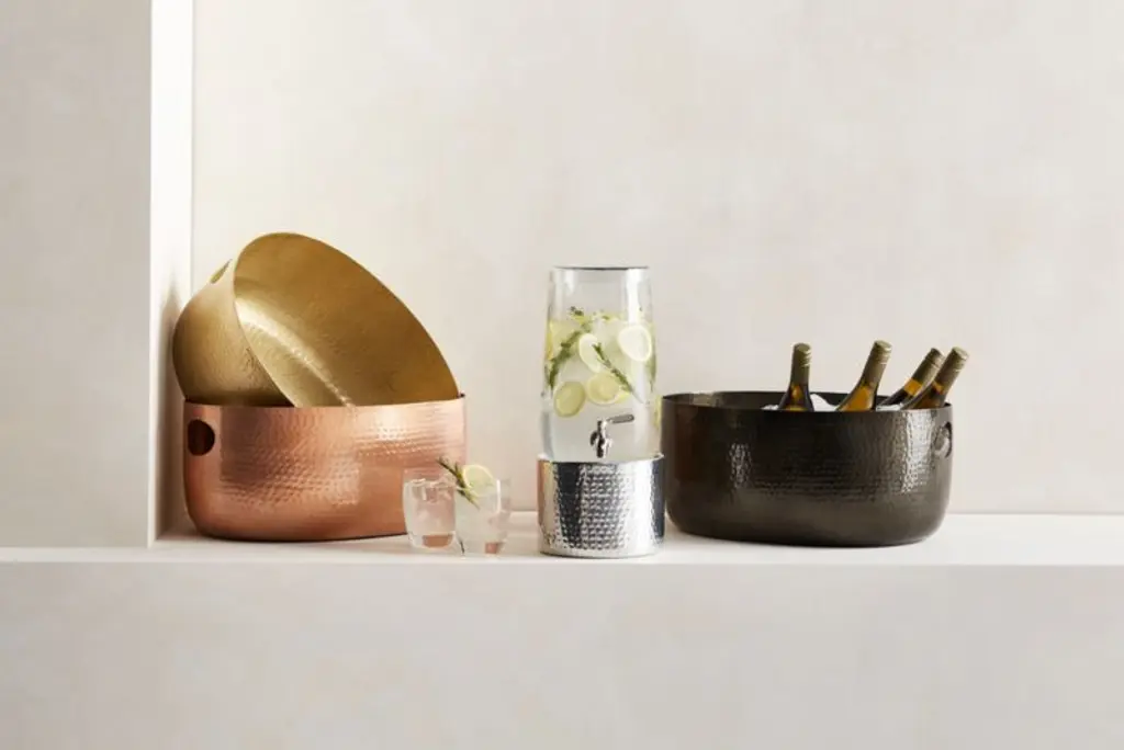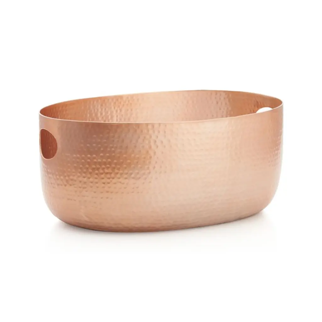 Beautiful copper finish enhances the artisanal look of our hand-hammered aluminum beverage tubs, generously sized to chill a party's worth of wines and beers. The tub has a clean oval shape and cutout handles to make it easy to move the iced drinks from kitchen to party.