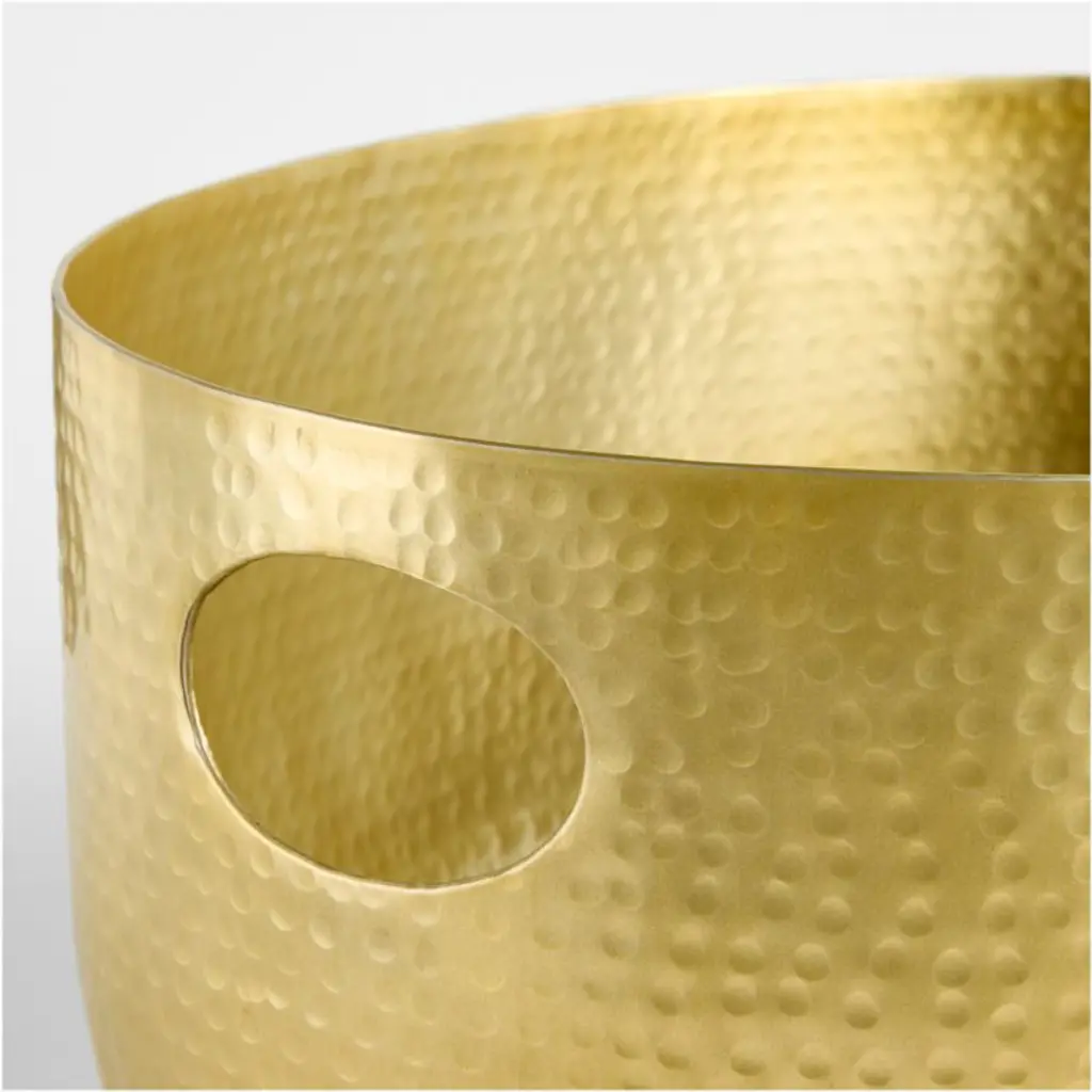 Hand-hammered aluminum beverage tubs with a warm, gold finish puts the big chill on a party's worth of wines and beers. Classic and casual, the generously sized tub has a clean oval shape with cutout handles that make it easy to move the iced libations from the kitchen to the festivities.