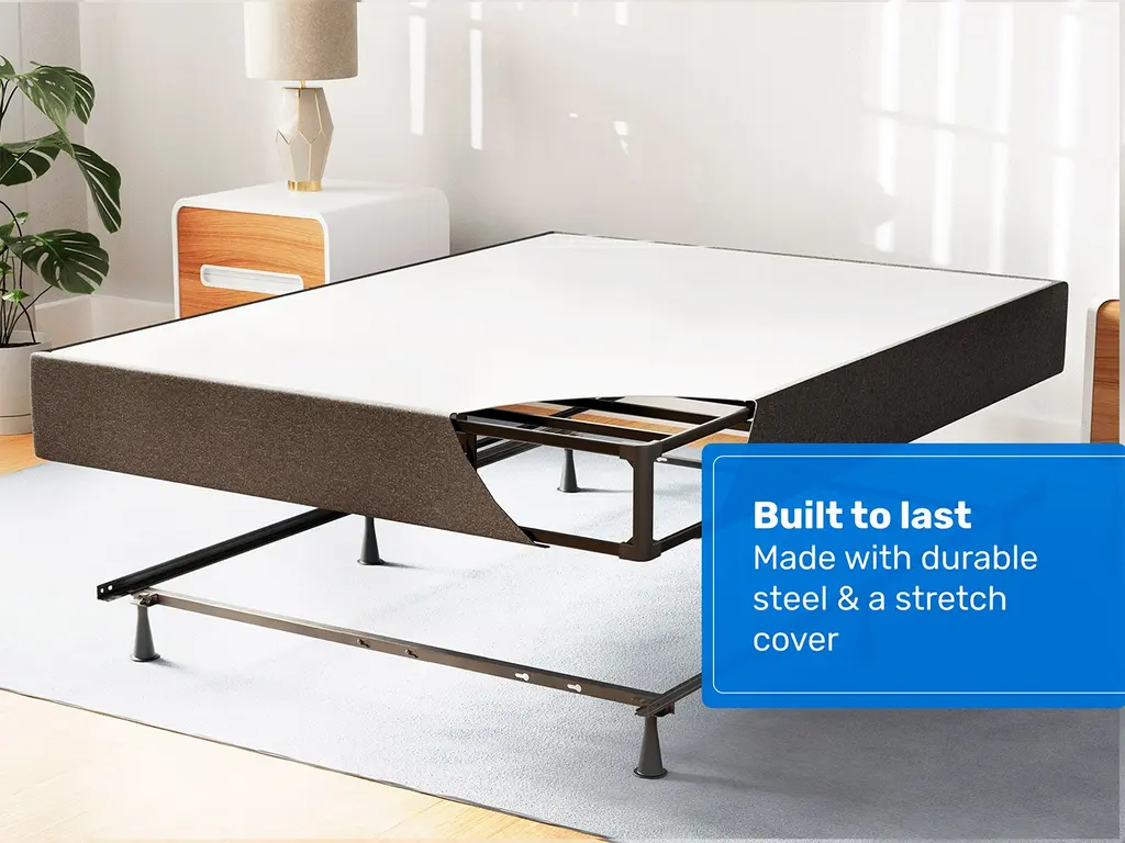 The Easy Assembly foundation offers sturdy steel support, quick setup, and consistent mattress support. Get the support your mattress needs with the quick assembly you want. Made with durable steel and a stretch fabric cover, this 5" or 9" box spring is built to last. Plus, it’s easy to maneuver—all parts, tools and instructions are included for better zzz's in under 10 minutes. 1-Year limited warranty. Twin/Twin XL sizes support 350 lbs; all other sizes support 700 lbs.