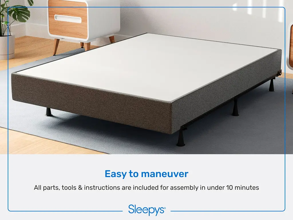 The Easy Assembly foundation offers sturdy steel support, quick setup, and consistent mattress support. Get the support your mattress needs with the quick assembly you want. Made with durable steel and a stretch fabric cover, this 5" or 9" box spring is built to last. Plus, it’s easy to maneuver—all parts, tools and instructions are included for better zzz's in under 10 minutes. 1-Year limited warranty. Twin/Twin XL sizes support 350 lbs; all other sizes support 700 lbs.