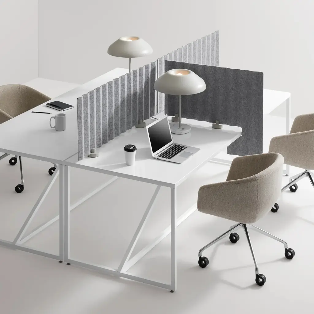 No peeking. Soft molded felt panels eliminate the need to pretend you’re busy. A visually appealing corrugated design tunes out background noise and chatty neighbors, so you can finally get some Wikipediaing done, dammit. Overhang hugs table edge to up the privacy and the intrigue.