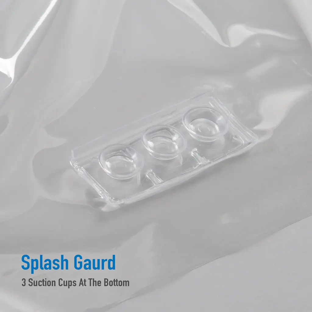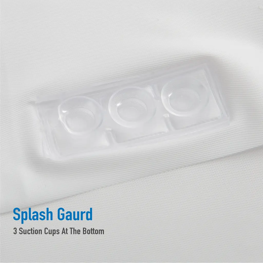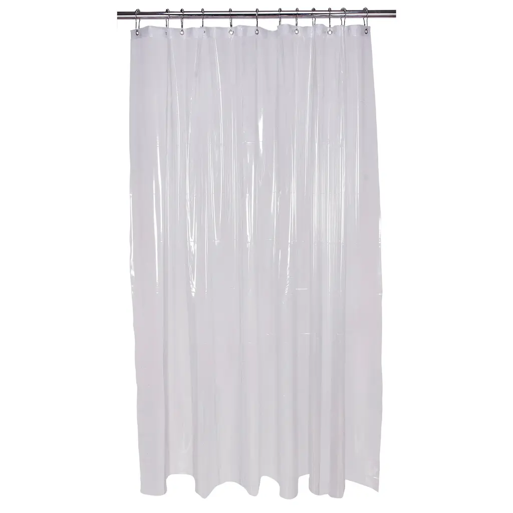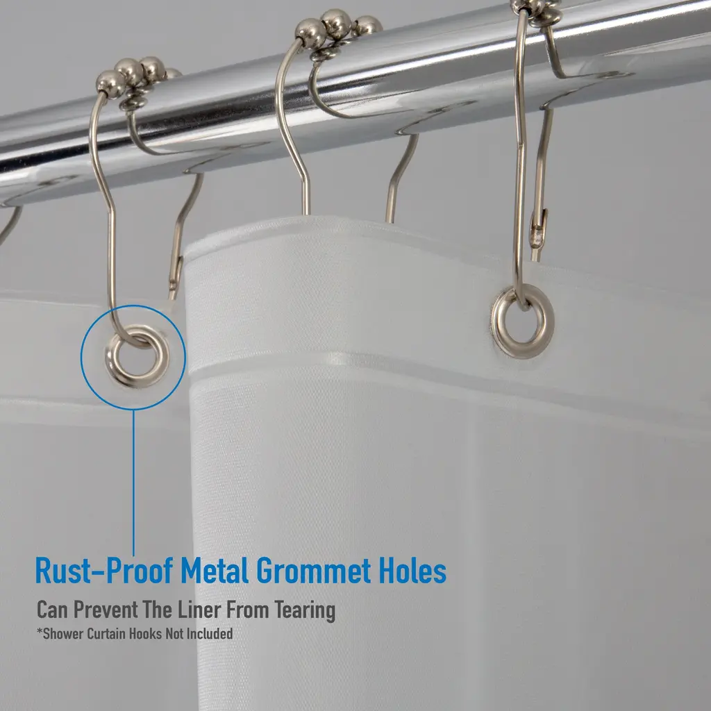 Bath Bliss Splash guard shower liner with metal eyelets grommets includes splash guard suction cups to keep water where it belongs in your tub, three base magnets to keep your liner weighed down and in your tub. 12 Metal reinforced eyelets prevent tears in liner which helps prolong life. Wipes clean with damp cloth. Made of 100% PVC. 5.5 Gauge. Color: clear. Size: 72"x72".