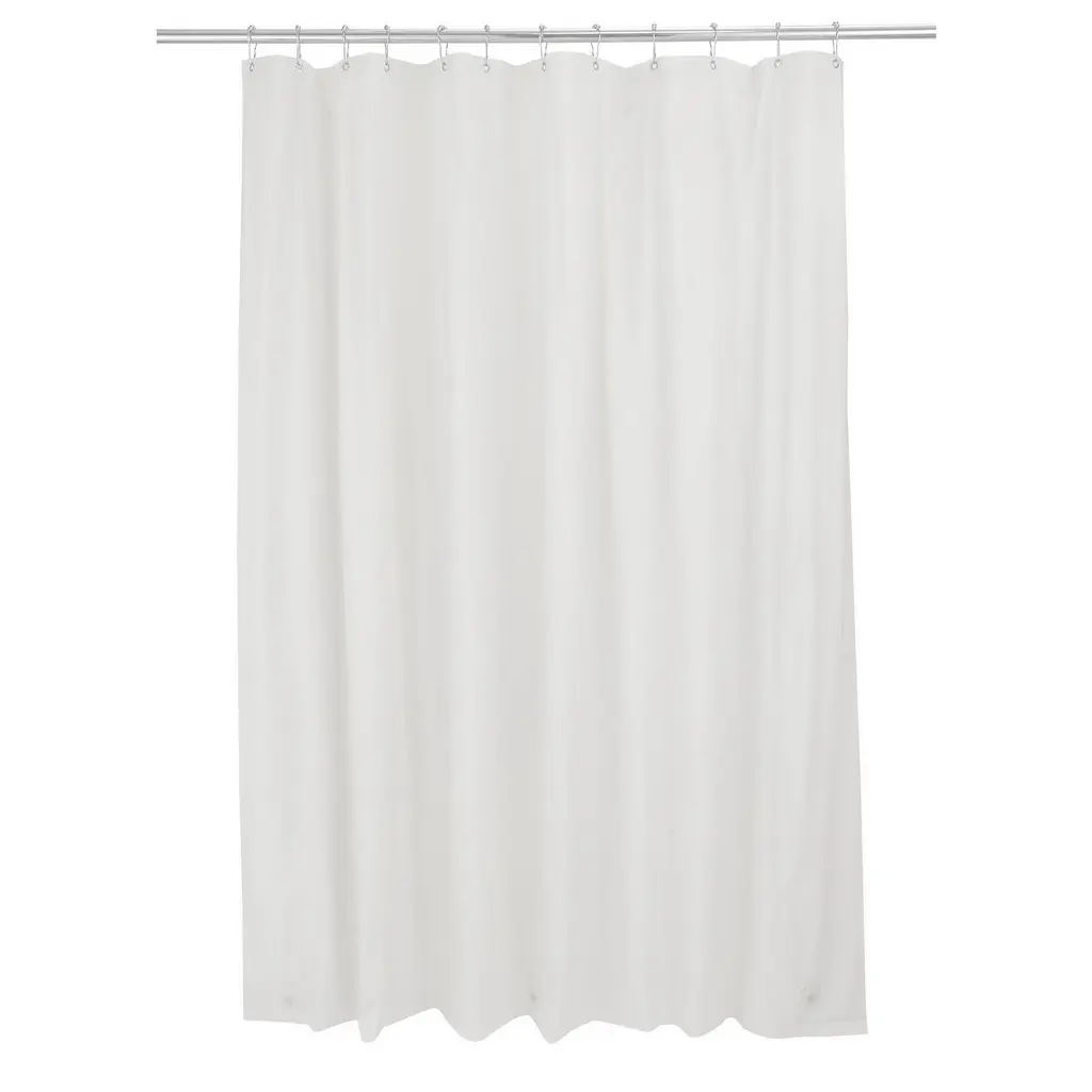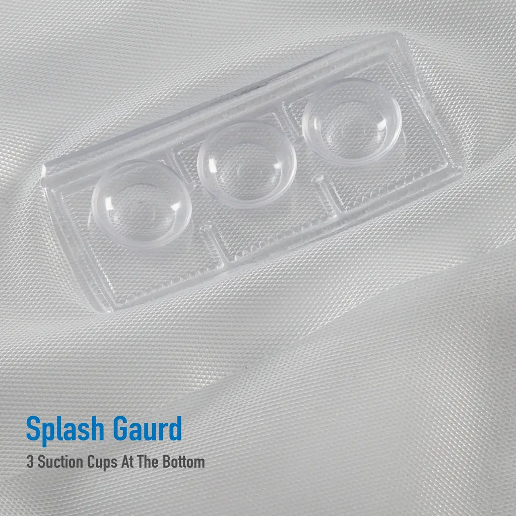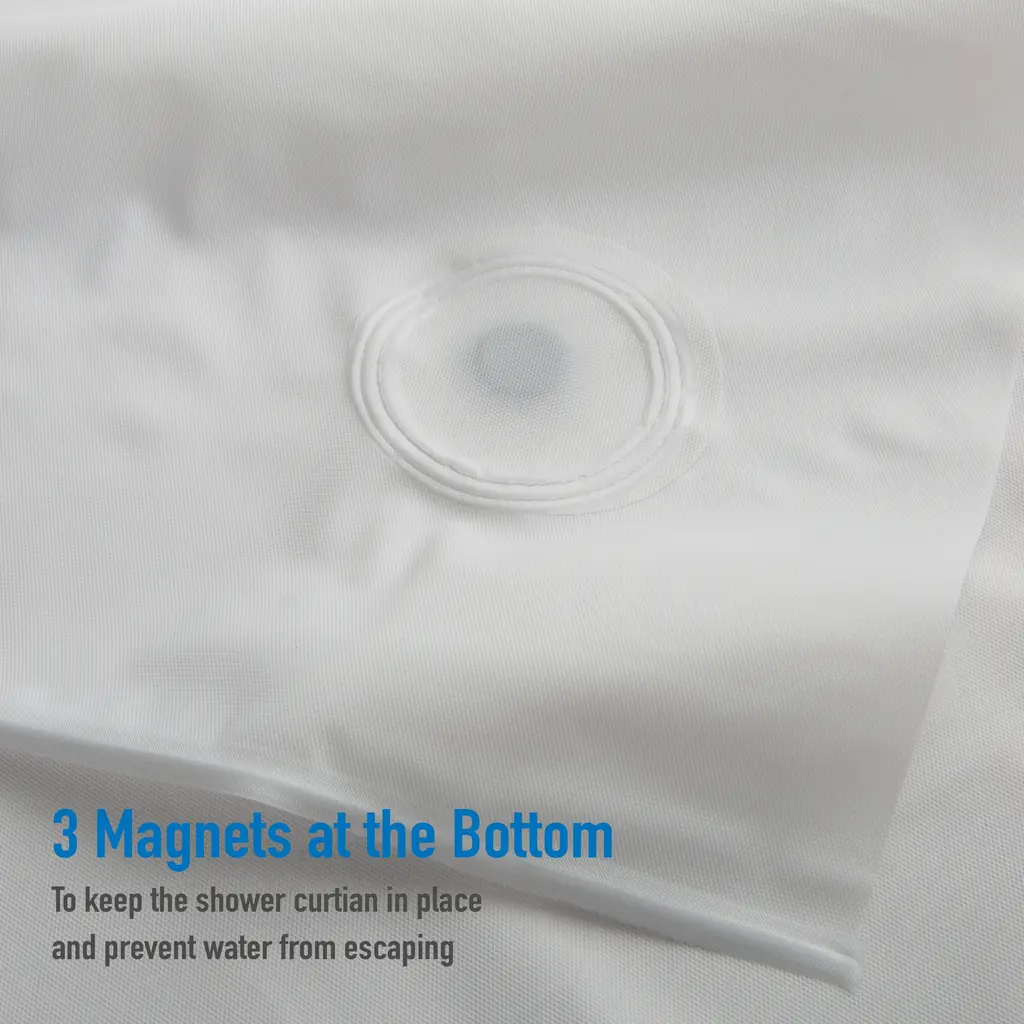 Bath Bliss Splash guard shower liner with metal eyelets grommets includes splash guard suction cups to keep water where it belongs in your tub, three base magnets to keep your liner weighed down and in your tub. 12 Metal reinforced eyelets prevent tears in liner which helps prolong life. Wipes clean with damp cloth. Made of 100% PVC. 5.5 Gauge. Color: clear. Size: 72"x72".