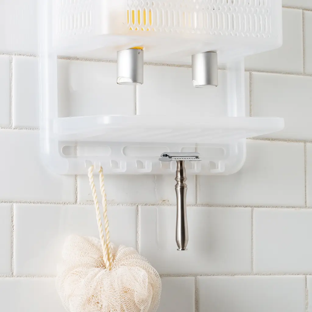 The Bath Bliss Molded Shower Caddy hangs over the shower head to save space, organize, and create extra storage. This caddy has space to store your shampoos and soaps, as well as 6 accessory hooks for loofahs and razors. Your shower essentials will be readily available when you need them. It is constructed of durable material and the 2 suctions cups help keep it sturdy. The simple yet modern design is essential for any bathroom space.