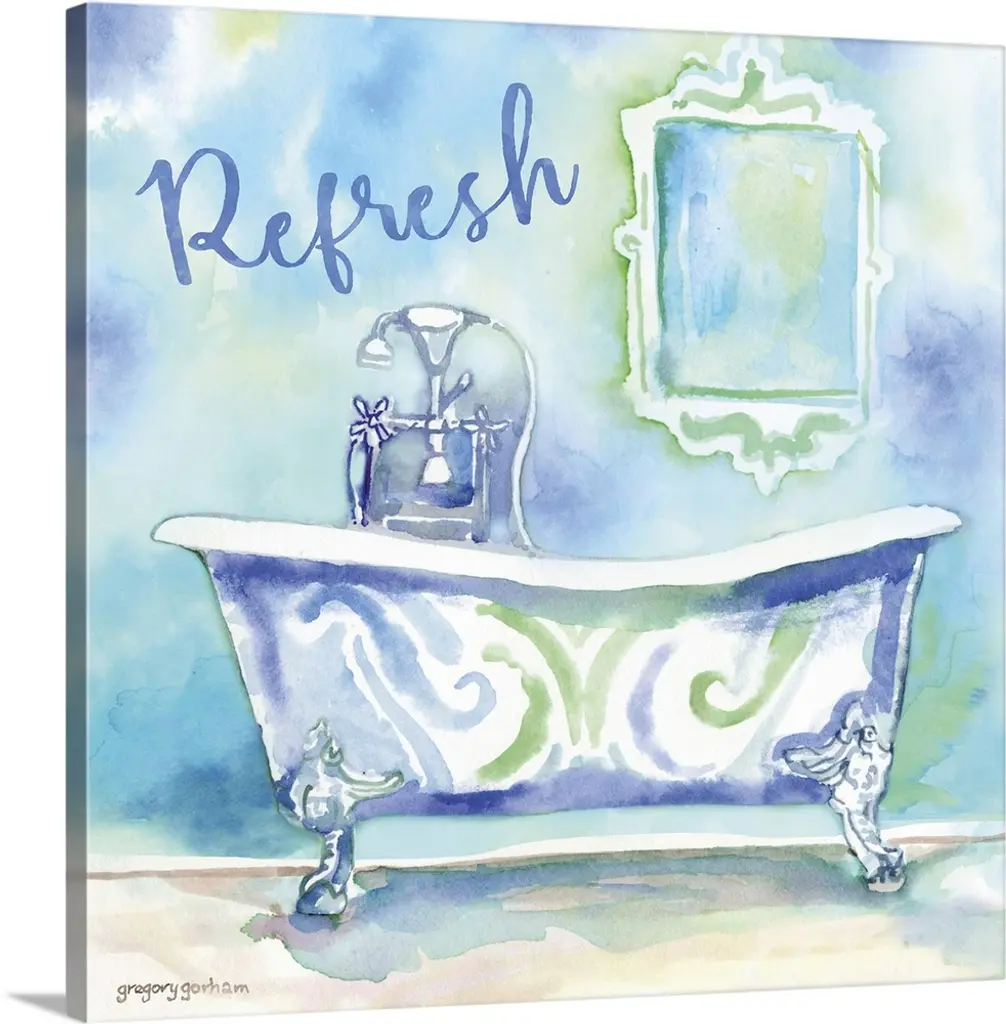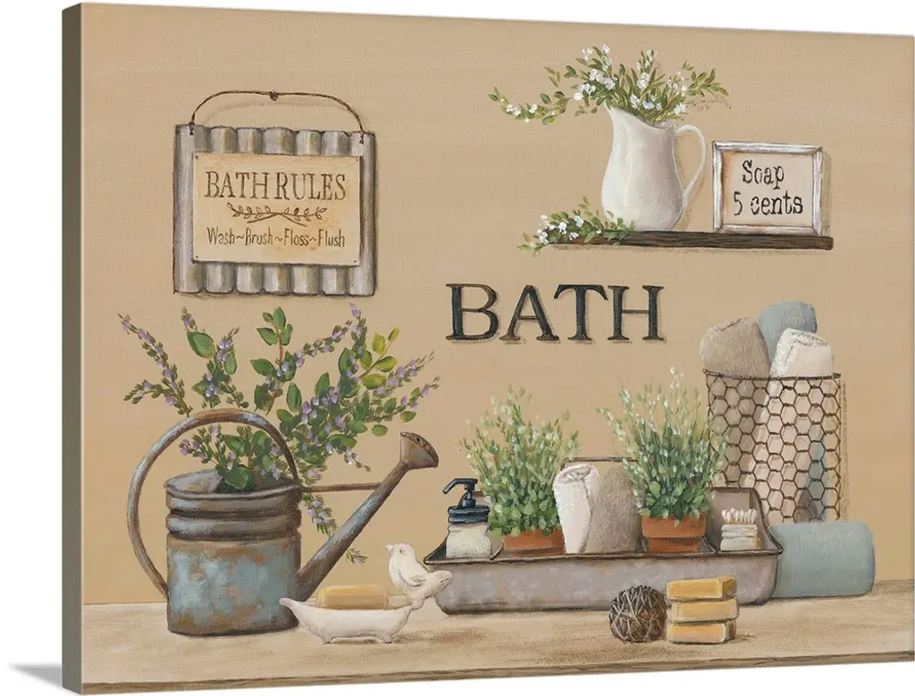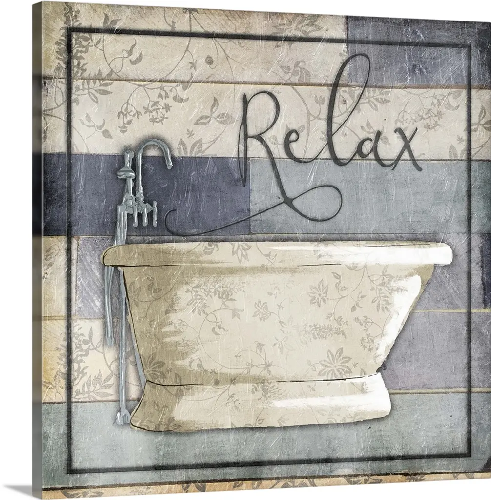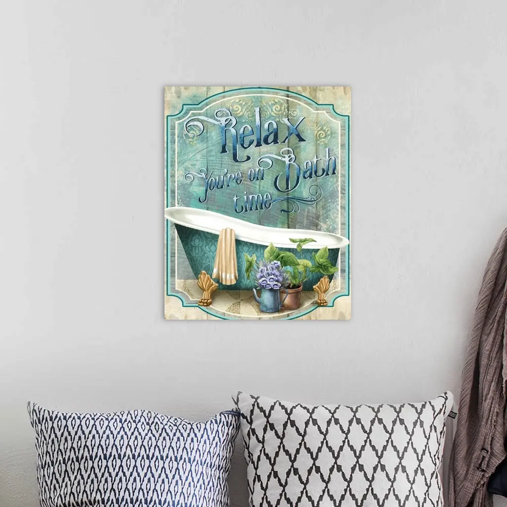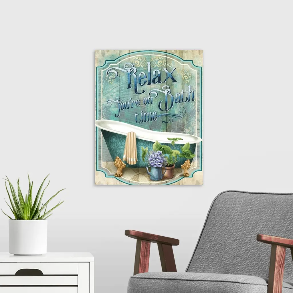 A painted tub overlaps a distressed sign with the words, "Relax, You're on Bath time" above it.