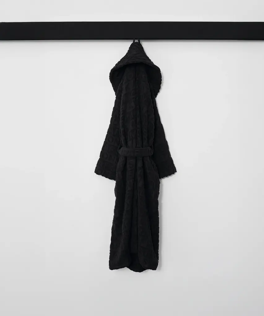 A shawl-collared bathrobe in terry cotton with a Kvadrat/Raf Simons logo shaved in the jacquard pattern. Designed for wrapping the whole body, it is oversized and generously long. Produced in Italy by Kvadrat/Raf Simons.