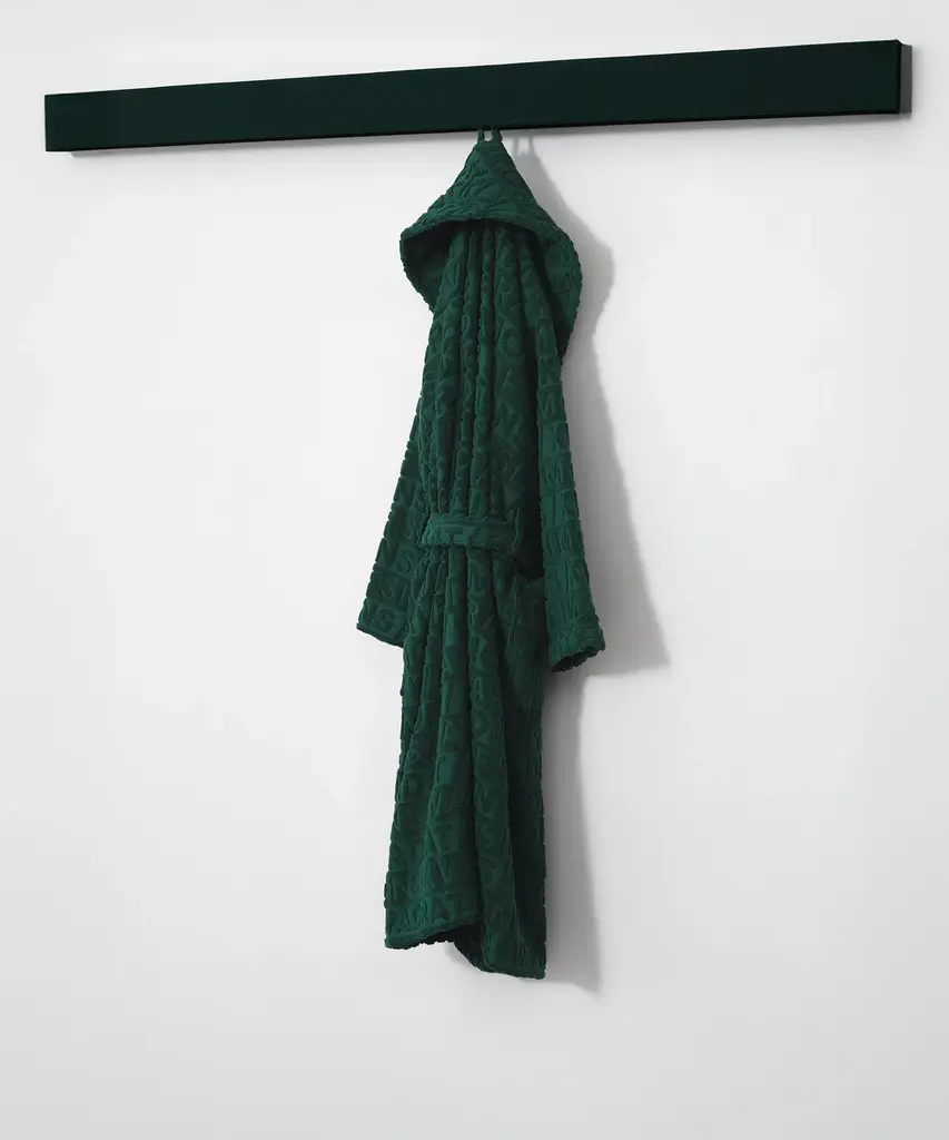 A shawl-collared bathrobe in terry cotton with a Kvadrat/Raf Simons logo shaved in the jacquard pattern. Designed for wrapping the whole body, it is oversized and generously long. Produced in Italy by Kvadrat/Raf Simons.
