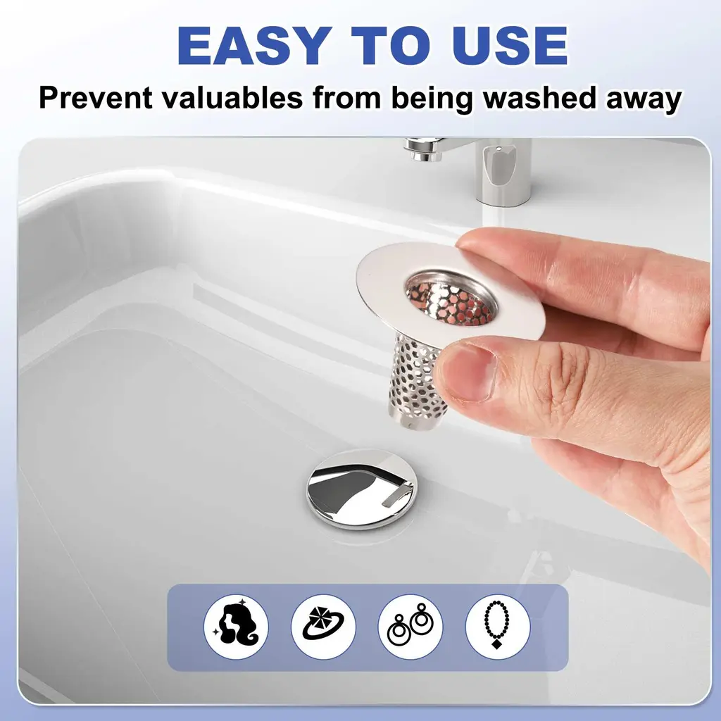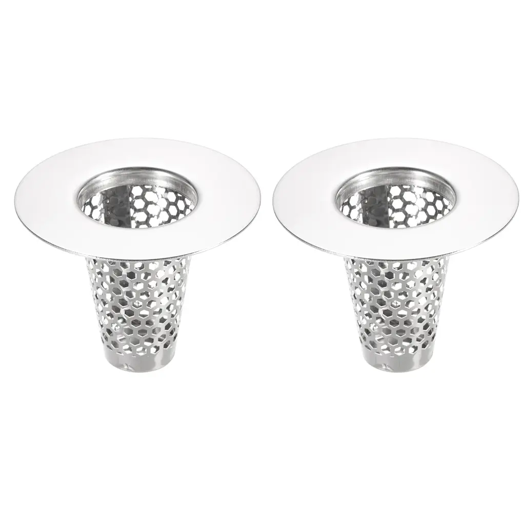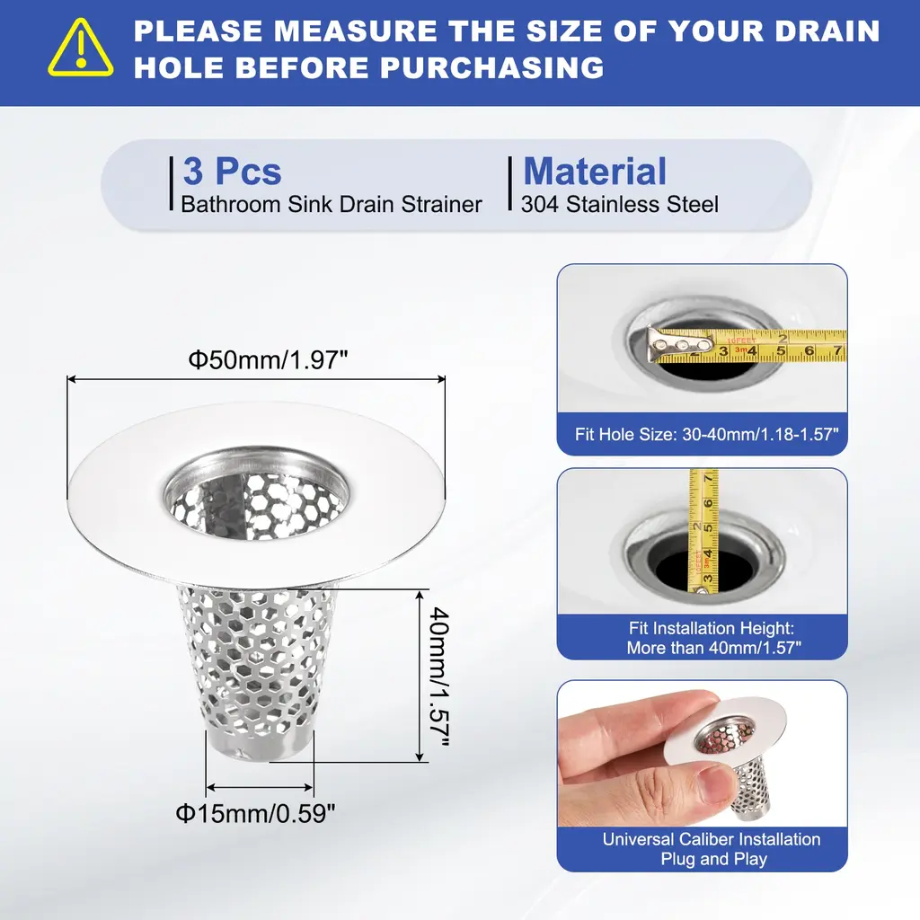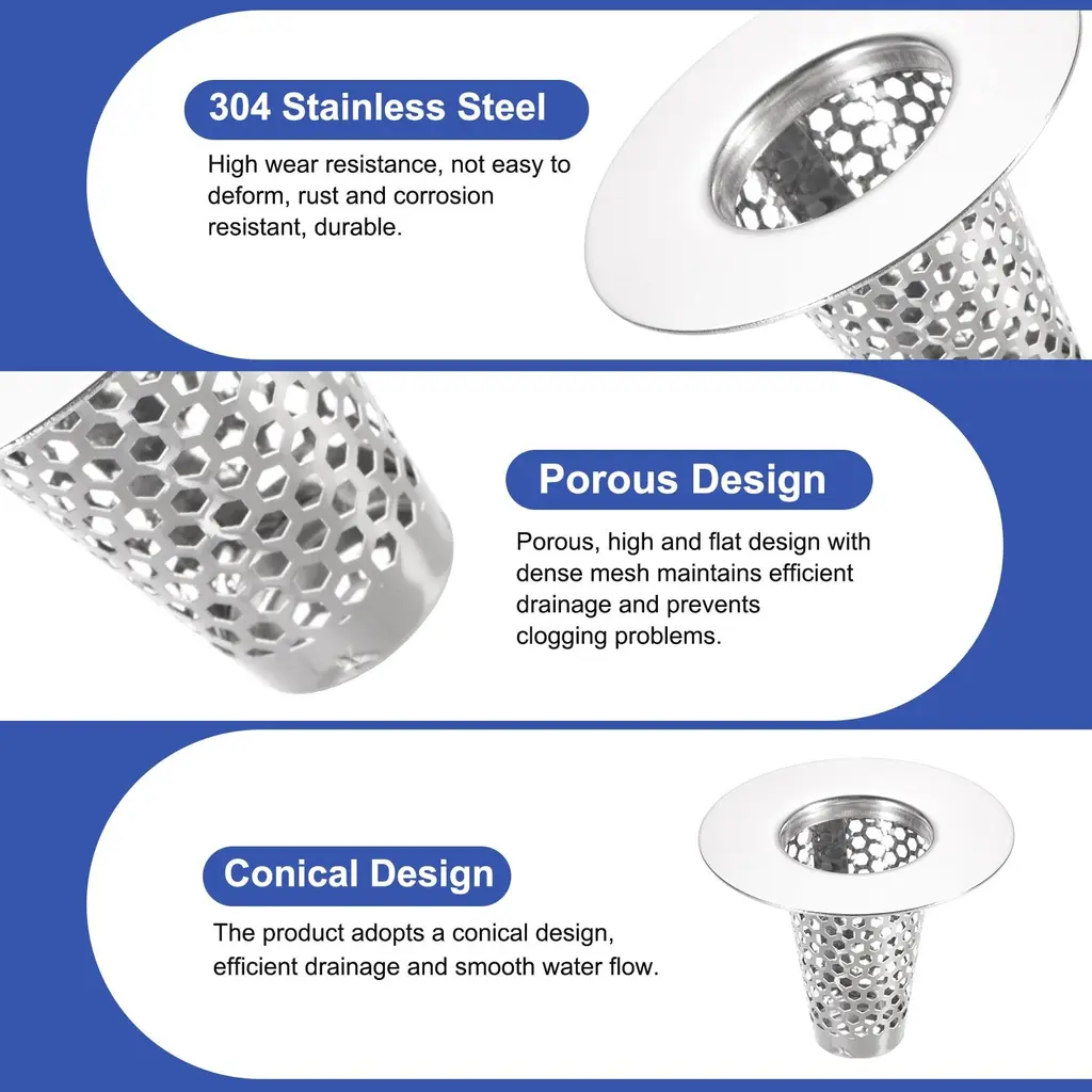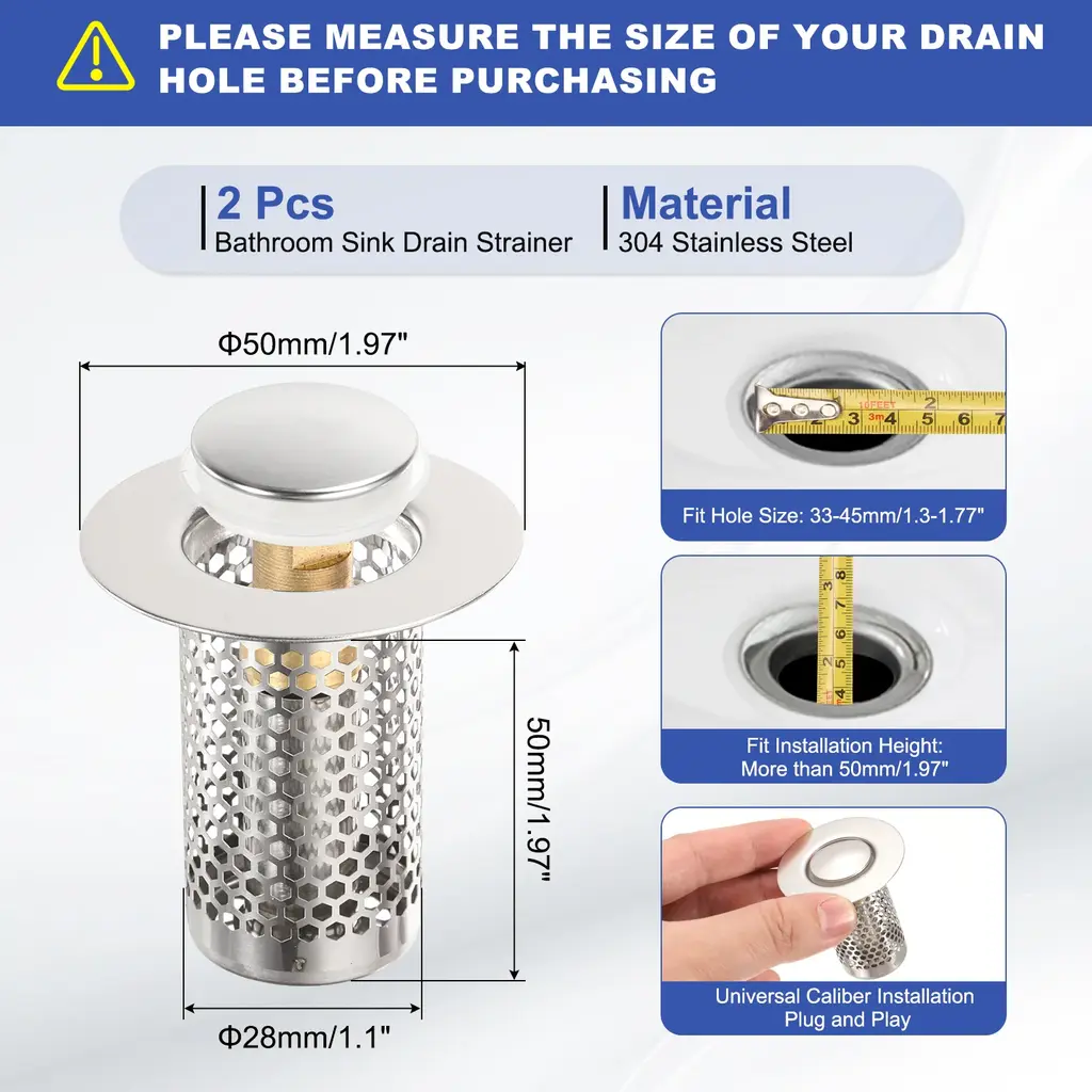 Description[Material] - Made of 304 stainless steel, it is not easy to deform, has high wear resistance, is durable, and is rust-proof and anti-corrosion even after long-term use. You can rest assured that your sink stopper will remain in its original condition for many years.[Effective Drainage Design] - The porous, high, flat design with dense mesh minimizes the accumulation of filter residues and the impact of faucet water flow on the water flow rate, maintaining efficient drainage and preventing clogging problems.[Easy to Use & Clean] - Easy to install and maintain, just insert it into the drain hole to enjoy instant functionality, cleaning the sink stopper is a breeze, just remove the tapered sink stopper and rinse under running water. Note that please measure the drain hole diameter before purchasing.[Wide Application] - The bathroom sink drain strainer has a very good filtering effect, effectively prevents hair and tiny debris from entering the sewer, and can be well adapted to the drain outlet. It can be widely used in floor drain outlets in kitchens, bathrooms, balconies, etc.SpecificationMaterial: 304 Stainless SteelOverall Size: 40 x 50mm/1.57 x 1.97inch(H*OD)Hole Diameter: 25mm/0.98inchBottom Basket Diameter: 15mm/0.59inchFit Hole Size: 30-40mm/1.18-1.57inchFit Installation Height: More than 40mm/1.57inchPackage Listing2Pcs x Bathroom Sink Drain Strainer