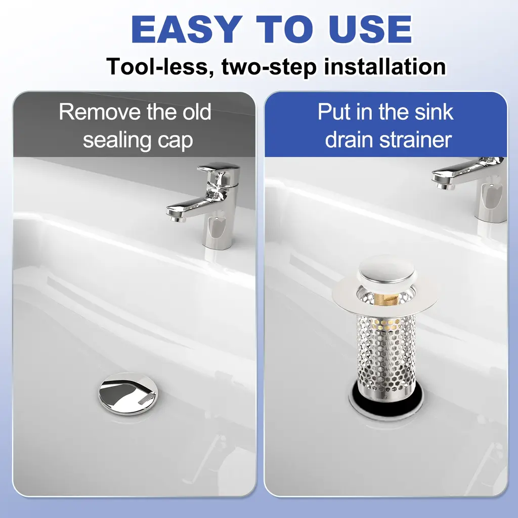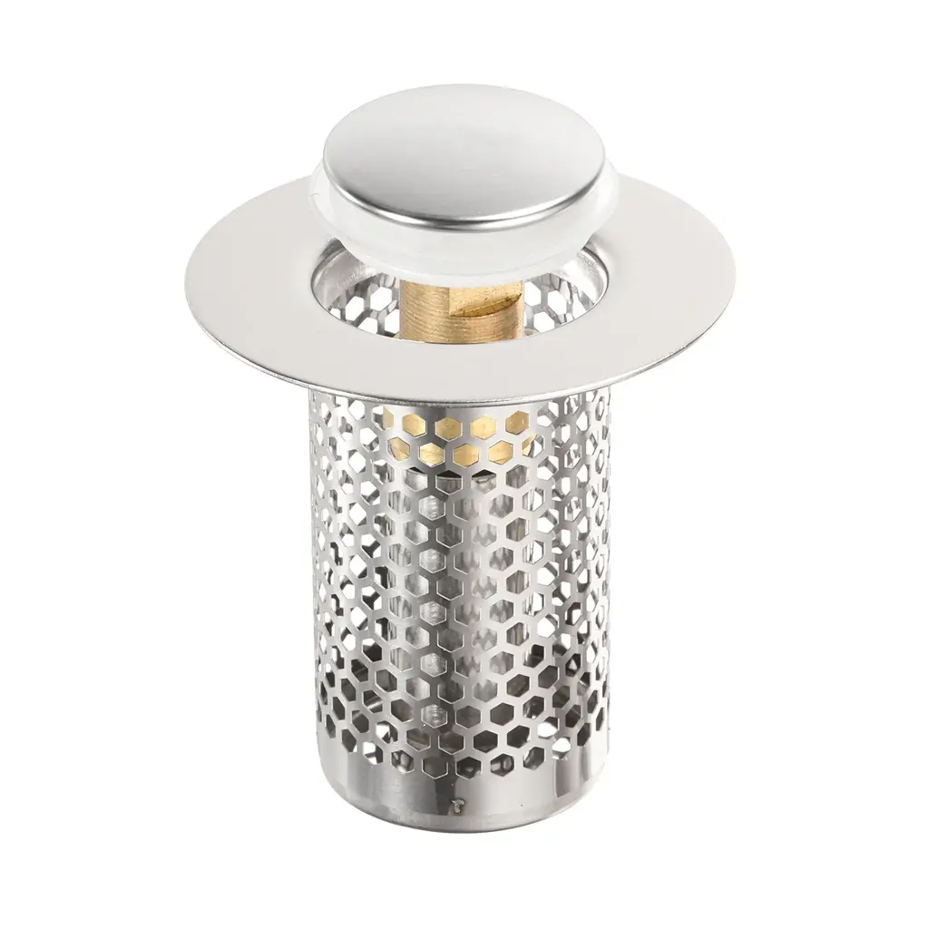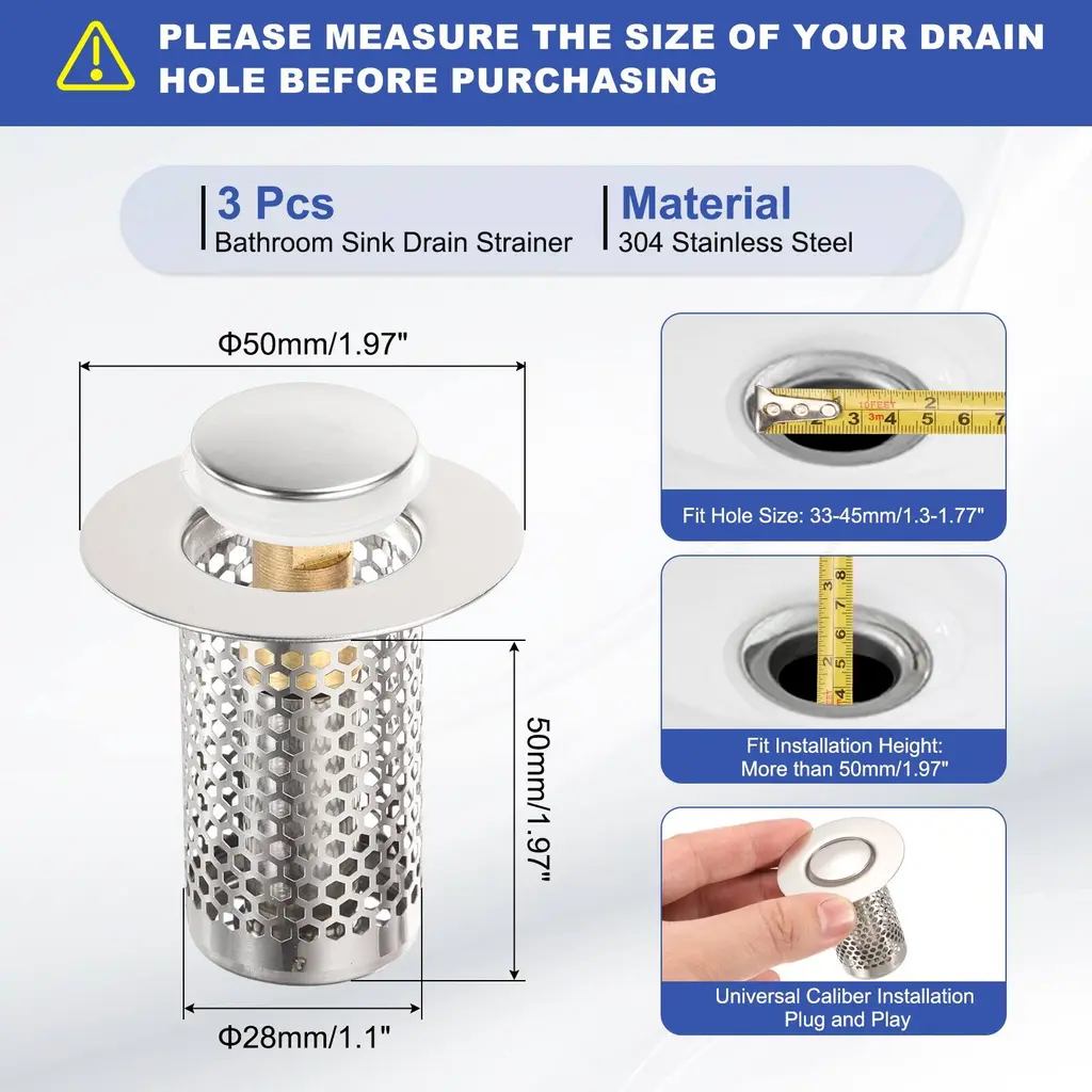 Description[Material] - Made of 304 stainless steel, it is not easy to deform, has high wear resistance, is durable, and is rust-proof and anti-corrosion even after long-term use. You can rest assured that your sink stopper will remain in its original condition for many years.[2 in 1 Design] - The bathroom sink drain strainer combines the function of plugs and filters into one. The sink plug has a bouncing core design and has good elasticity, which can easily open and turn off drainage. The anti-clogging baskets are used to capture hair and other debris to prevent them from entering the drain pipe, maintaining effective drainage and preventing blockage.[Easy to Use & Clean] - Easy to install and maintain, just plug it into the drain hole to enjoy instant functionality, cleaning the sink plug is a breeze, just remove the mesh basket and rinse it under running water.Please note that please measure the drainage hole diameter before purchasing.[Wide Application] - The bathroom sink drain strainer has a very good filtering effect, effectively prevents hair and tiny debris from entering the sewer, and can be well adapted to the drain outlet. It can be widely used in floor drain outlets in kitchens, bathrooms, balconies, etc.SpecificationMaterial: 304 Stainless SteelOverall Size: 50 x 50mm/1.97 x 1.97inch(H*OD)Bottom Basket Diameter: 28mm/1.1inchFit Hole Size: 33-45mm/1.3-1.77inchFit Installation Height: More than 50mm/1.97inchPackage Listing1Pcs x Bathroom Sink Drain Strainer