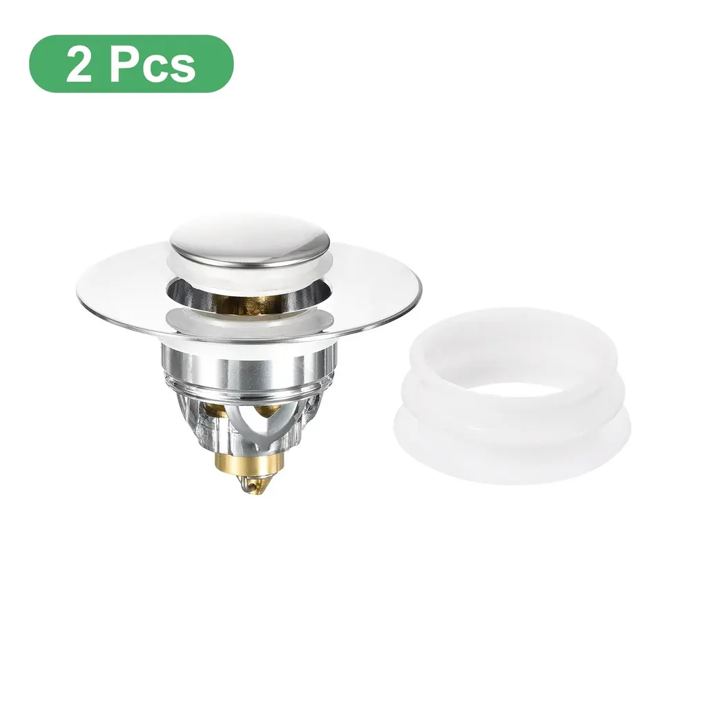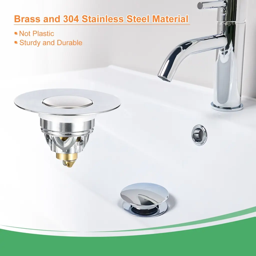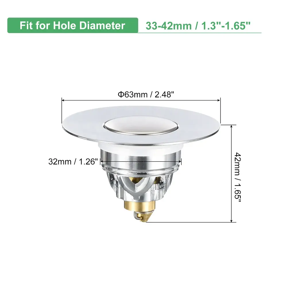Material: This drain plug is made of durable stainless steel and brass, which is strong and durable and can be used for a long time without worrying about rust, cracking, corrosion, or leakage, which is a perfect addition to the sink and uses a thickened stepped silicone gasket to prevent sewer odors.Easy to install: Easy to install, no tools required, just remove the old drain pipe and insert the filter core for easy installation, saving labor and time costs. Make sure the gasket is in the correct position to avoid leaks and remove the old sink stopper assembly before installation.Upgraded design: This sink drain filter combines a sink stopper and a sink filter into one. It has good rebound strength and can quickly seal and drain with one click. It can collect hair and prevent drain pipes from being clogged.Universal: This stainless steel sink strainer basket drain features a universal core design, suitable for all types of basin drains.Widely Usage: Our bathroom sink drain plugs are suitable for a variety of applications. It matches most standard bathroom sinks, making it a versatile choice for residential and commercial settings such as lavatory sinks, kitchen sinks, and standard bathroom sinks to prevent items such as jewelry, rings, dirt, and other debris from entering the drain.Specification:Fit for Hole Diameter: 32-42mm / 1.26"-1.65"Total Size: 42x63mm / 1.65"x2.48"(L*Max.OD)Mounting Diameter: 32mm / 1.26"Package Content: 2 x Bathroom Sink
