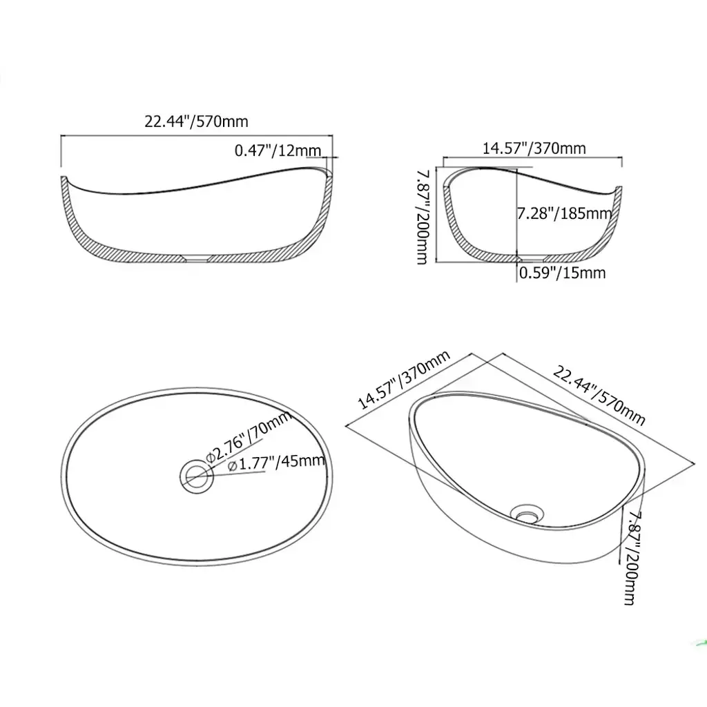 Revamp the aura of your bathroom with this beautiful oval vessel sink. It is an unsymmetrical, oval design with smooth, rounded edgings and linings, which makes an intriguing look. The artistic shape gives an elegant boost and makes a focal point atop your vessel. Stylish and functional, it comes a deep bowl to prevent water from splashing out. Come in glossy white, this beautiful design will increase the level of elegance in hospitality and residential settings. A stunning addition to bathrooms! Sink Dimension: 22.44"L x 14.57"W x 7.87"H (570mmL x 370mmW x 200mmH) Drain Opening: 1.77" (45mm)