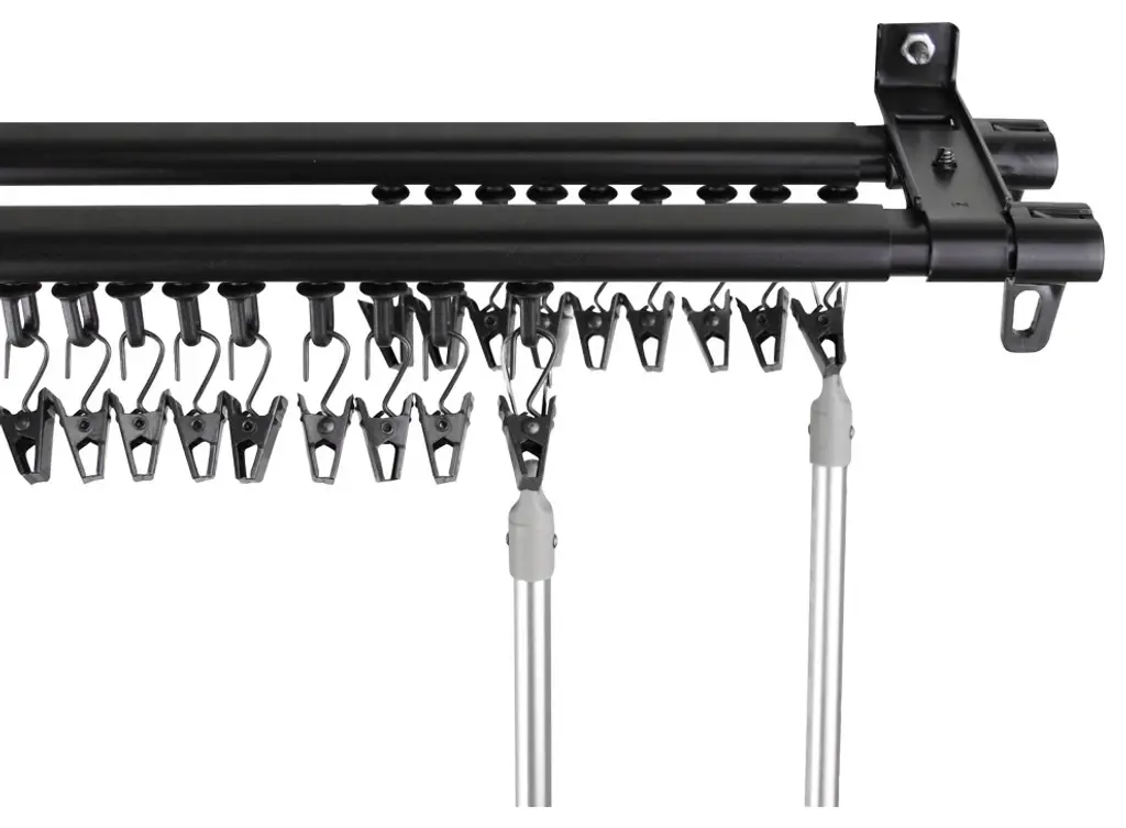 Central Design Products presents the perfect enhancement to your window treatment with high-end quality Baton Draw Adjustable Double Curtain Rods. Effortlessly style your window treatment with these Baton Drawn Adjustable Double Curtain Tracks. Designed to add a modern touch to your windows or sliding patio doors. Includes 1 adjustable curtain track, 2 batons, 60 sliders, 60 hooks with clips, 5 support brackets, and mounting hardware. Projection: .75" back rod, 2.75" front rod Material: Steel Color: Black