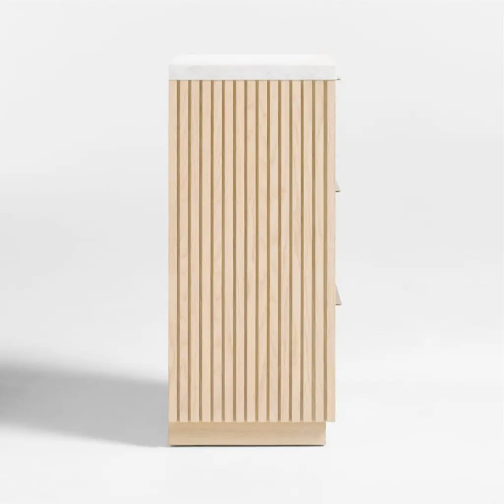 Building upon our popular Batten bath collection, this set of drawers offers the same slatted oak construction in a clean, minimalist design. Topped with a slab of gorgeous white marble, the cabinet stacks three roomy drawers and has a recessed plinth base. Slim horizontal pulls provide a warm accent in burnished brass.