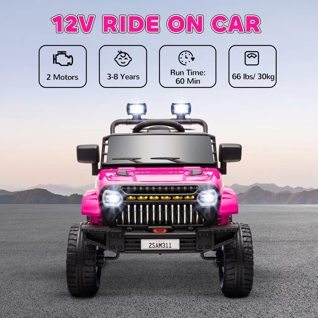 Overview: The 12V Ride-On Truck for Kids is the perfect combination of adventure, safety, and fun. Ideal for children aged 3-6, this electric UTV features a powerful dual motor system, allowing for a smooth and exciting ride. Equipped with spring suspension on all four wheels, this car glides effortlessly over various terrains like concrete, dirt, and gravel. The adjustable speed options (1.9 to 3.1 mph) give parents control, and the included remote lets you safely supervise your child's driving experience. Fun interactive features, including a horn, music, and LED headlights, complete the adventure. Key Features: Why This Ride-On Truck is Perfect for Your Child: The 12V Ride-On Truck offers a thrilling experience for young drivers. With its dual motor power, smooth suspension system, and versatile speed options, it's built to handle various surfaces and provide a safe, fun adventure. The remote control, music system, horn, and LED lights make the experience even more exciting. Perfect for children learning to drive, this ride-on UTV helps them build confidence and motor skills while having a blast outdoors.