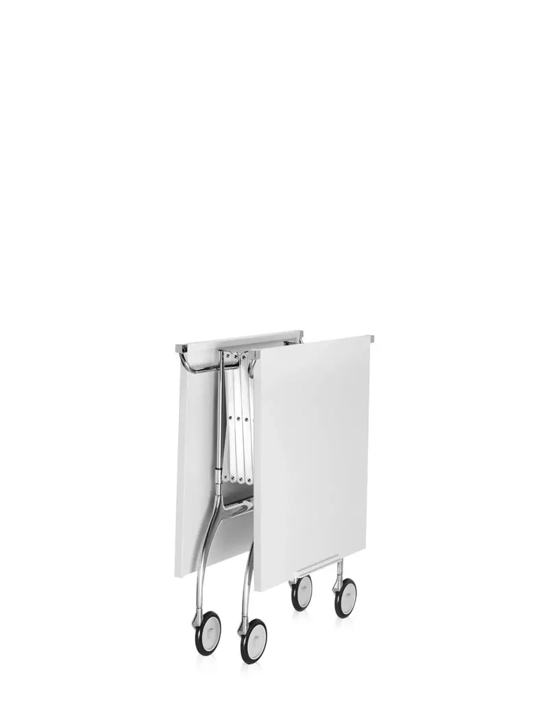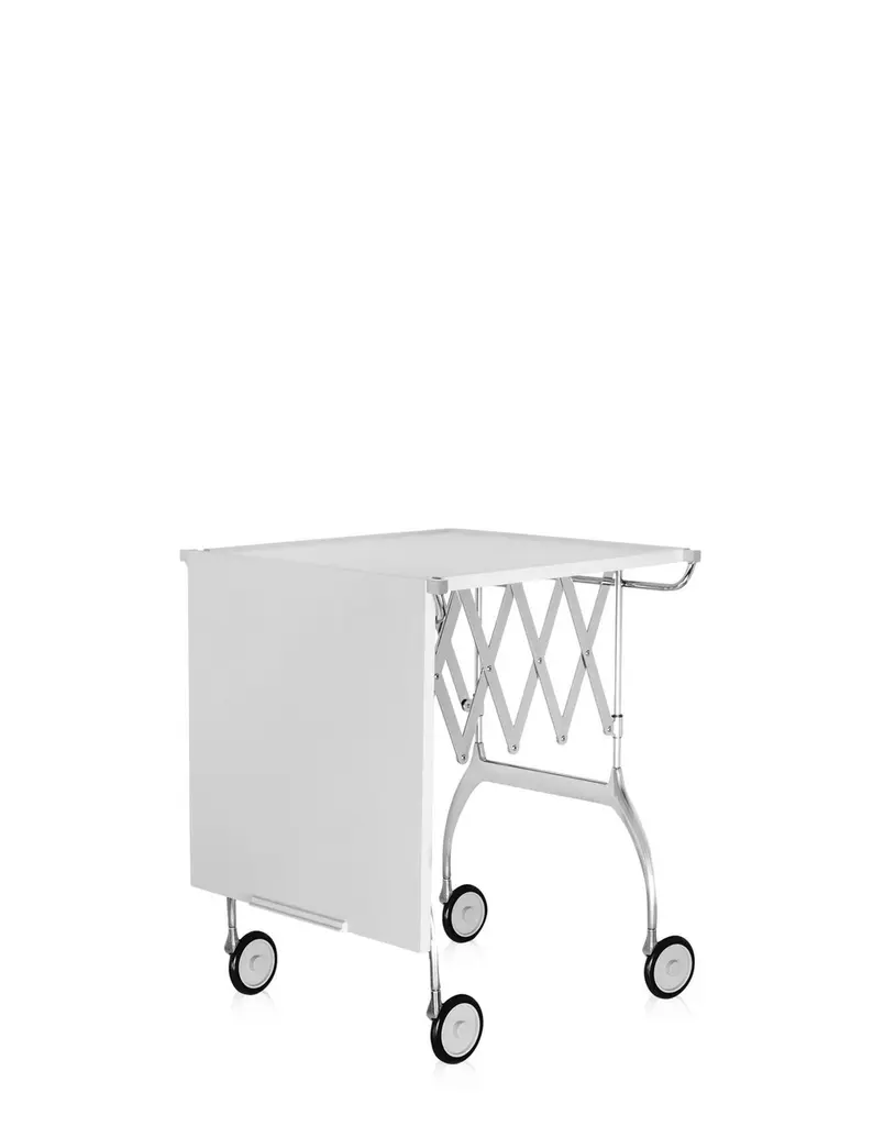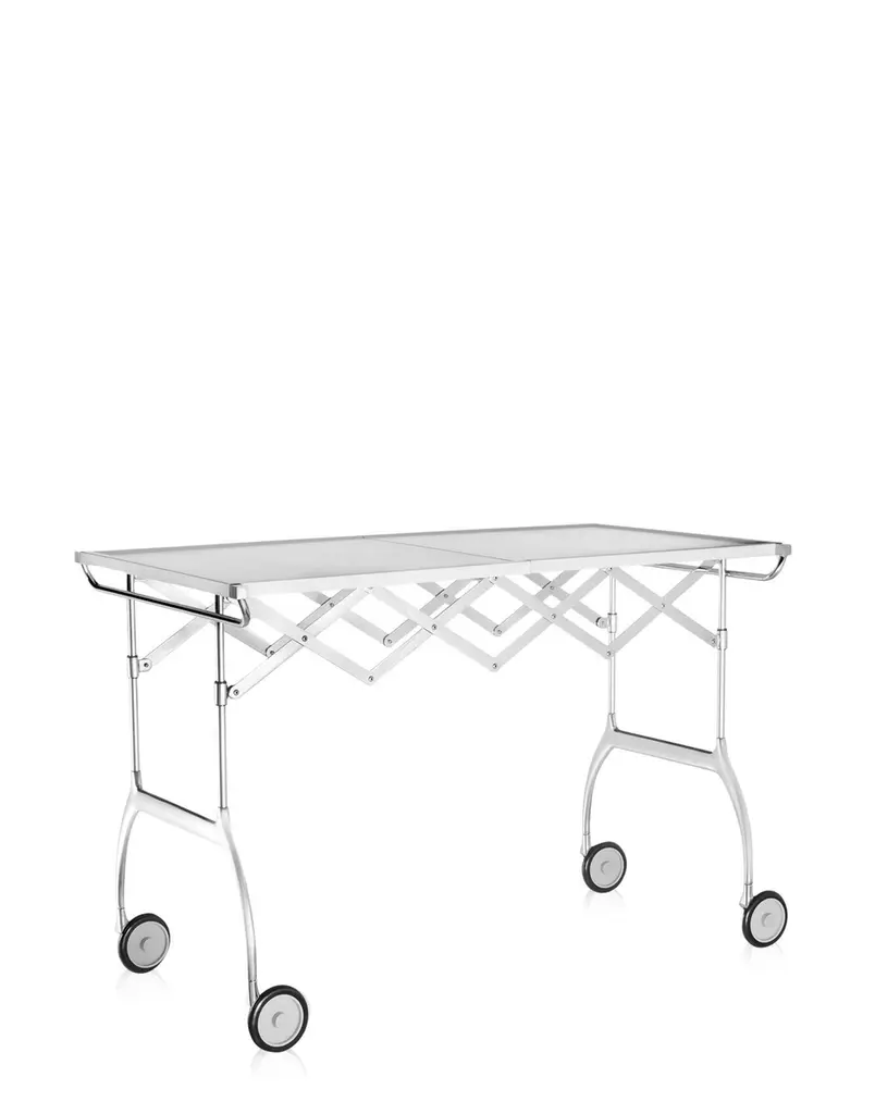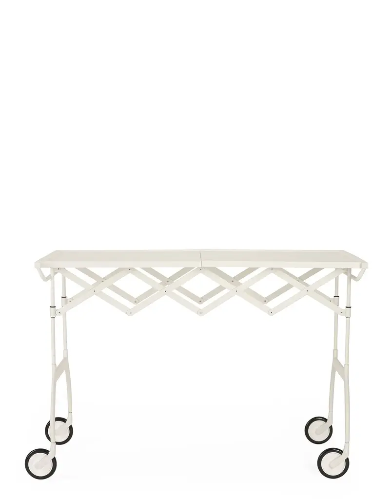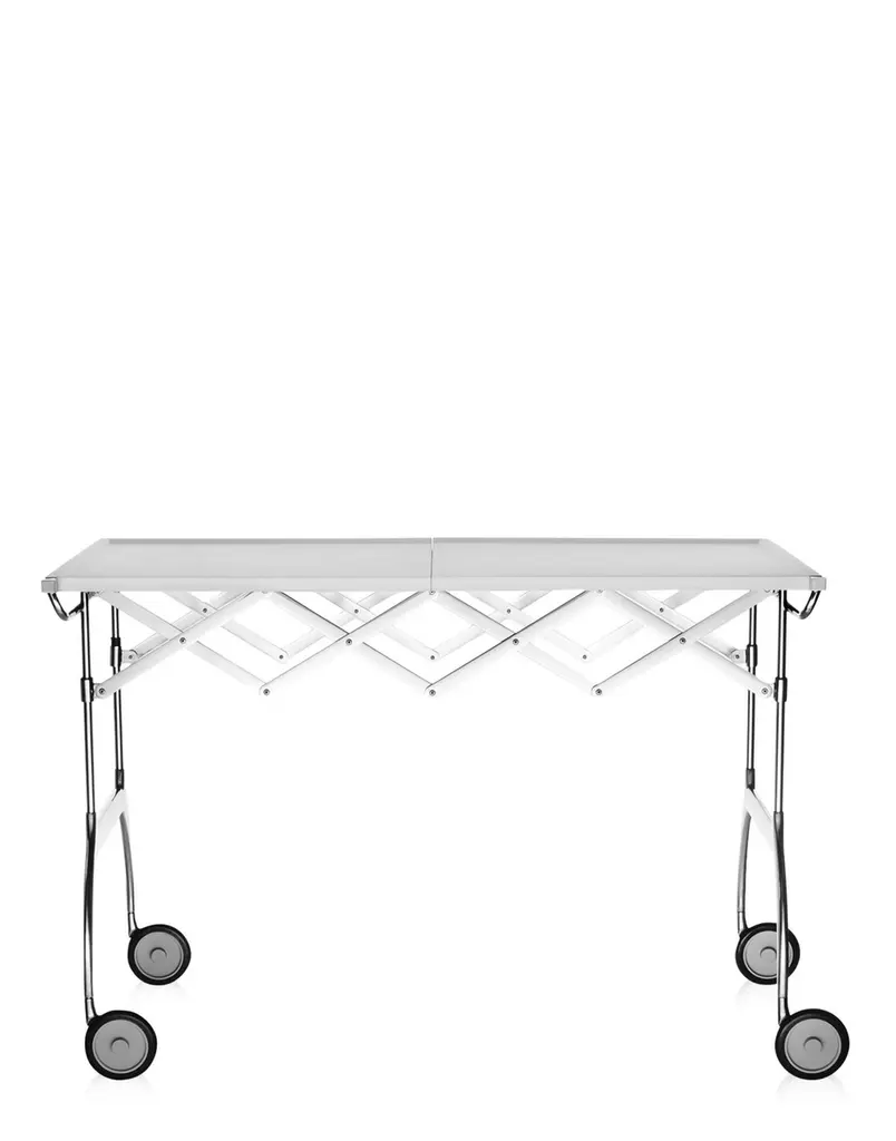 Besides being a practical trolley characterised by the successful combination of plastic and metal materials, Battista is proposed as an extensible and folding table, ideal for buffets and cocktails or for use as an occasional table.