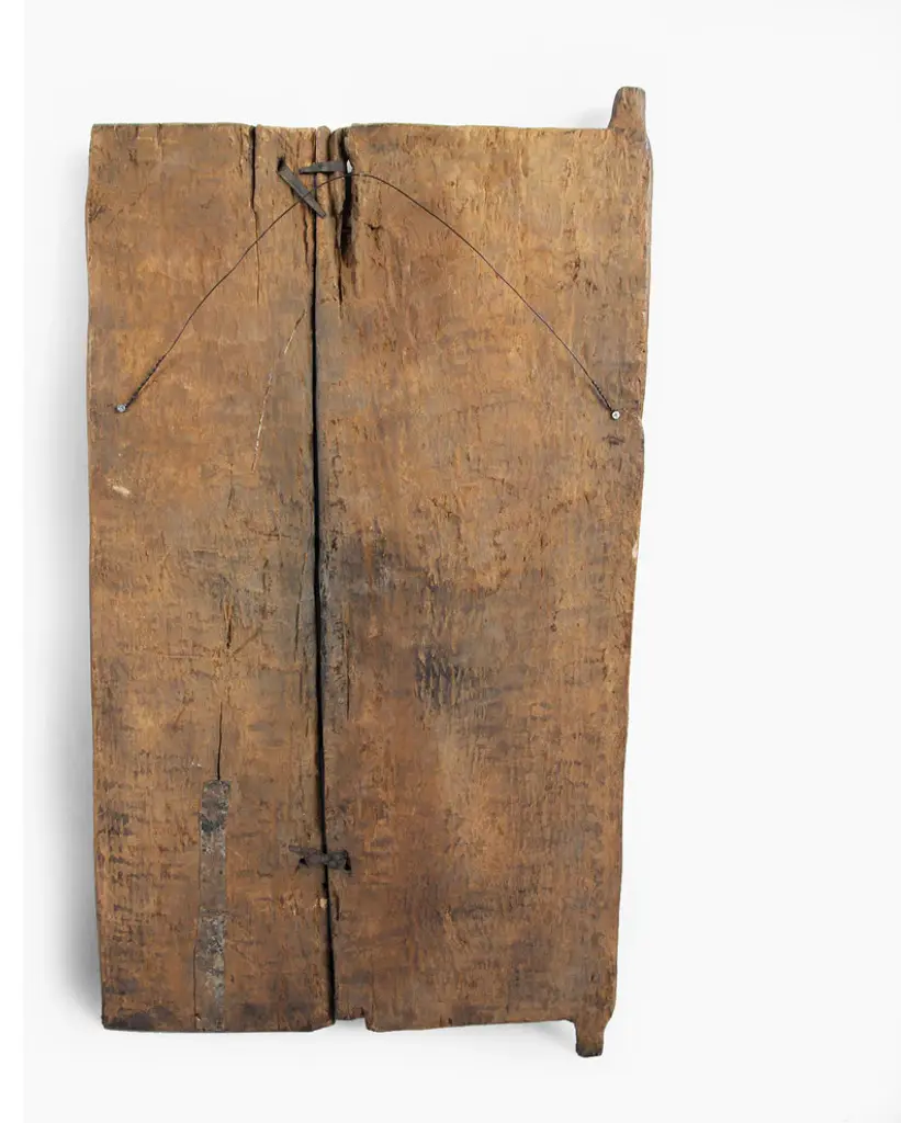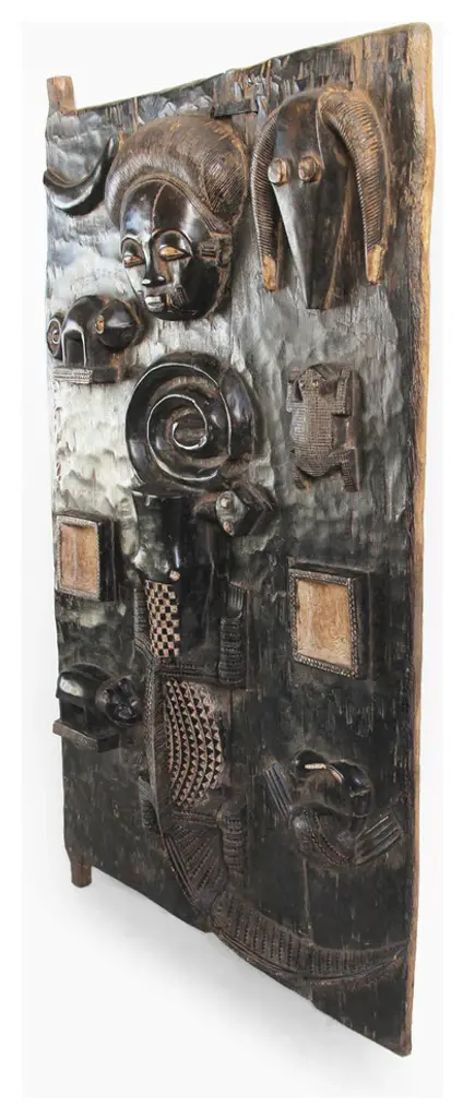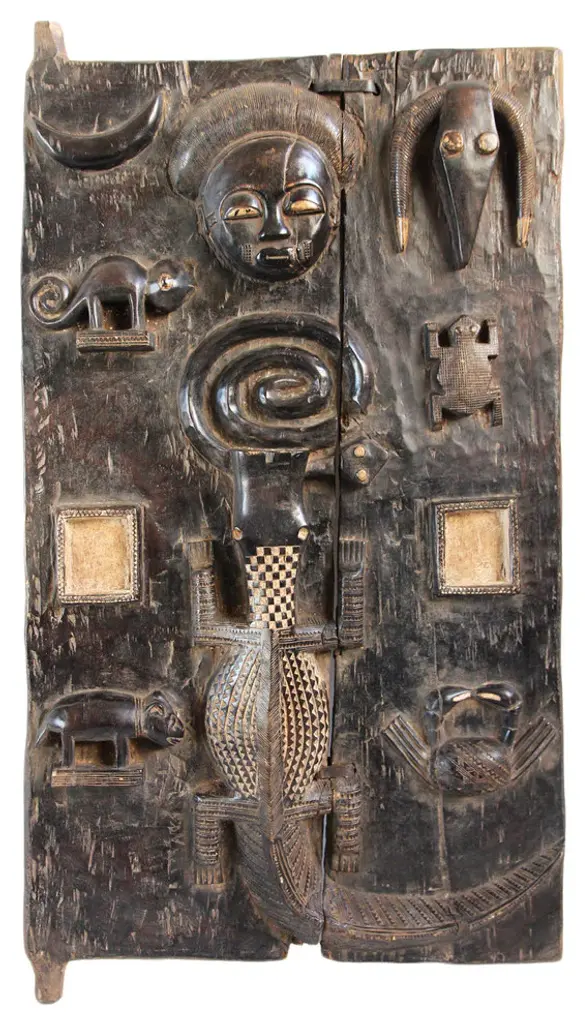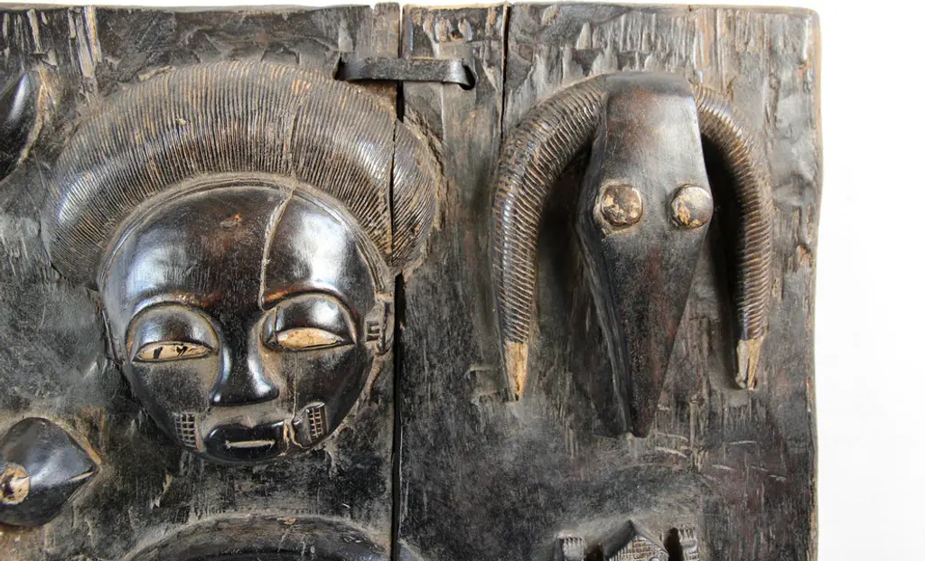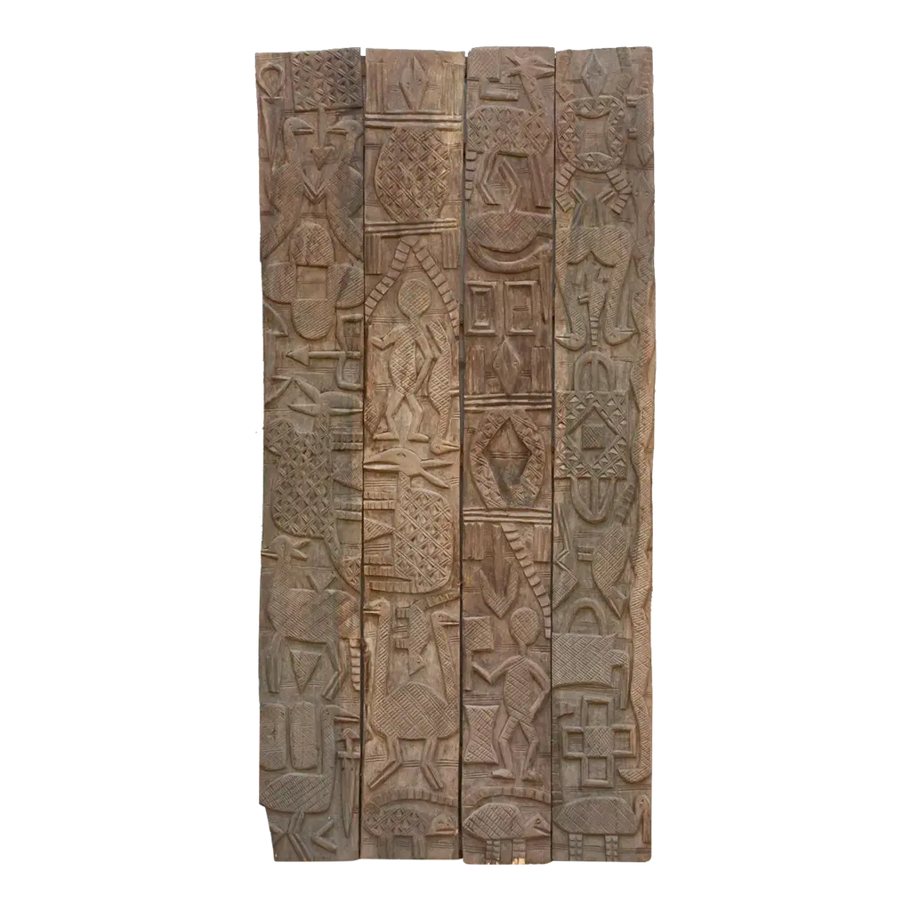 Original Baule grain door panel. This beautiful unique piece features traditional fine carved symbolic images of a portrait, ram, snake, chameleon, crocodile, crab, and dog. Circa 1940-1960. This item is non-returnable - all sales are final.