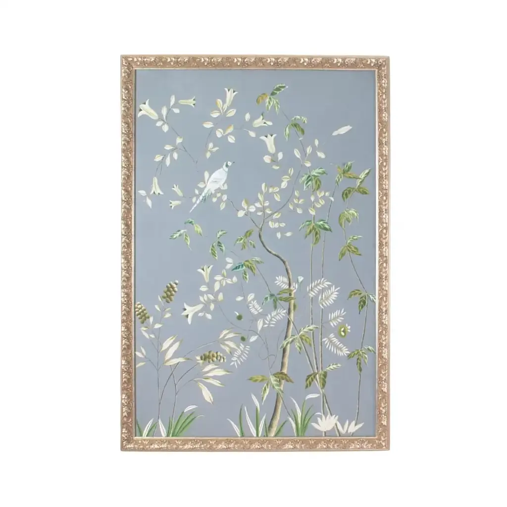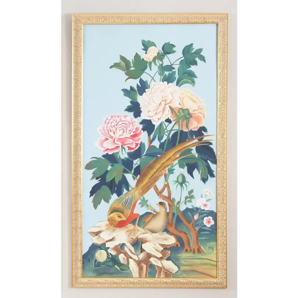 Painted on silk and displayed in a golden wood frame, this piece enriches any space with a classic elegance and sense of enchantment. Arrives ready to hang.
