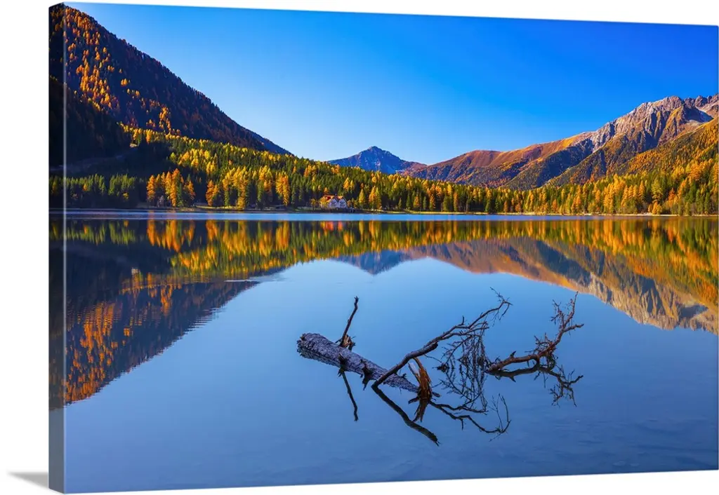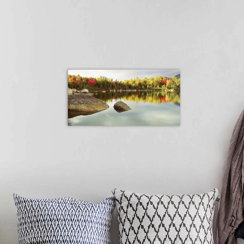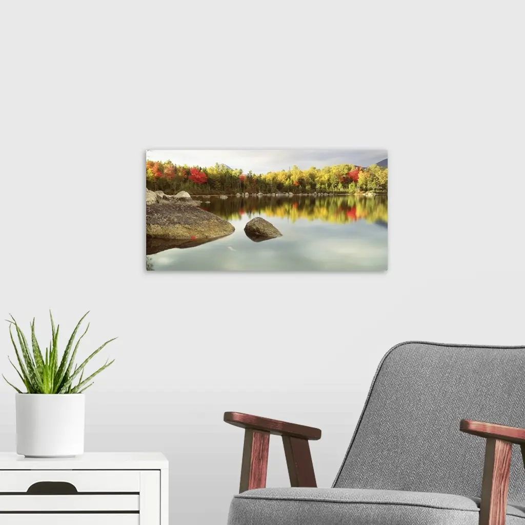 Landscape photograph of a calm body of water with large rocks breaking through the surface around the edges, on the horizon is a tree line with fall colored foliage that reflects in the water.