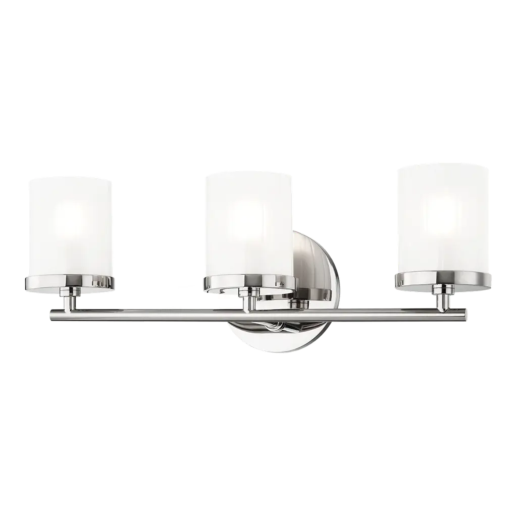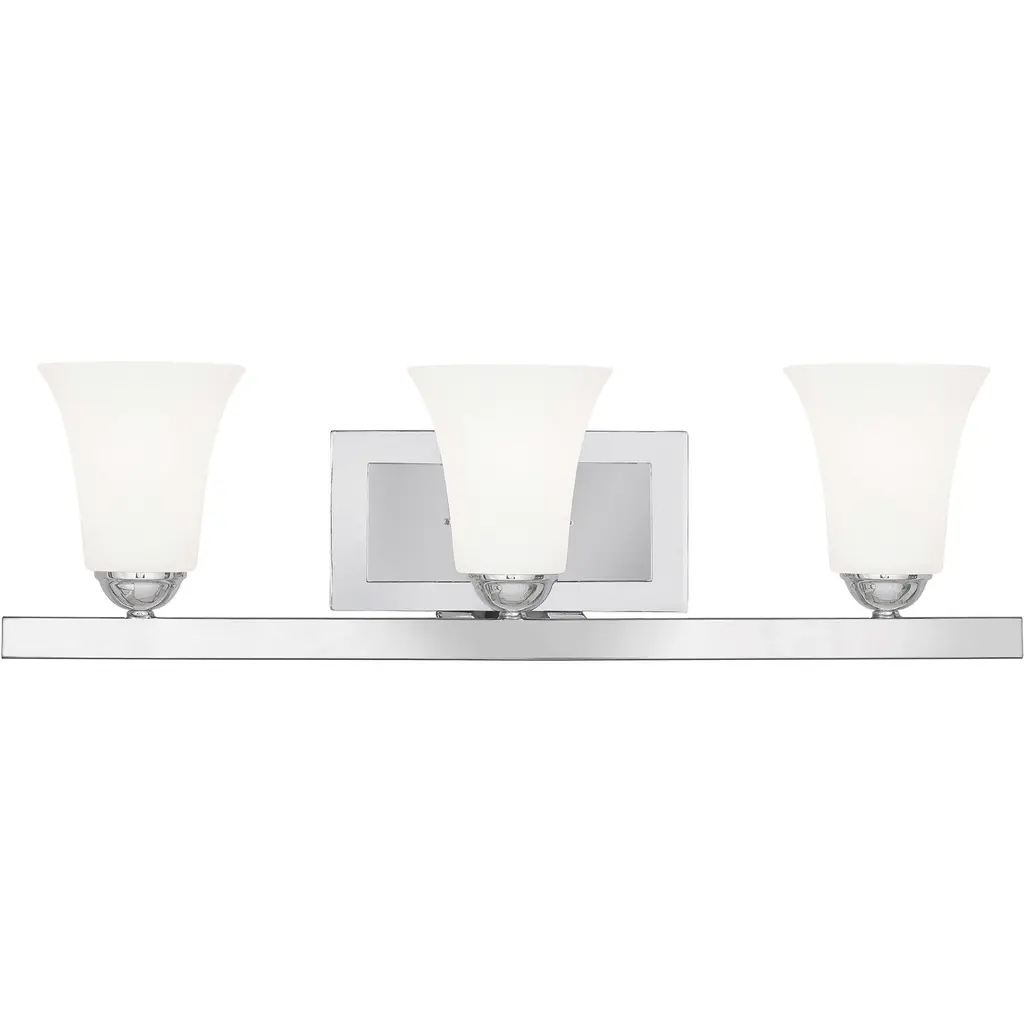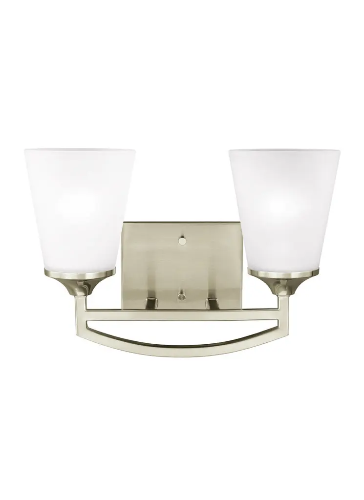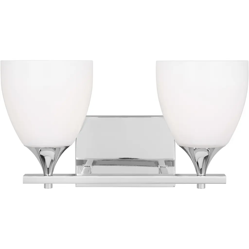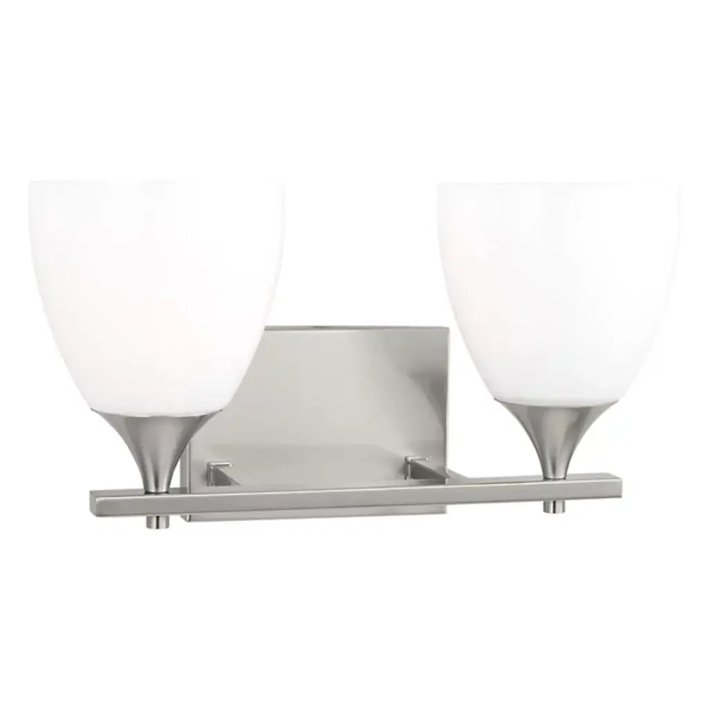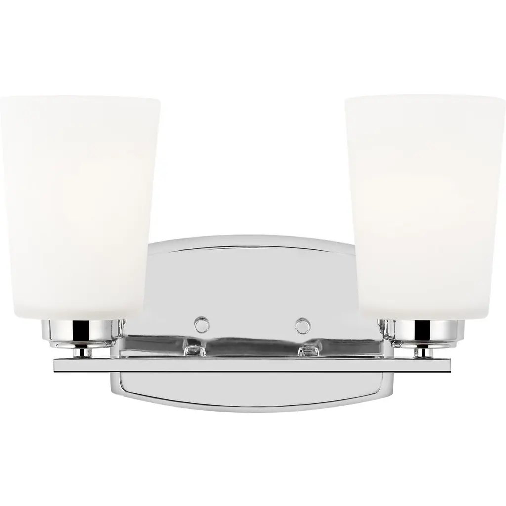 The Generation Lighting Lighting Bayfield two light vanity fixture in chrome is an ENERGY STAR qualified lighting fixture that uses fluorescent bulbs to save you both time and money. The Bayfield bath collection by Generation Lighting Lighting delivers simplicity with flair. The transitional design is a subtle combination of clean lines and flared, angular Satin Etched glass shades to bring style and warmth to the bathroom no matter the budget. Offered in Chrome, Burnt Sienna and Brushed Nickel finishes, the bath lighting collection offers one-light, two-light, three-light and four-light vanity fixtures. Both incandescent lamping and ENERGY STAR-qualified LED lamping are available; all fixtures are California Title 24 compliant.Lighting Information:Bulb type: 2 A19 Medium 9.3 watt light bulbsNumber of bulbs: 2Bulb(s) includedcETL Listed