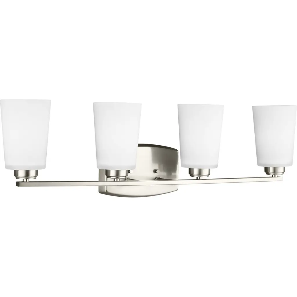 The Generation Lighting Lighting Bayfield four light vanity fixture in chrome is an ENERGY STAR qualified lighting fixture that uses fluorescent bulbs to save you both time and money. The Bayfield bath collection by Generation Lighting Lighting delivers simplicity with flair. The transitional design is a subtle combination of clean lines and flared, angular Satin Etched glass shades to bring style and warmth to the bathroom no matter the budget. Offered in Chrome, Burnt Sienna and Brushed Nickel finishes, the bath lighting collection offers one-light, two-light, three-light and four-light vanity fixtures. Both incandescent lamping and ENERGY STAR-qualified LED lamping are available; all fixtures are California Title 24 compliant.Lighting Information:Bulb type: 4 A19 Medium 9.3 watt light bulbsNumber of bulbs: 4Bulb(s) includedcETL Listed